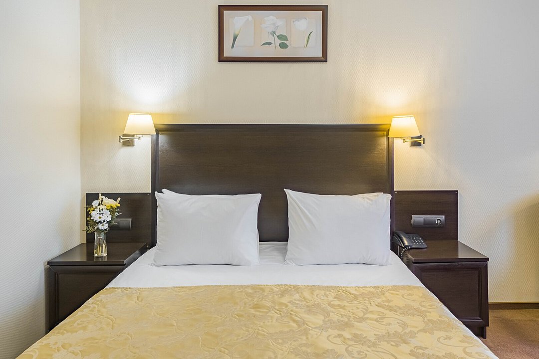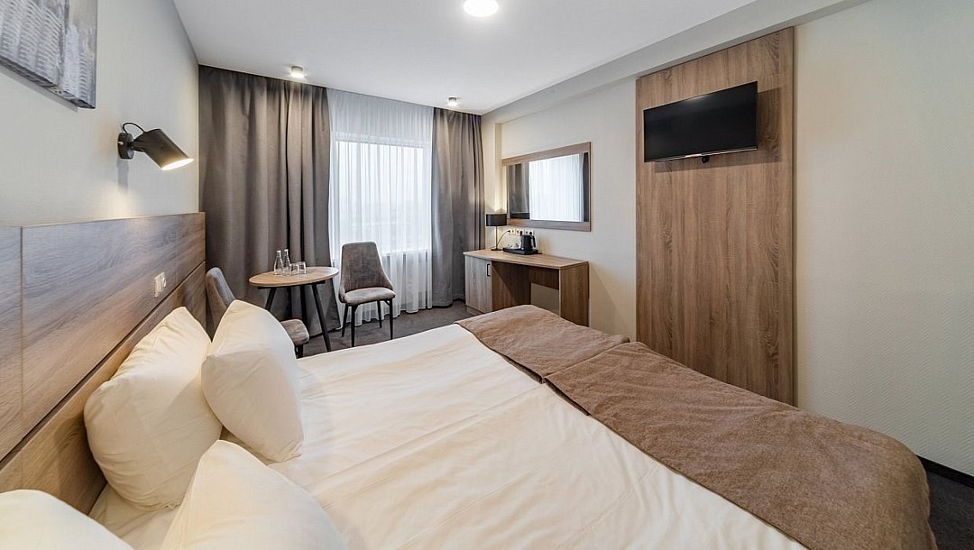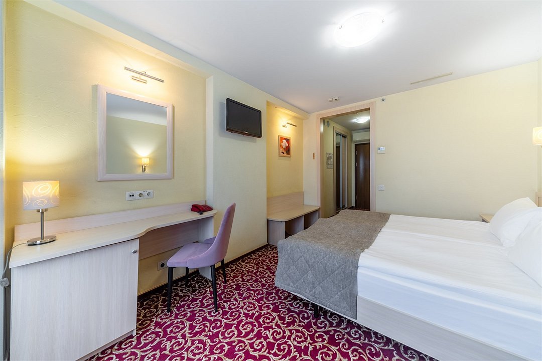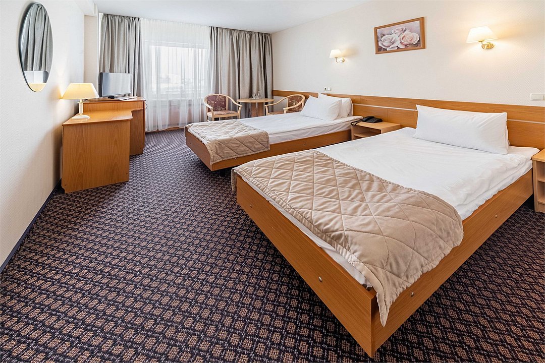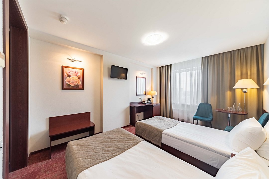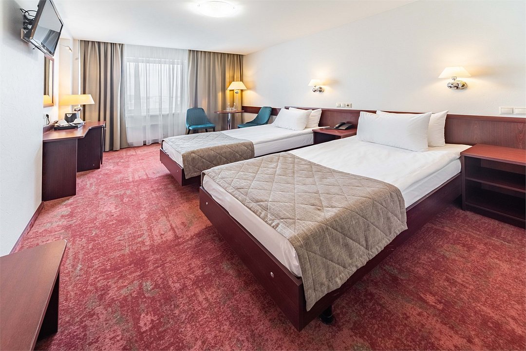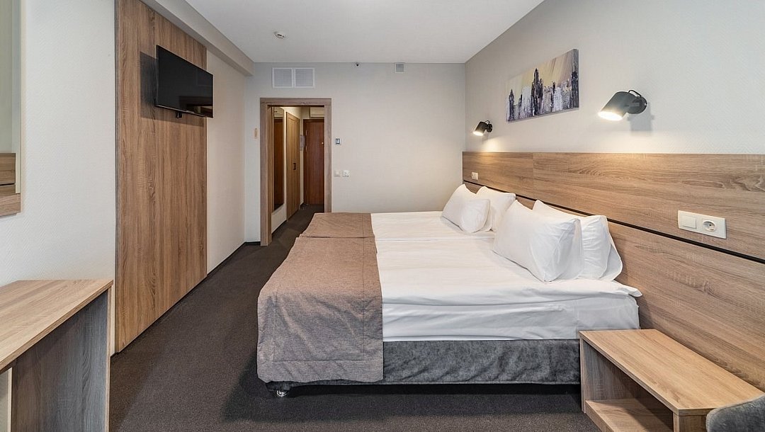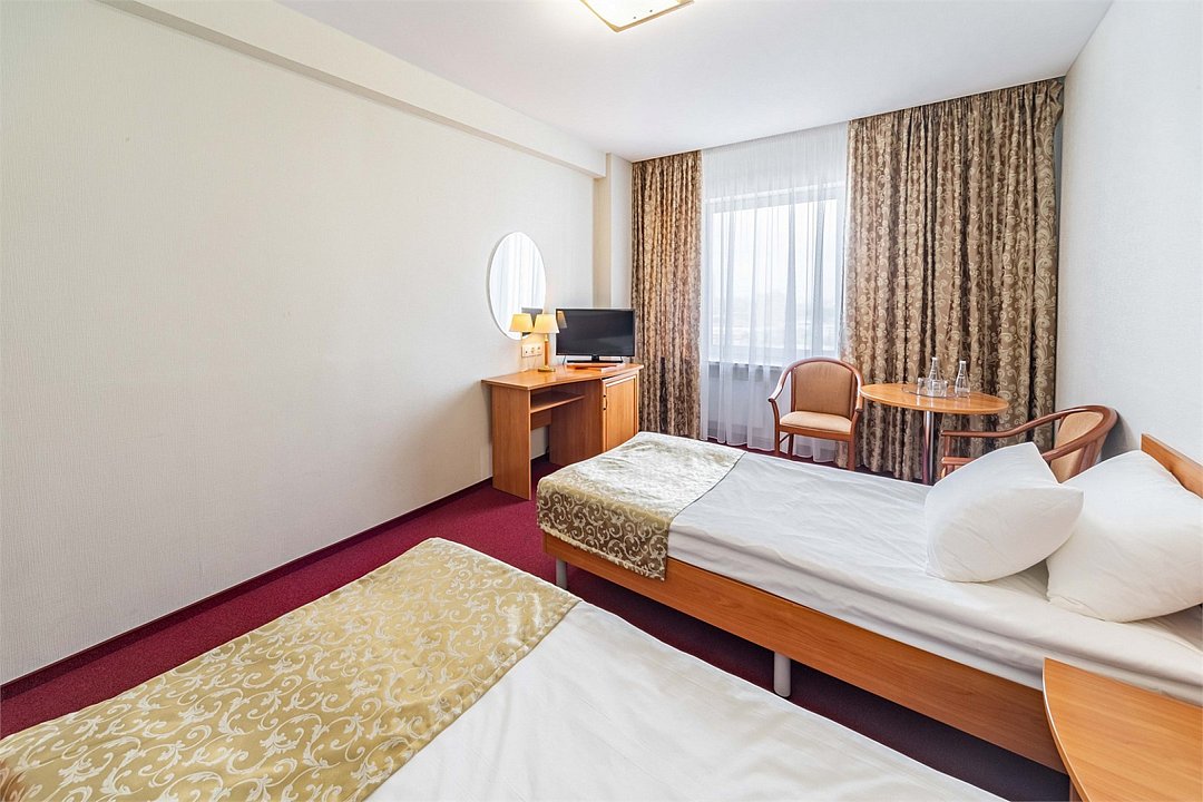 Стандарт плюс - просторный и уютный номер с двумя раздельными кроватями. В номере имеется рабочий стол, телефон, телевизор, сейф, холодильник, чайная станция, просторная ванная комната со всеми необходимыми косметическими принадлежностями. Wi-Fi доступ. Питьевая бутилированная вода в номере при заезде. Общая площадь номера составляет 22 кв. м. Период работы кондиционеров: с мая по сентябрь.Услуги и удобства