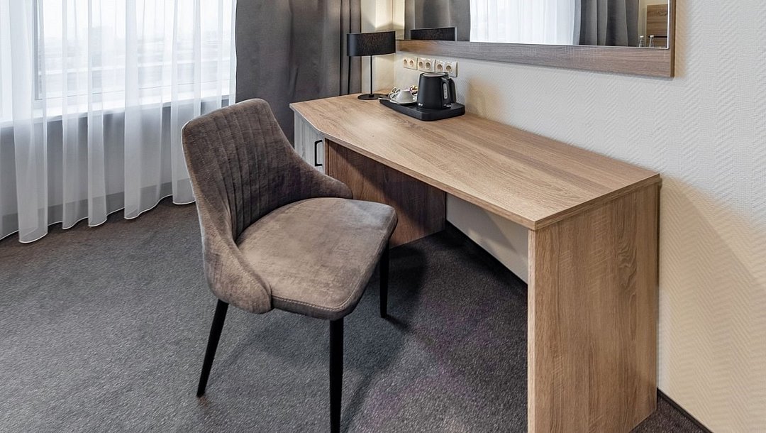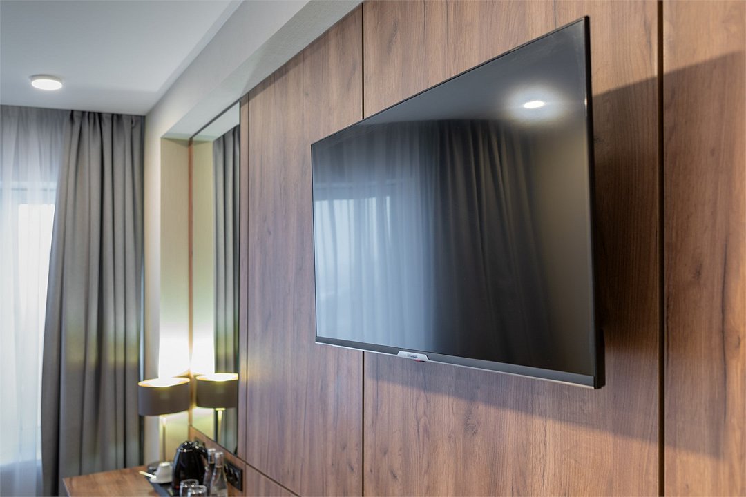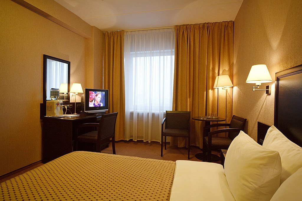 телевизор, Wi-Fi, телефон, холодильник, фен, обогреватель, ванная комната, ванна или душевая кабина, банные полотенца, гигиенические средства, две полутораспальные кровати, шкаф для одежды, вешалки, журнальный столик, багажная тумба, зеркало, обслуживание номеров, информационная карта, меню, унитаз, раковина, ковровое покрытие, вид на город, кулер на этаже, креслоВ гостиничном номере