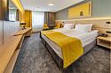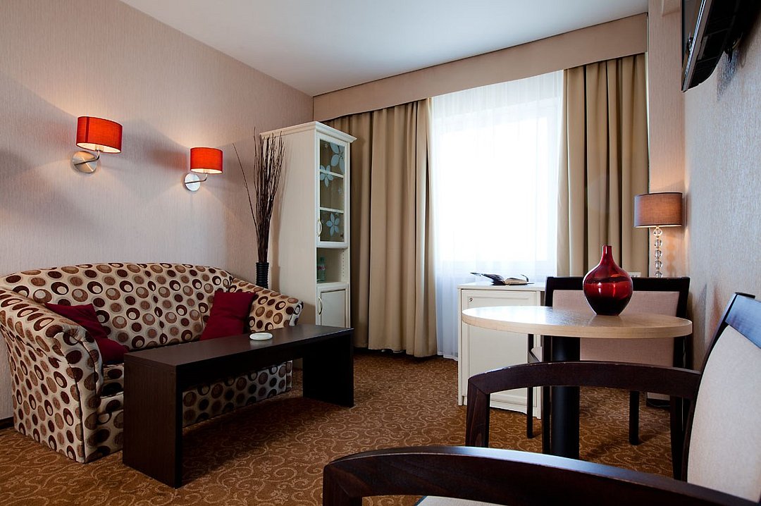 Гости могут выбрать номера стандарт или люкс, все они оснащены современной бытовой техникой, мини-баром и кроватями на 1 или 2 человек. Питание в проживание не входит, кушать можно по меню в ресторане отеля, посещать лобби-бар, пивную и кафетерий. Одновременно в отеле могут проживать более 900 человек.