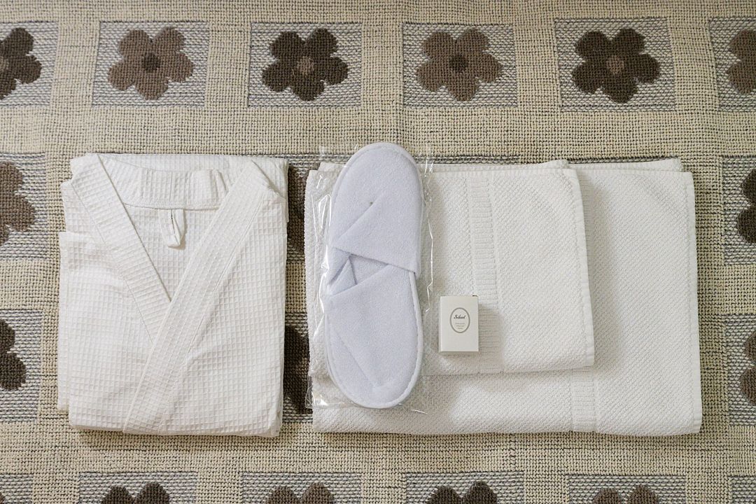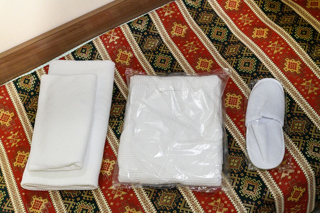 Телевизор, холодильник, сейф, телефон, приветственный набор (чай, кофе, печенье, бутилированная вода). Для всех клиентов халаты и тапочки бесплатно.