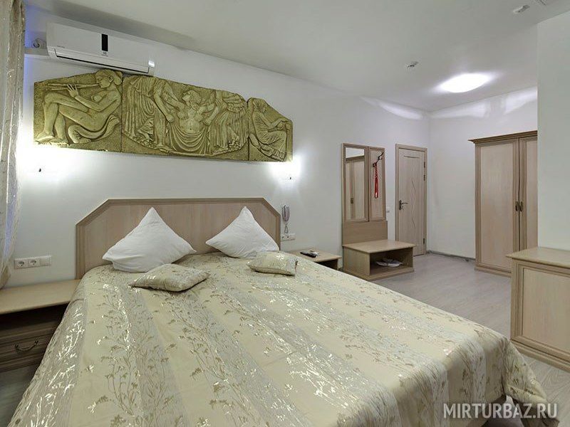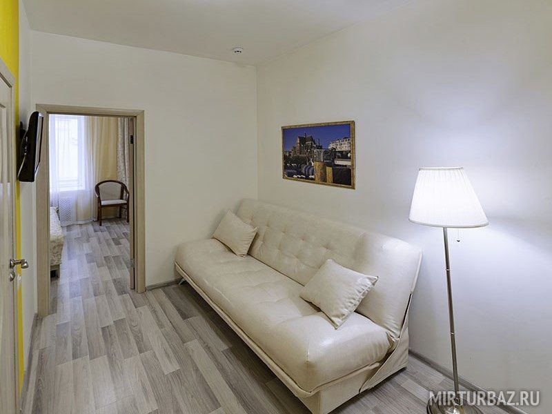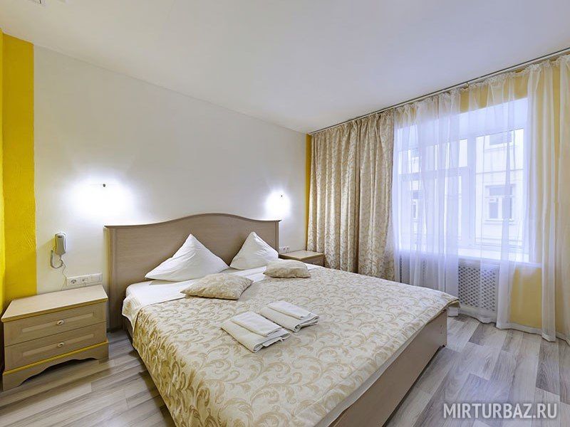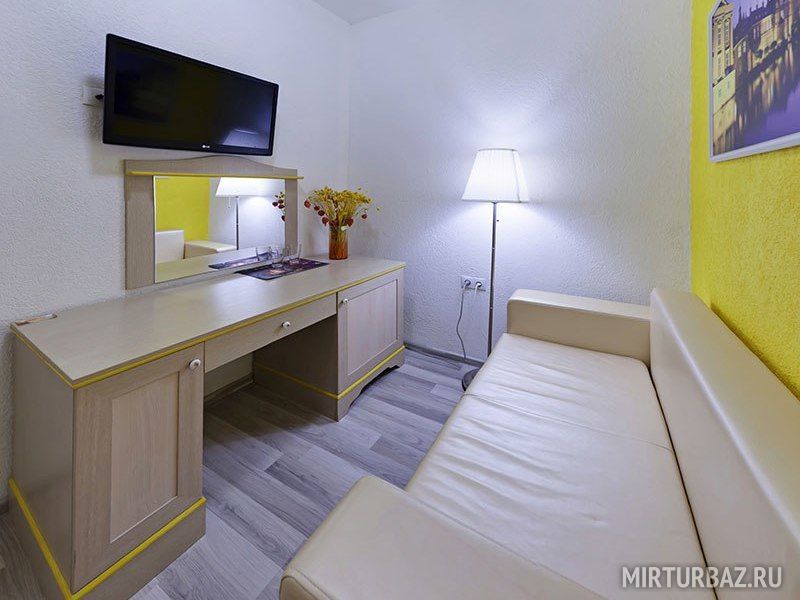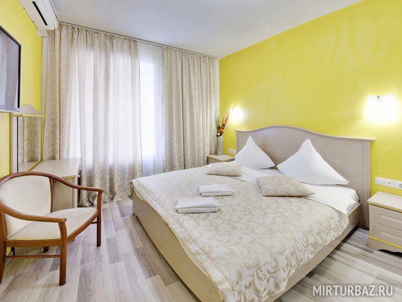 Интерьер номера оформлен в изыскано-желтой цветовой гамме.