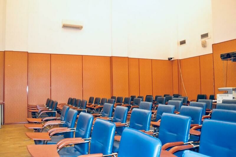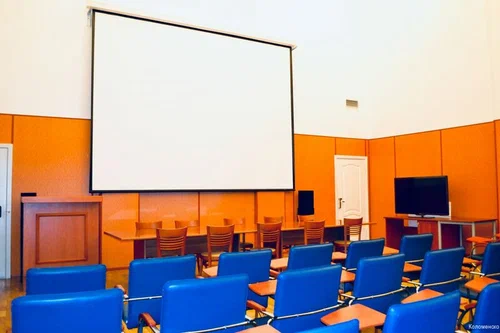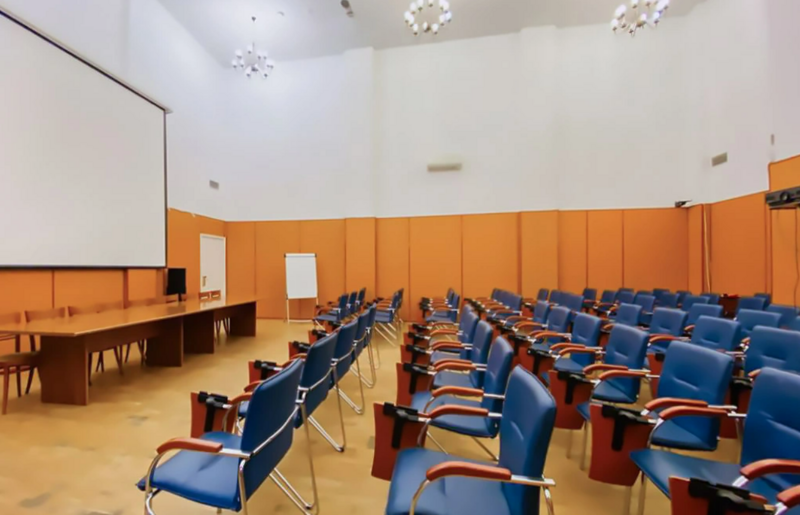 Вы можете арендовать конференц-зал для проведения конференции, презентации, совещания, фуршета и кофе-брейка. Зал оборудован настенным проектором, экраном, DVD проигрывателем, компьютером и акустической системой. Всего в зале 74 посадочных места. У каждого кресла есть удобный откидывающийся столик.