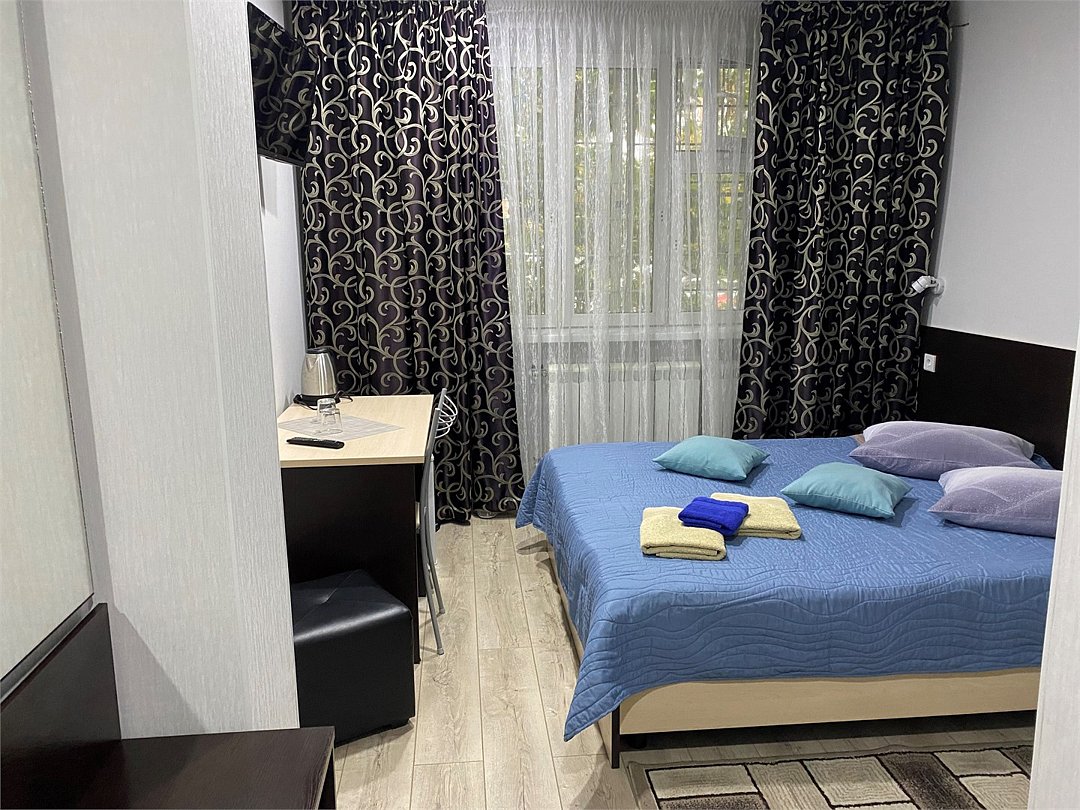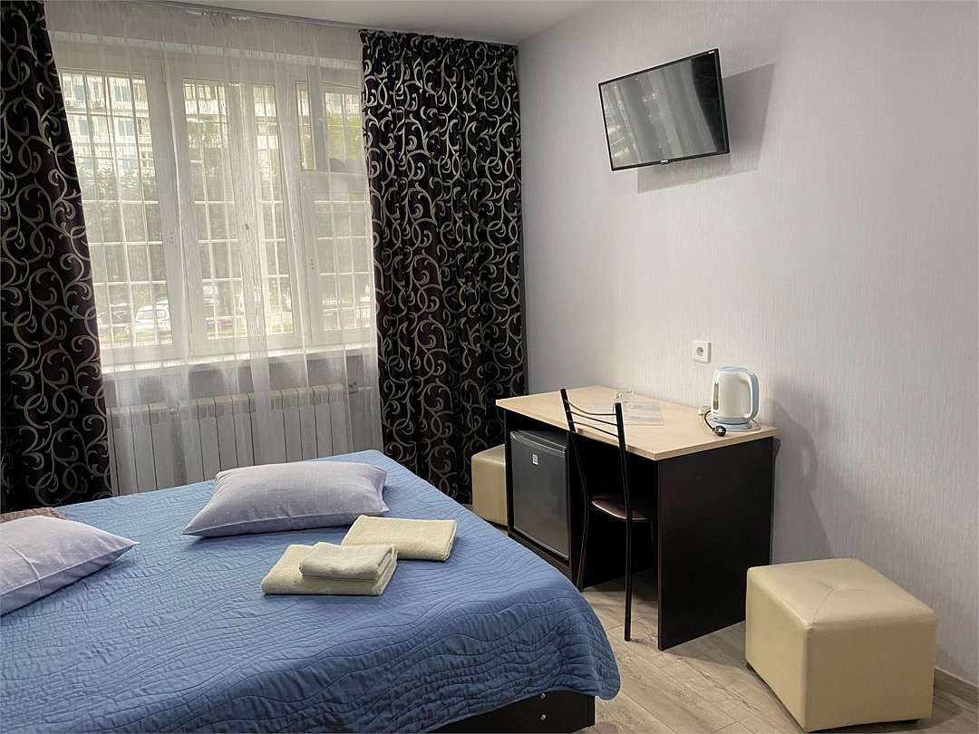 телевизор, Wi-Fi, интернет, светильник, ванная комната, санузел, банные полотенца, тапочки, гигиенические средства, двуспальная кровать, тумбы, стулья, вешалки, багажная тумба, зеркало, ковер, чайный набор, набор посуды, обслуживание номеров, унитаз, отопление, вид во двор, ламинат, стаканы, столовые приборы, стол, туалетные средства, туалет, телевизор с плоским экраном, мини-холодильник, москитная сетка, гостиничная парфюмерия, номер для некурящих, пуфик, рабочий стол, без питомцевВ гостиничном номере