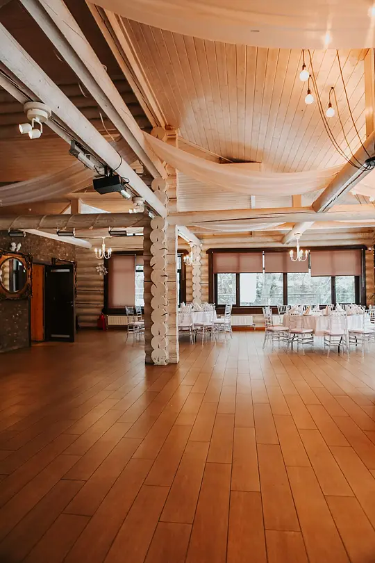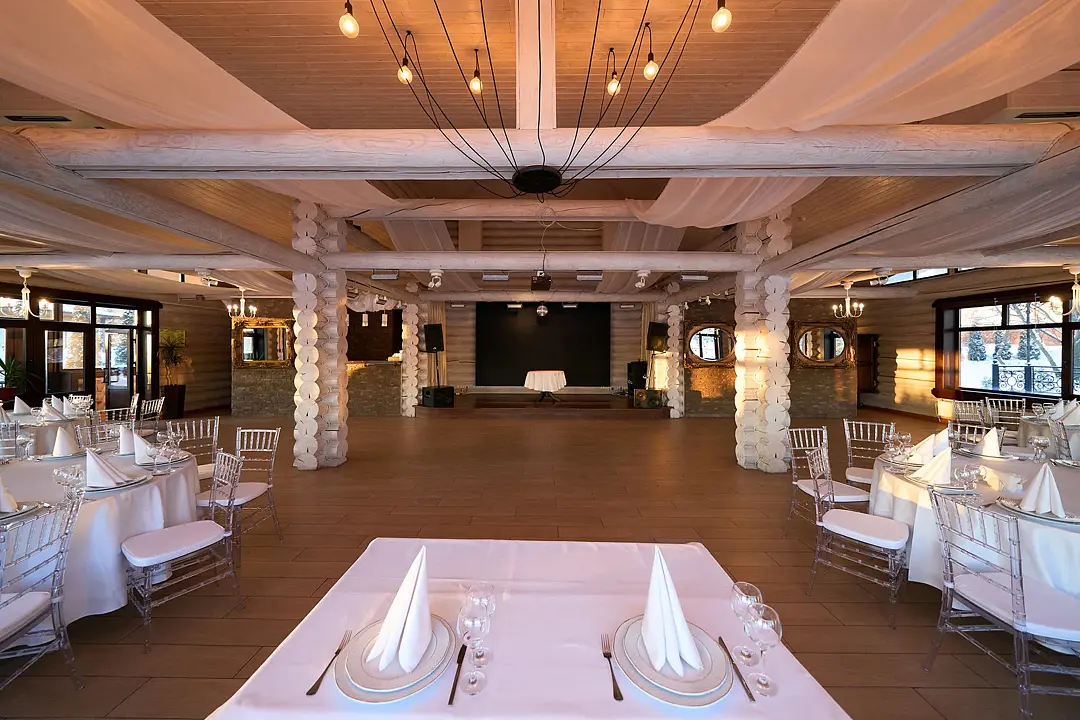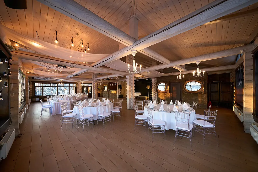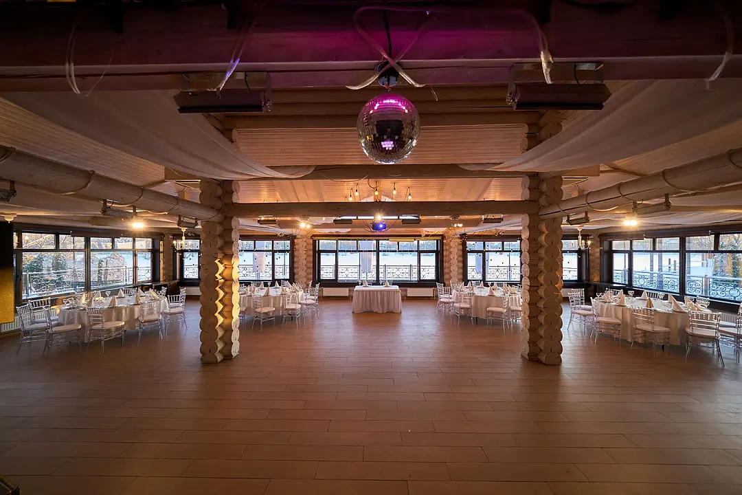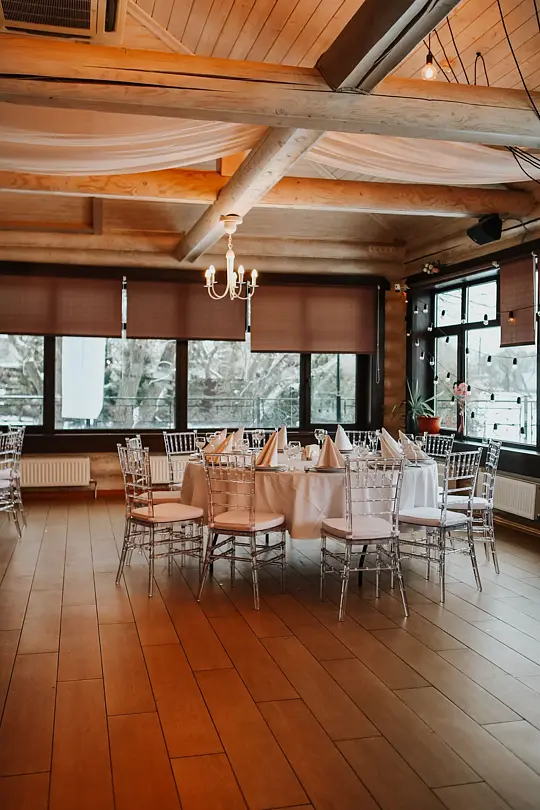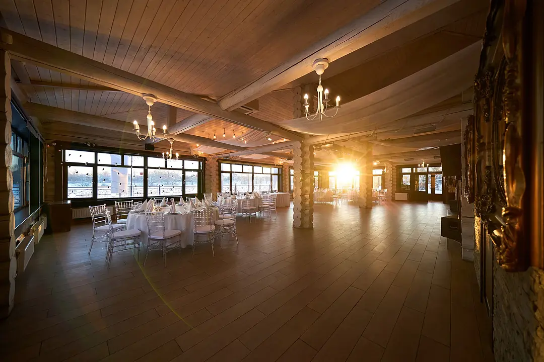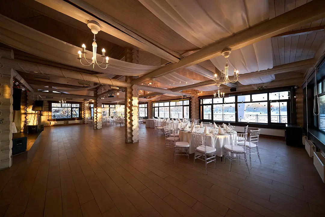 Идеальным местом для торжества от 20 до 80 персон станет банкетный зал у озера. Вы сможете насладиться прекрасным видом на воду и естественным ландшафтом, а также провести время на свежем воздухе.