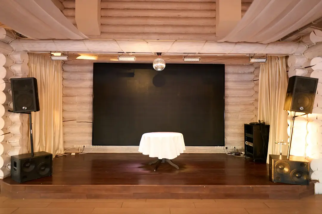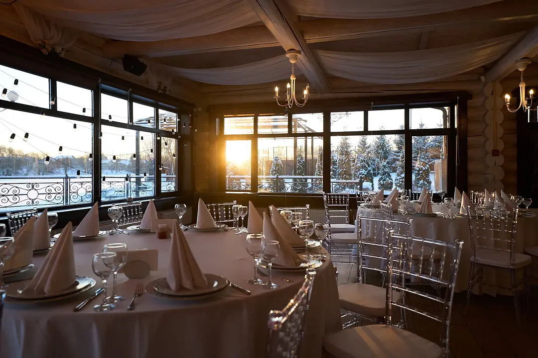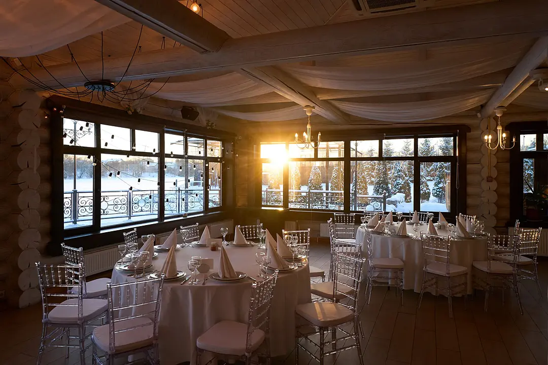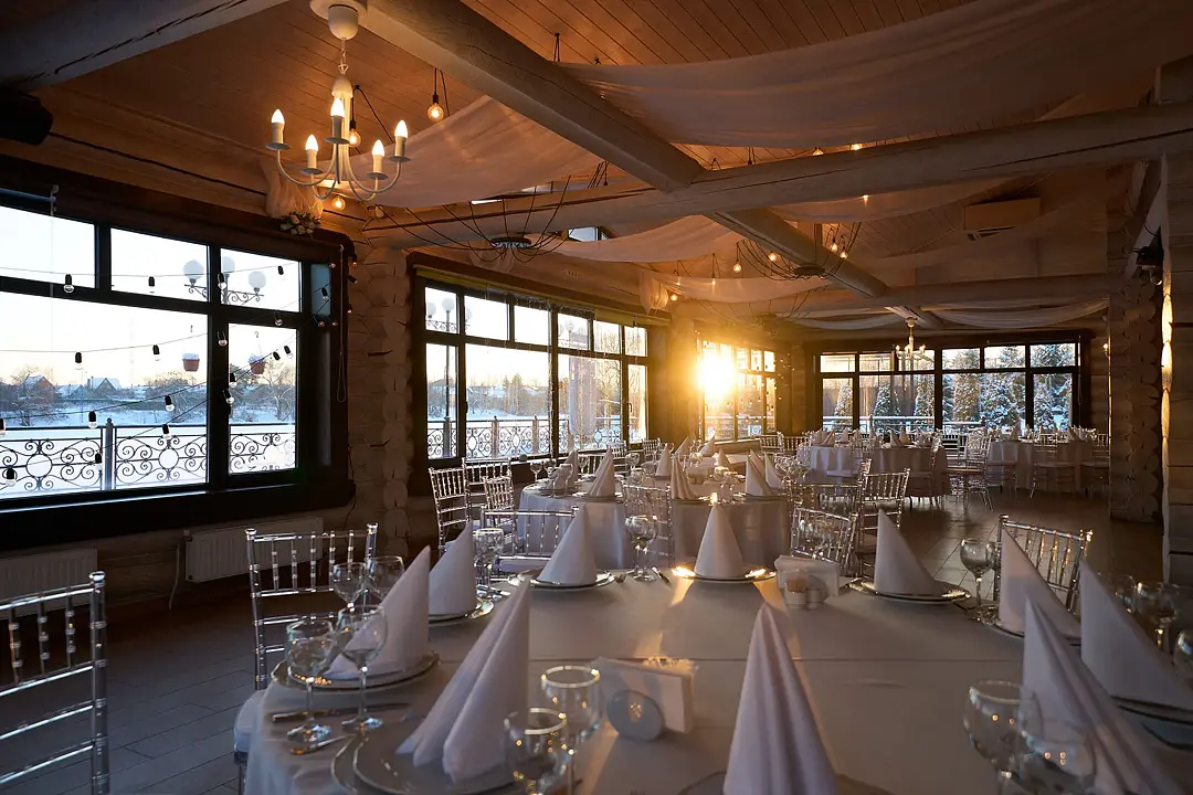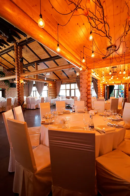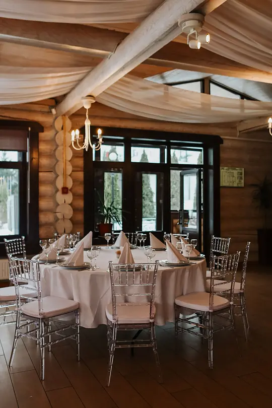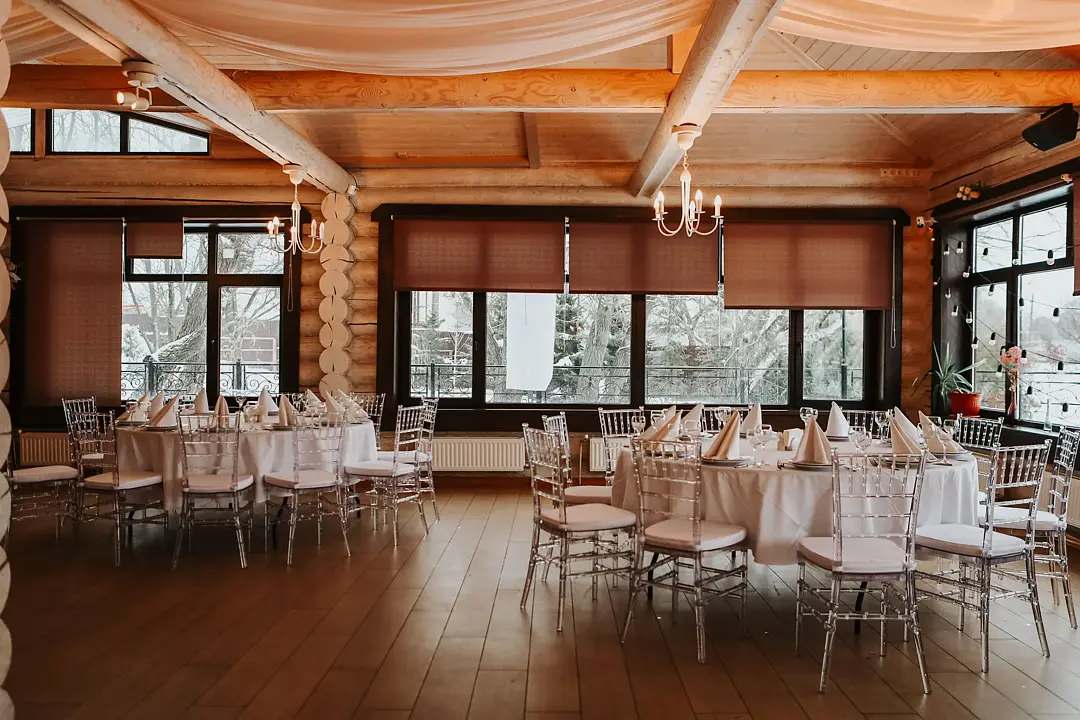 Идеальным местом для торжества от 20 до 80 персон станет банкетный зал у озера. Вы сможете насладиться прекрасным видом на воду и естественным ландшафтом, а также провести время на свежем воздухе.