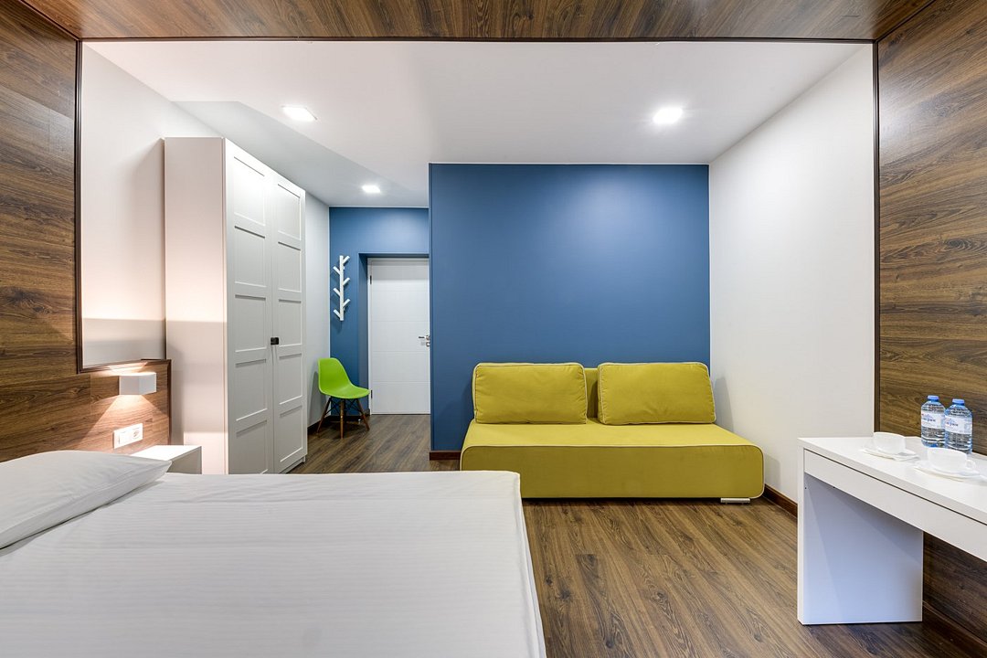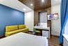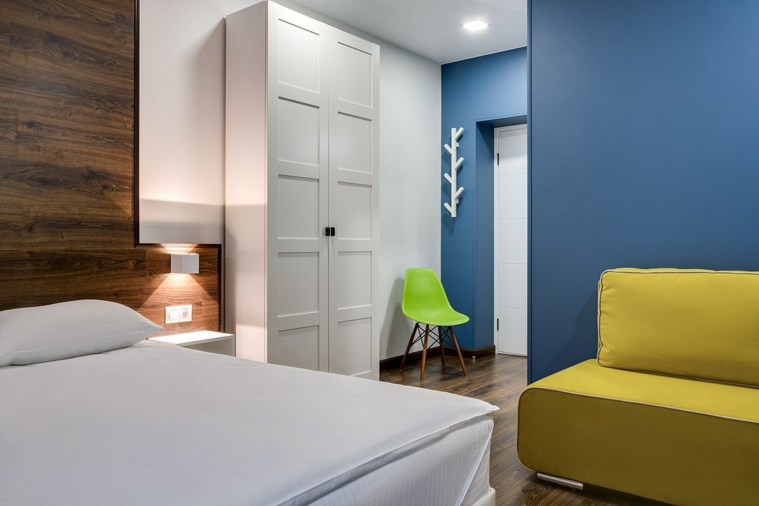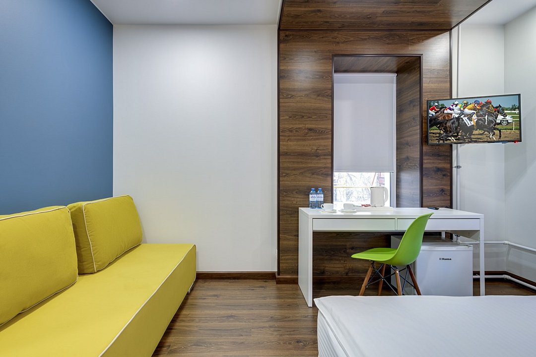 Wi-Fi, кондиционер, фен, утюг, ванная комната, тапочки, гигиенические средства, кровать «King size», стулья, шкаф для одежды, вешалки, письменный стол, зеркало, чайный набор, отопление, вид на город, кулер на этаже, вид во двор, диван-кровать, мини-холодильник, телевизор со Smart TV, уборка номера, бутилированная вода, без питомцевВ номере