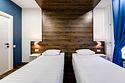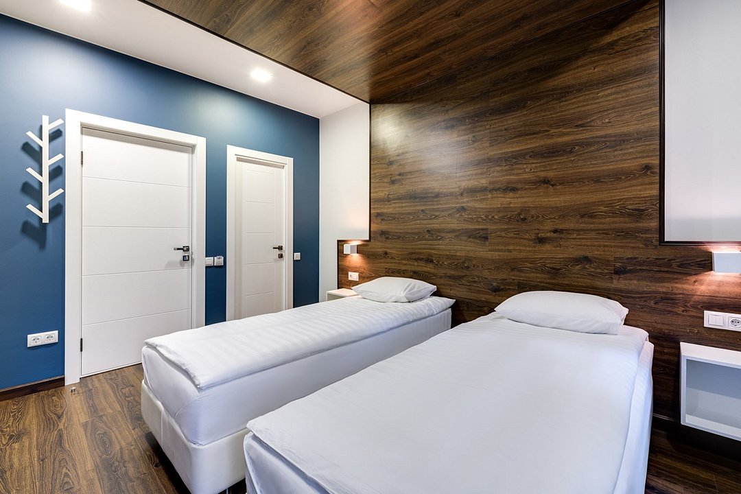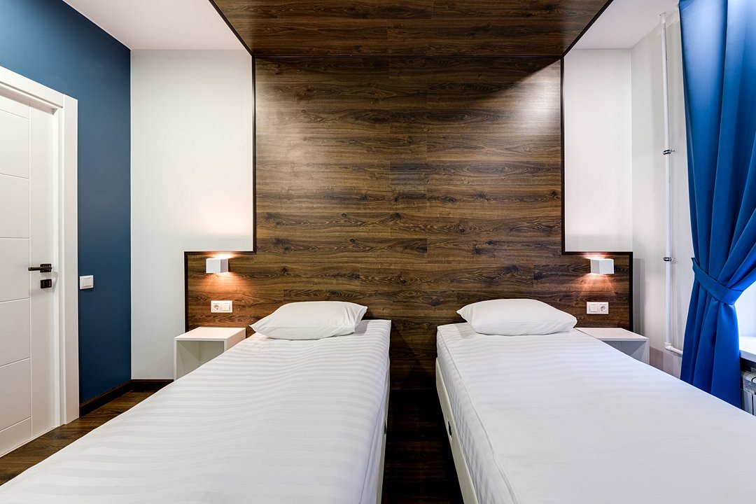 * площадь номера - 14 кв.м. * односпальные кровати 2 шт 90*200 * белоснежное постельное белье и комплекты полотенец * Wi-Fi, телевизор, кондиционер, мини-холодильник, фен * шкаф, стол и стулья * ванная комната с душем * косметические средства и тапочки * халаты - по запросу * вода бутилированная, чай/кофе * ежедневная уборка номера На этаже есть кухня, кулер, гладильная доска, утюг и стиральная машина.Услуги и удобства