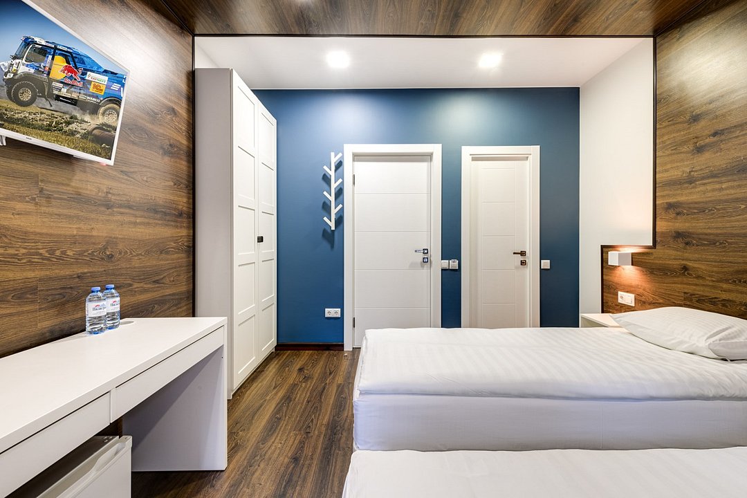 Wi-Fi, кондиционер, фен, утюг, ванная комната, тапочки, гигиенические средства, две односпальные кровати, шкаф для одежды, вешалки, письменный стол, зеркало, чайный набор, отопление, вид на город, кулер на этаже, вид во двор, стул, мини-холодильник, телевизор со Smart TV, уборка номера, бутилированная вода, без питомцевВ номере