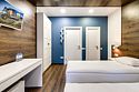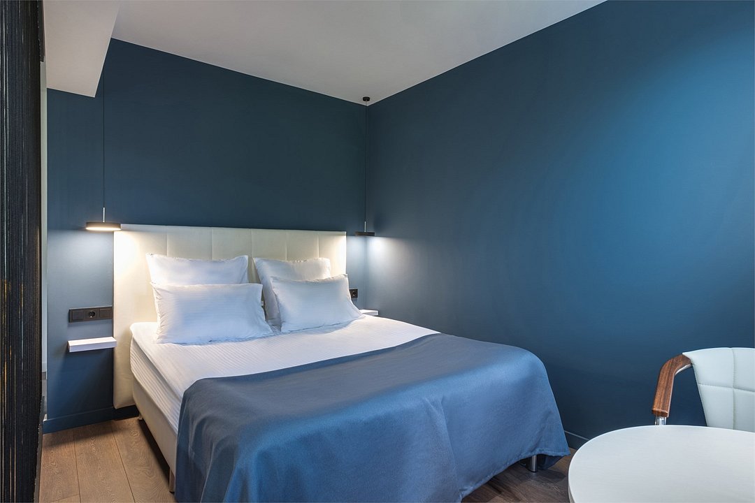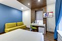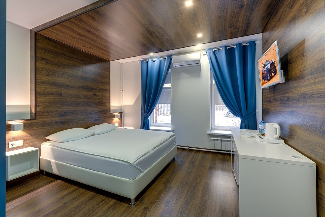 * площадь номера - 14 кв.м. * двуспальная кровать 140*200 * белоснежное постельное белье и комплекты полотенец * Wi-Fi, телевизор, кондиционер, мини-холодильник, фен * шкаф, стол и стулья * ванная комната с душем * косметические средства и тапочки * халаты - по запросу * вода бутилированная, чай/кофе * ежедневная уборка номера На этаже есть кухня, кулер, гладильная доска, утюг и стиральная машина.Услуги и удобства