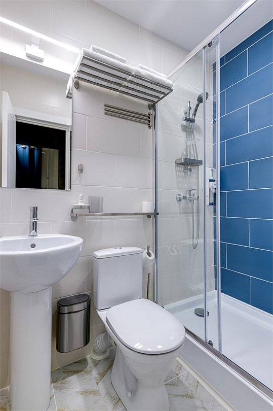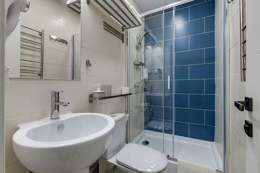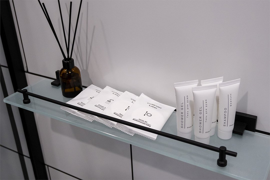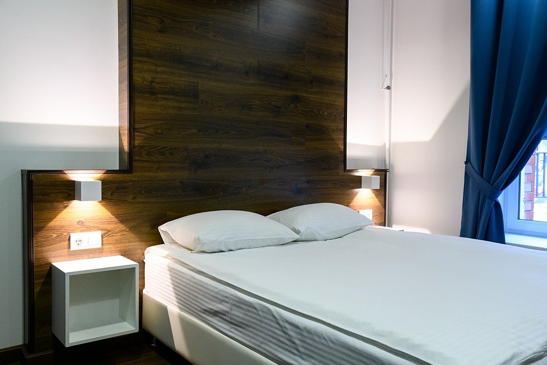 * площадь номера - 18 кв.м. * двуспальная кровать 160*200 * дополнительные места (двуспальный диван) - по запросу * белоснежное постельное белье и комплекты полотенец * Wi-Fi, телевизор, кондиционер, мини-холодильник, фен * шкаф, стол и стулья * ванная комната с душем * косметические средства и тапочки * халаты - по запросу * вода бутилированная, чай/кофе * ежедневная уборка номера На этаже есть кухня, кулер, гладильная доска, утюг и стиральная машина.Услуги и удобства