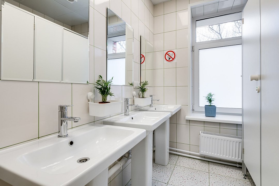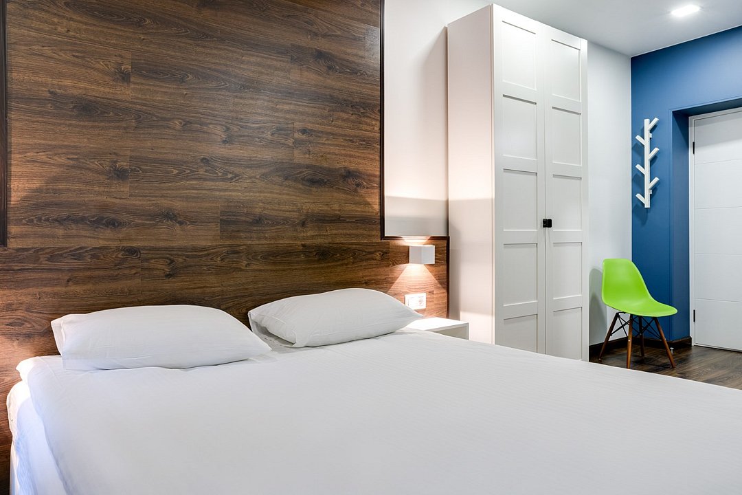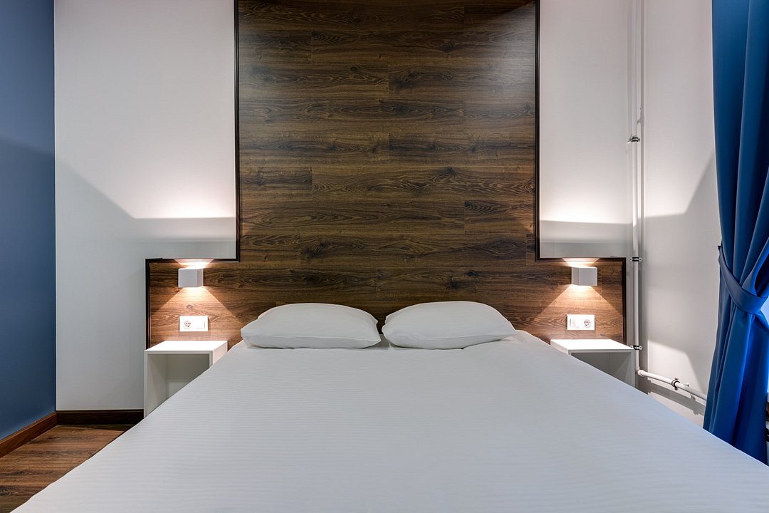 * площадь номера - 14 кв.м. * двуспальная кровать 140*200 * белоснежное постельное белье и комплект полотенец * Wi-Fi, телевизор, мини-холодильник * вешалка для одежды, стол и стул * душ и туалет на этаже * одноразовые тапочки * халат - по запросу * одноразовая гигиеническая продукция - дополнительно оплачивается На этаже есть кухня, кулер, гладильная доска, утюг и стиральная машина.Услуги и удобства