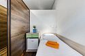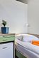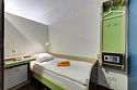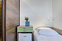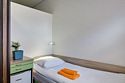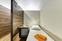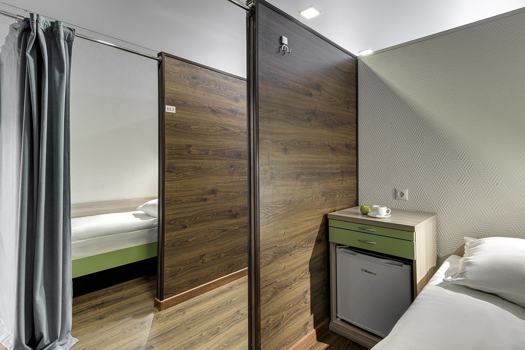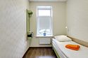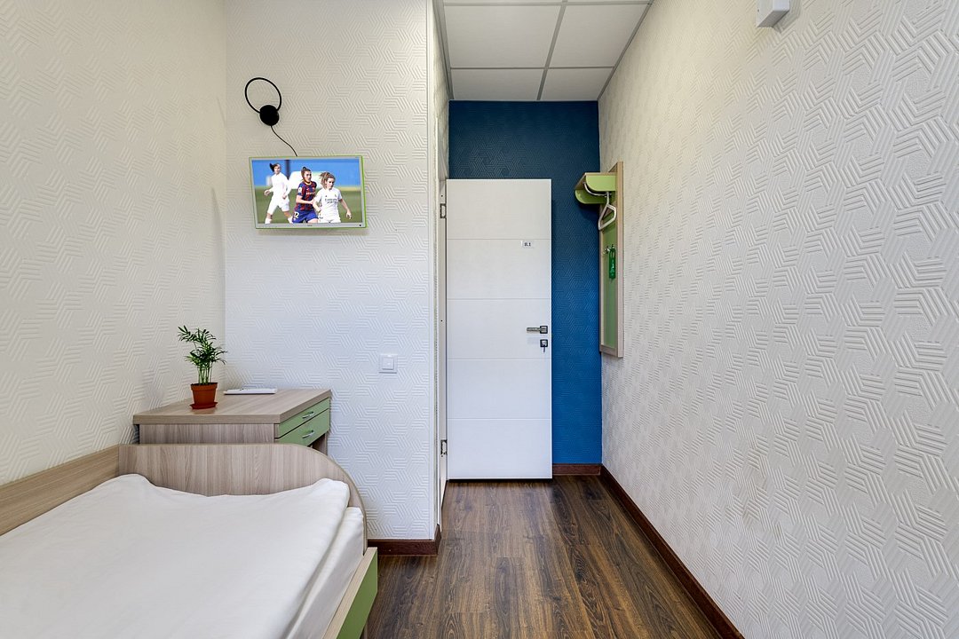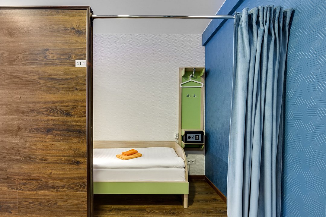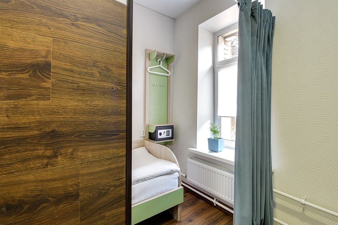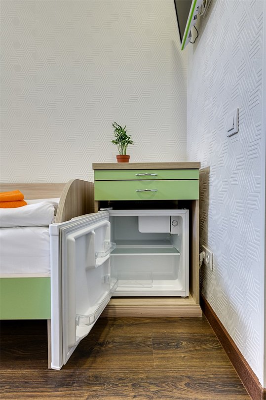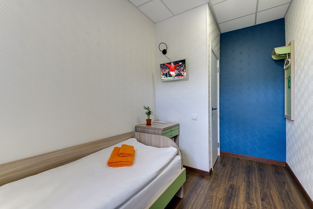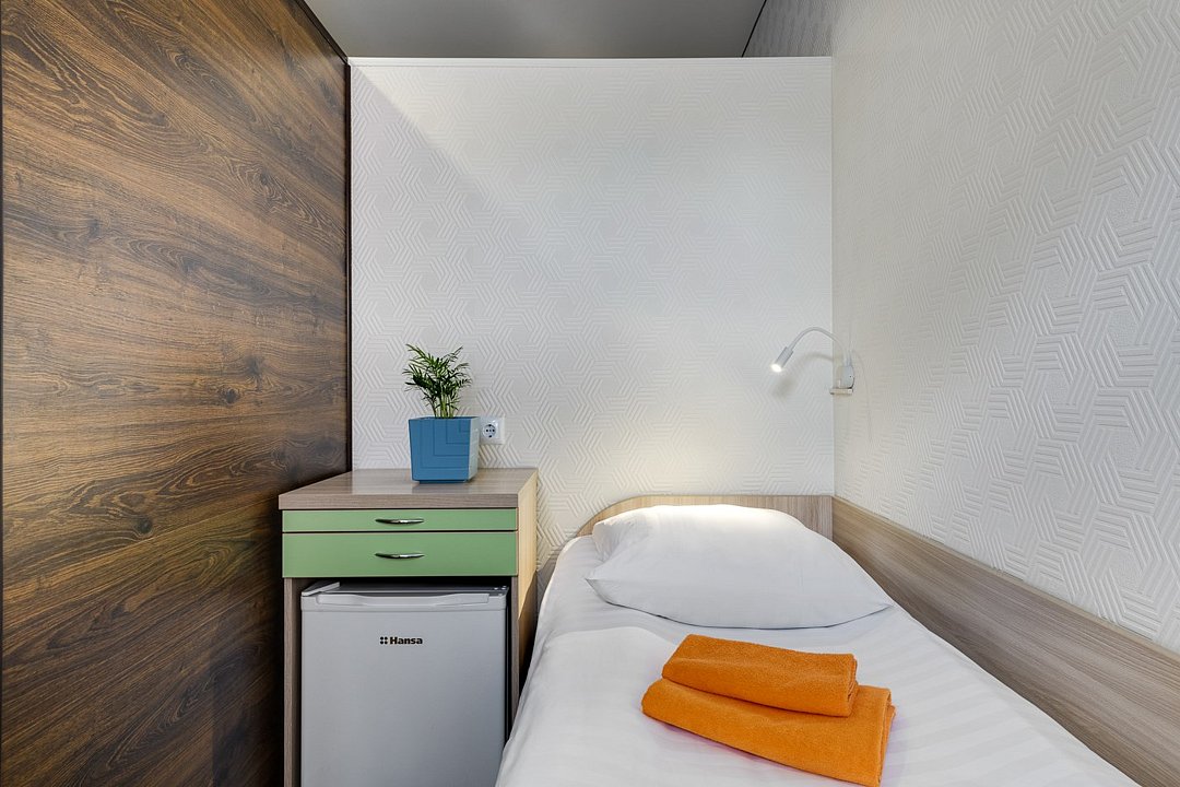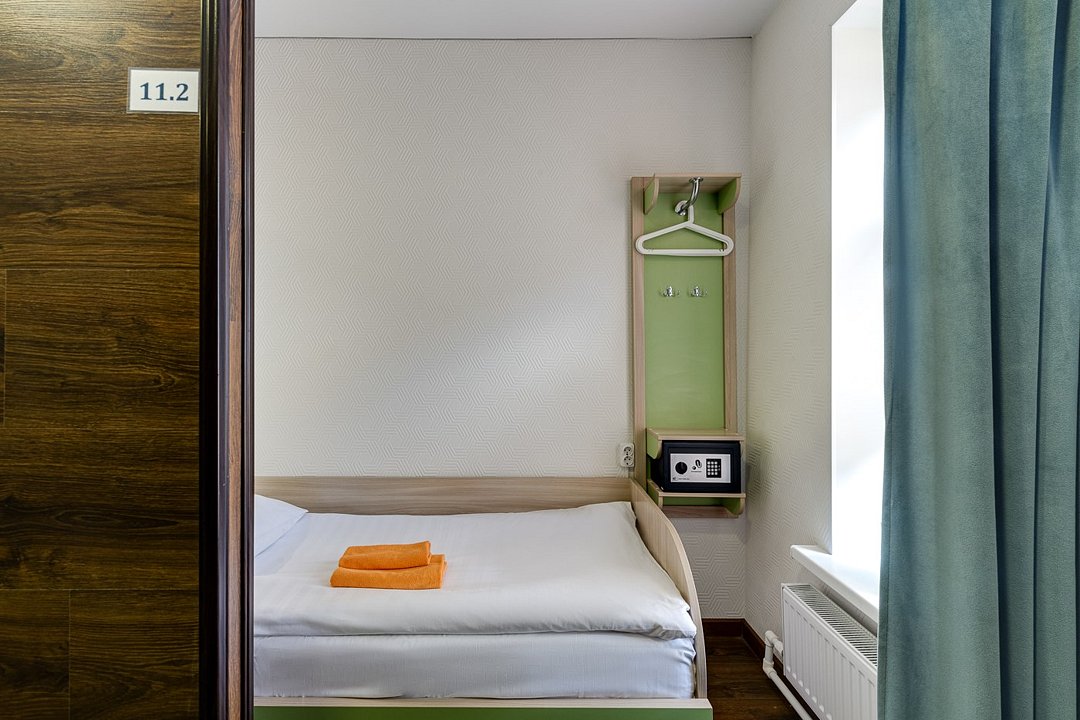 * площадь номера - 9 кв.м. * односпальная кровать 90*200 * белоснежное постельное белье и комплект полотенец * Wi-Fi, телевизор, мини-холодильник * вешалка для одежды, сейф, тумбочка со столом и стул * душ и туалет на этаже * одноразовые тапочки * халат - по запросу * одноразовая гигиеническая продукция - дополнительно оплачивается На этаже есть кухня, кулер, гладильная доска, утюг и стиральная машина.Услуги и удобства