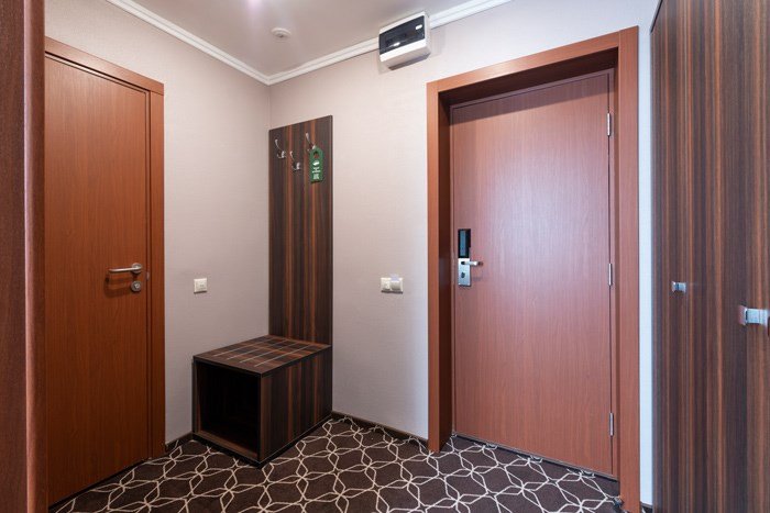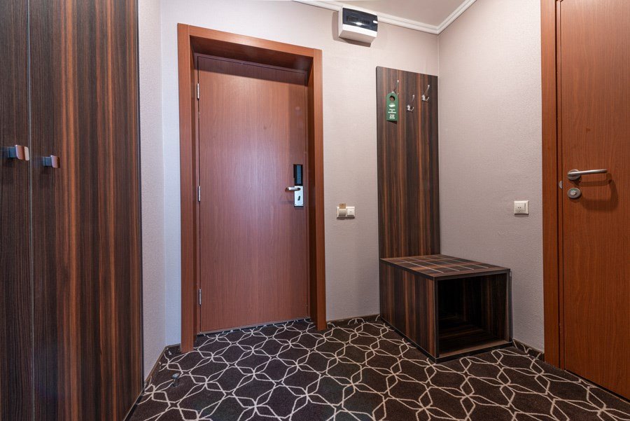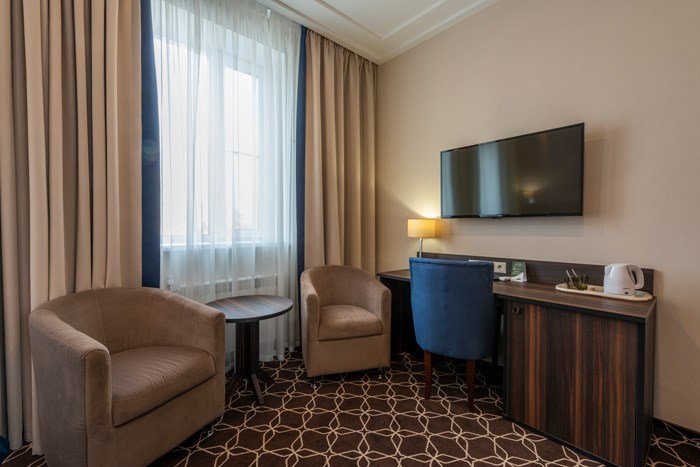 Wi-Fi, телефон, кондиционер, светильник, фен, электронные замки, две односпальные или большая двуспальная кровать, кресла, шкаф для одежды, вешалки, журнальный столик, багажная тумба, зеркало, две комнаты, чайный набор, сейф, минеральная вода, чайник, гостиная зона, ковровое покрытие, раскладной диван, телевизор с плоским экраном, мини-холодильник, номер для некурящих, рабочий столВ гостиничном номере