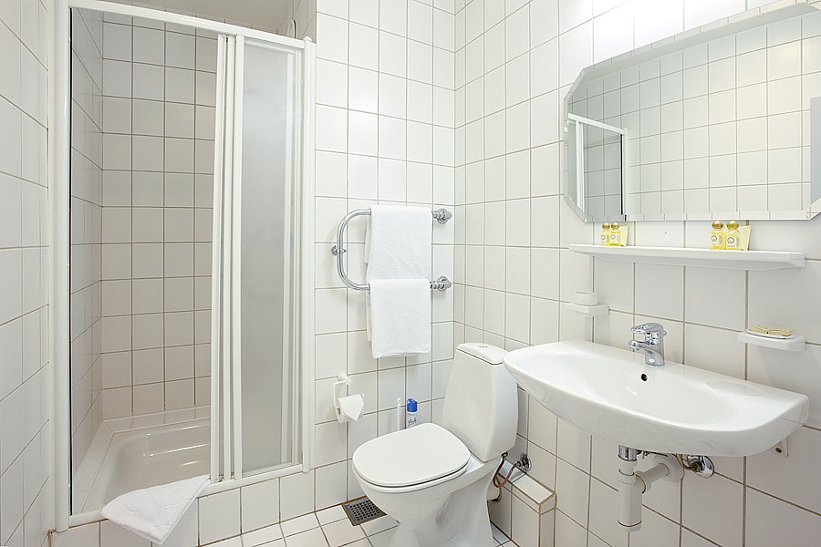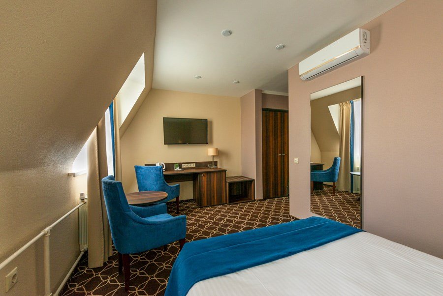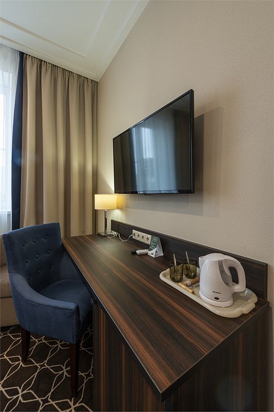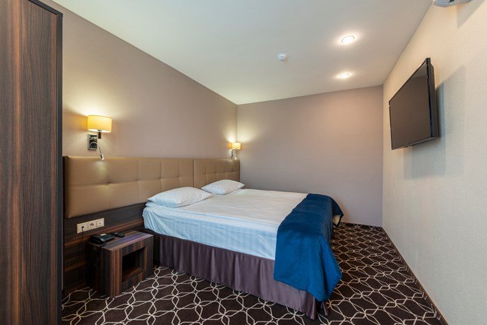 Wi-Fi, телефон, холодильник, кондиционер, фен, душевая кабина, полутораспальная кровать, шкаф для одежды, вешалки, сейф, чайник, ковровое покрытие, телевизор с плоским экраномВ гостиничном номере