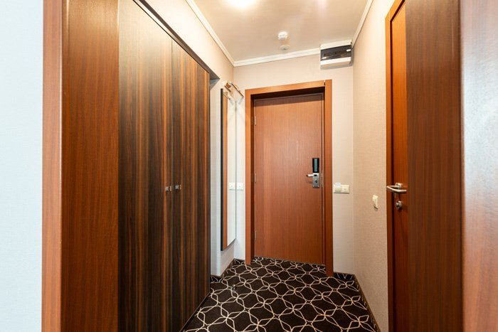 Wi-Fi, телефон, кондиционер, фен, система безопасности, электронные замки, ванная комната, душевая кабина, халаты, банные полотенца, тапочки, двуспальная кровать, тумбы, стулья, шкаф для одежды, гардеробная, вешалки, журнальный столик, багажная тумба, зеркало, чайный набор, сейф, минеральная вода, чайник, унитаз, раковина, мягкая мебель, гостиная зона, ковровое покрытие, три комнаты, кабинет, диван-кровать, раскладной диван, телевизор с плоским экраном, мини-холодильник, рабочий столВ гостиничном номере