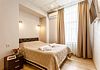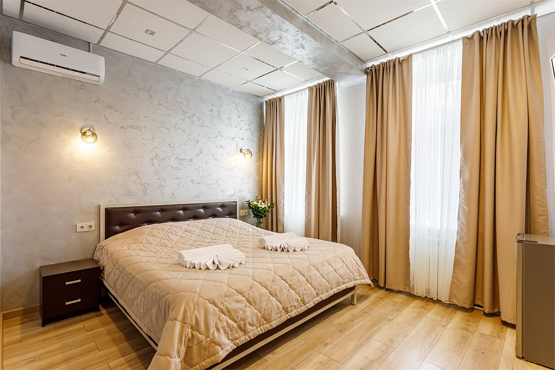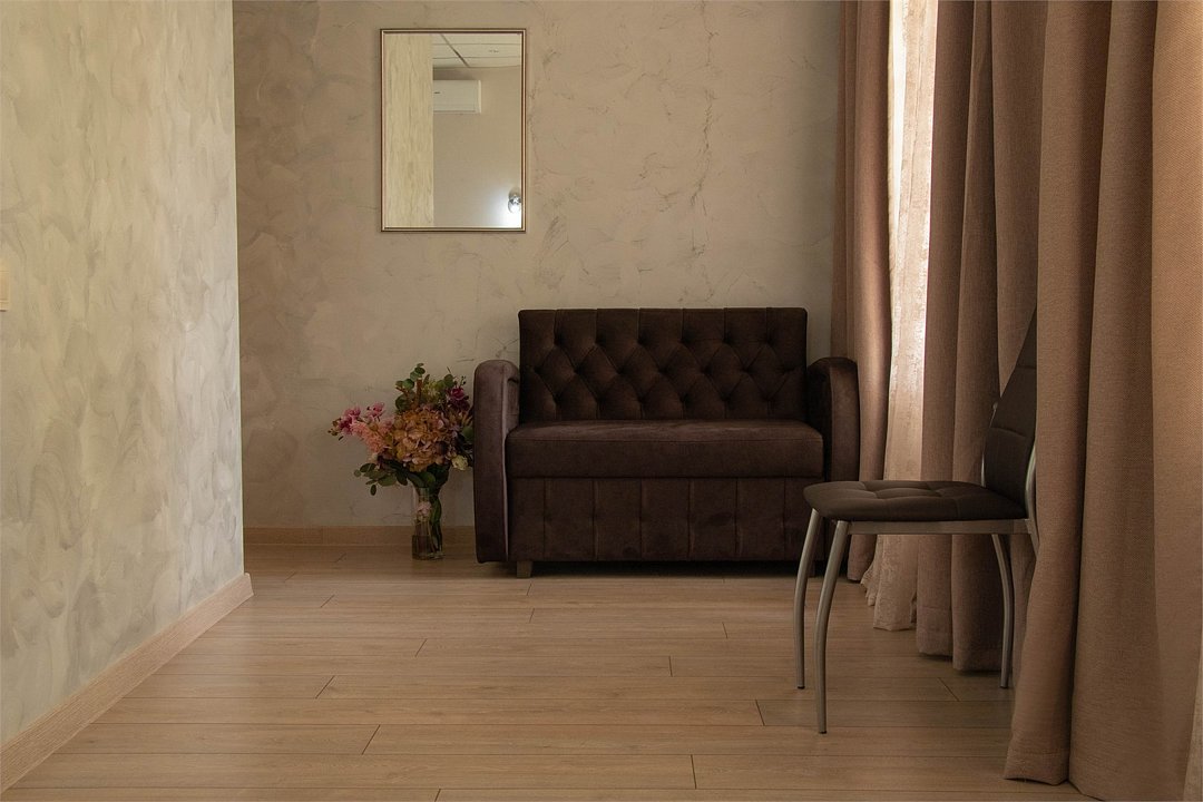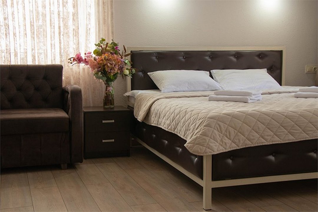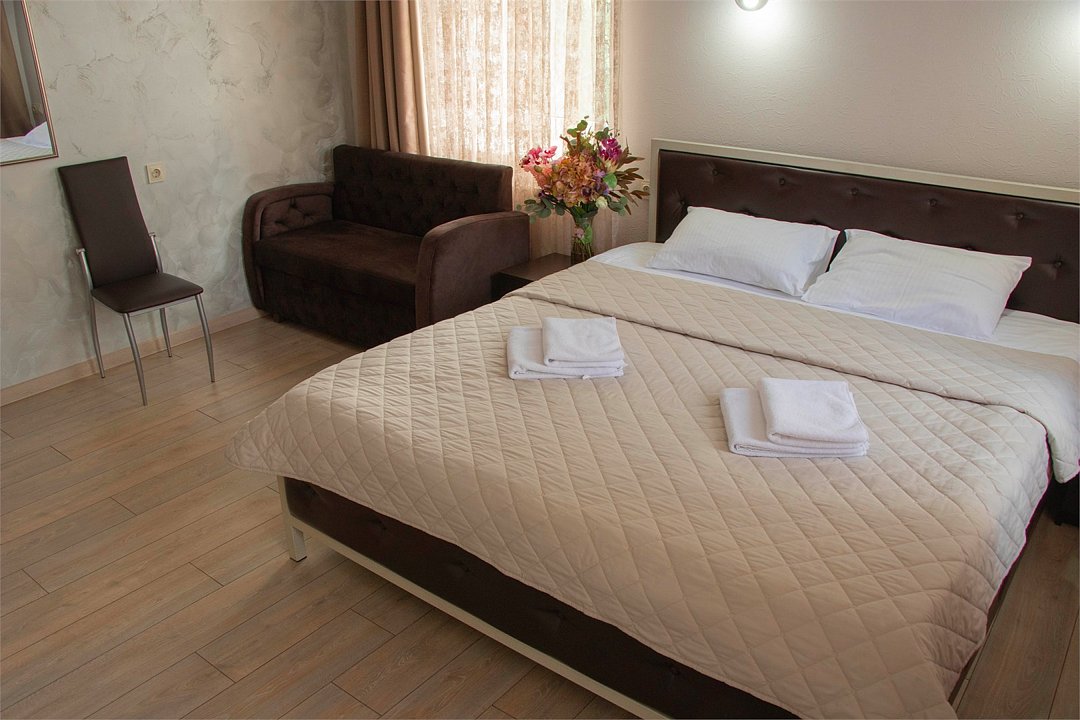 Трехместный номер с одной двуспальной кроватью и дополнительным спальным местом (диван) Стандартный однокомнатный номер оформлен в современном стиле, интерьер выполнен в светлых тонах и со всем необходимым оборудованием для комфортного пребывания гостей.Услуги и удобства