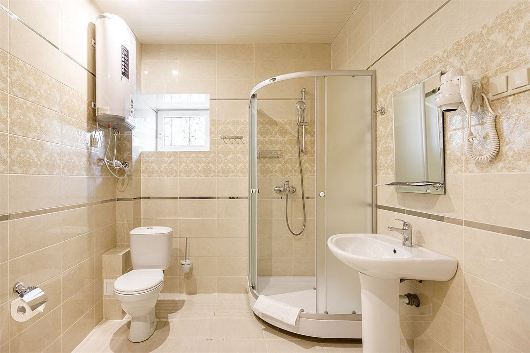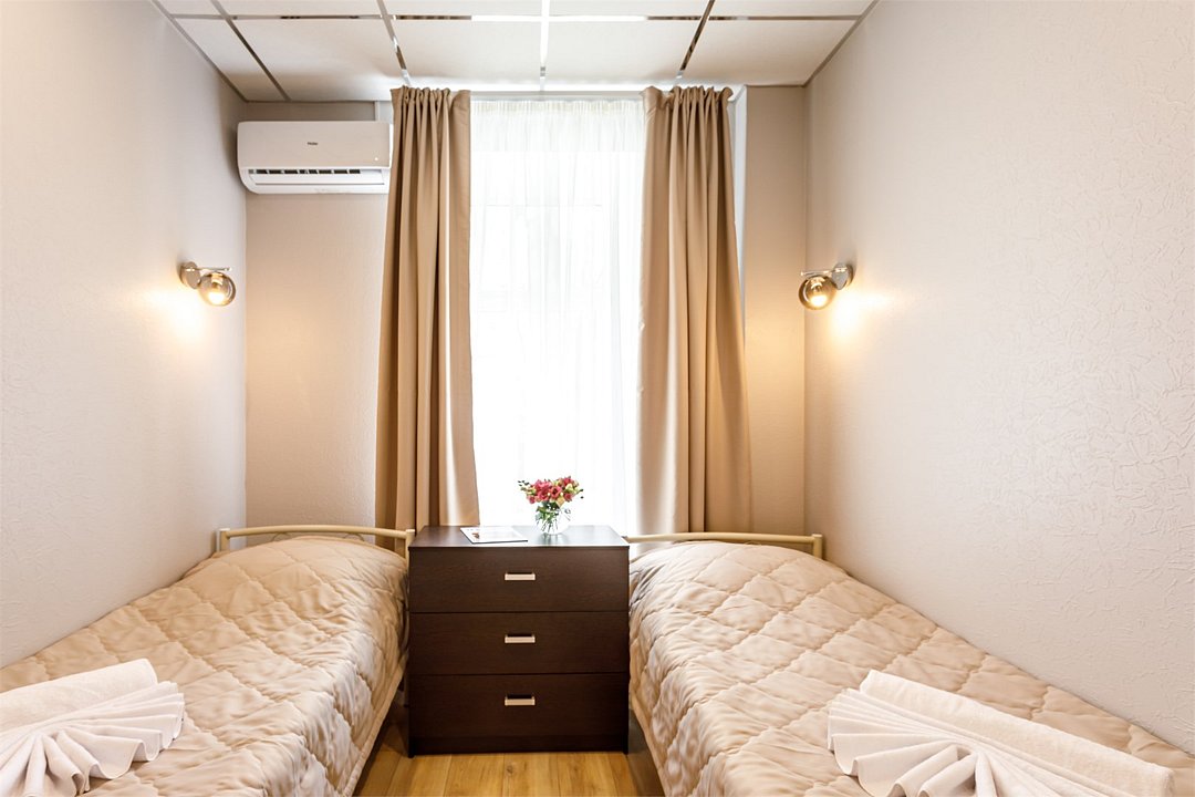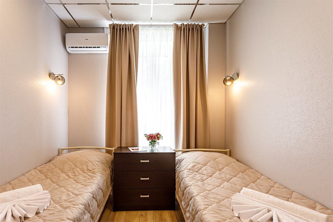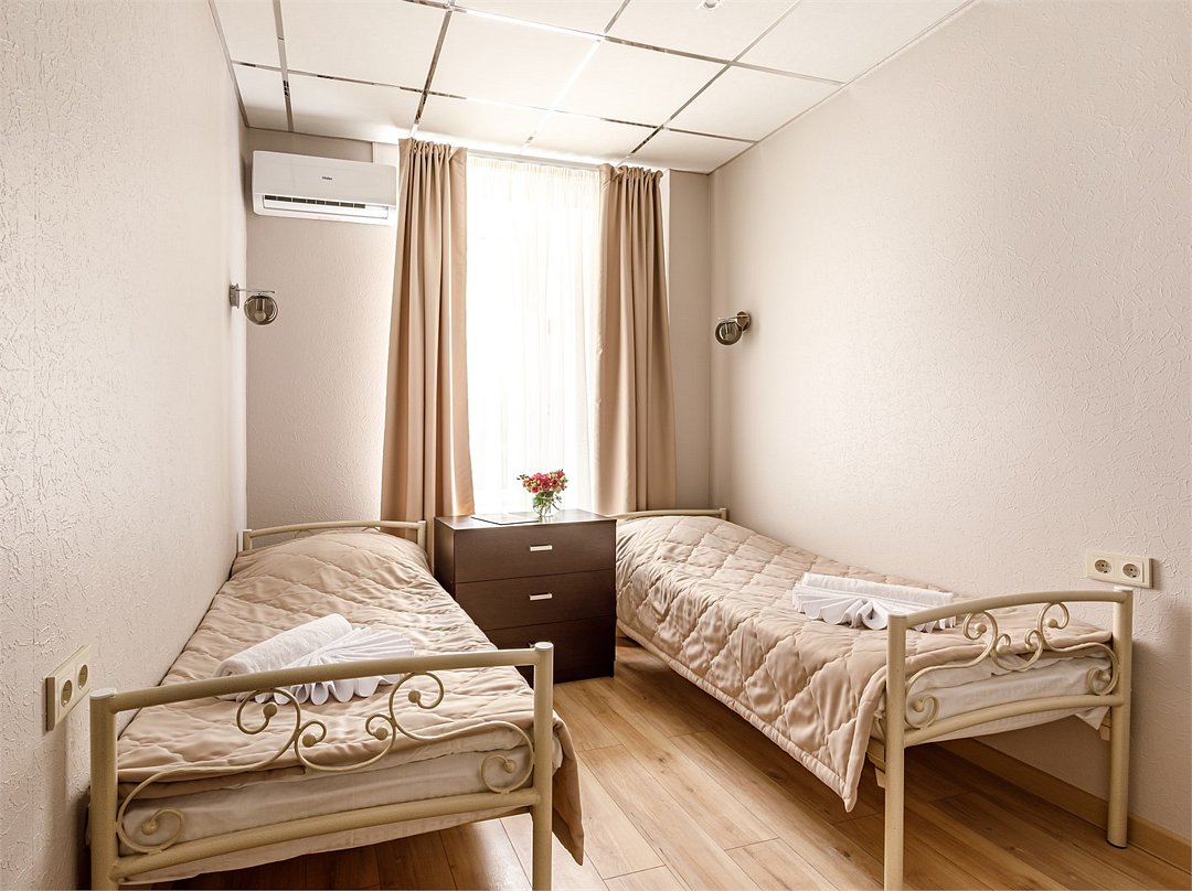 телевизор, Wi-Fi, холодильник, кондиционер, светильник, фен, душевая кабина, санузел, водонагреватель, банные принадлежности, банные полотенца, тапочки, гигиенические средства, две односпальные кровати, вешалки, зеркало, чайник, унитаз, раковина, душ, вид во двор, ламинат, стол, тумба, туалетные средства, туалет, цифровое тв, номер для некурящих, без питомцевВ номере