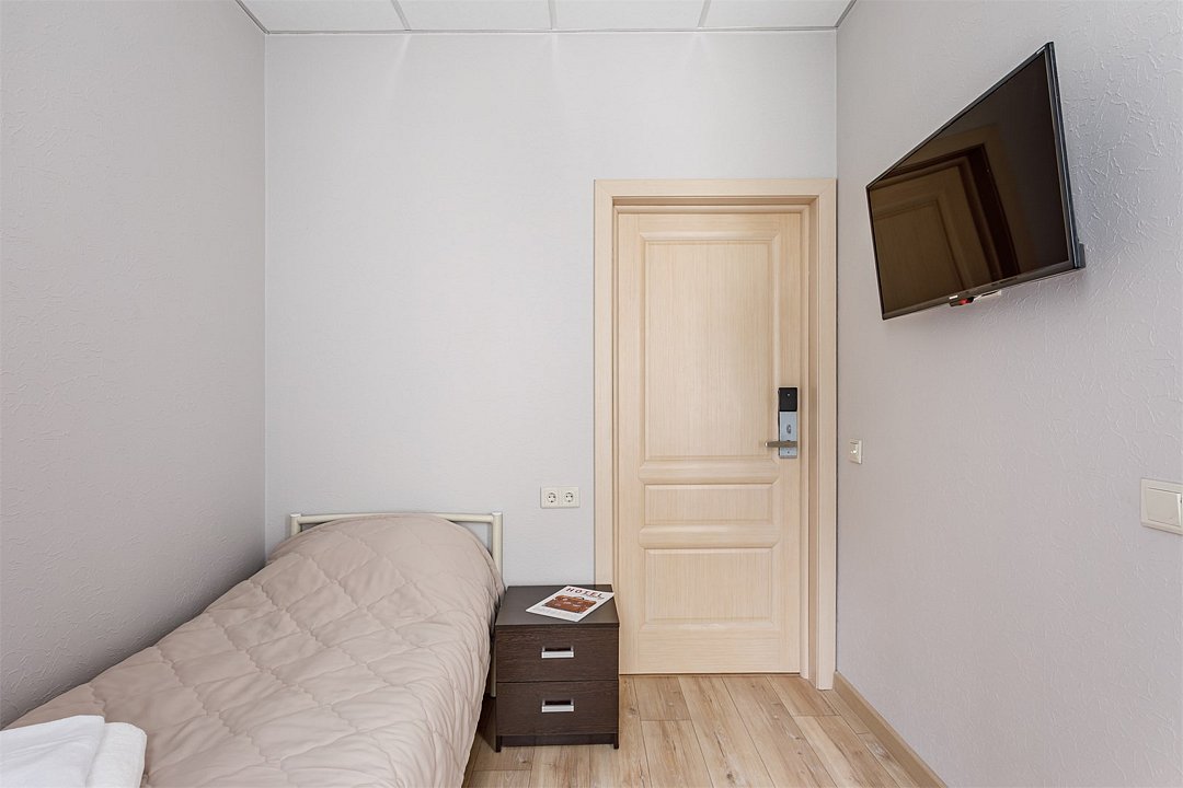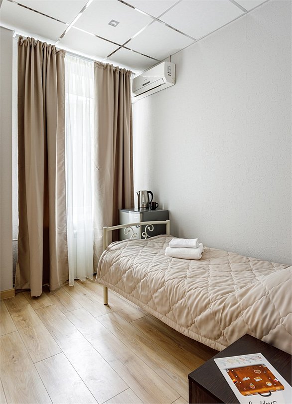 Wi-Fi, холодильник, кондиционер, фен, электронные замки, душевая кабина, санузел, водонагреватель, банные принадлежности, халаты, банные полотенца, тапочки, гигиенические средства, косметические средства, односпальная кровать, вешалки, зеркало, чайный набор, чайник, унитаз, раковина, душ, вид во двор, ламинат, стол, тумба, туалетные средства, цифровое тв, телевизор с плоским экраном, номер для некурящих, чайная станция, без питомцевВ номере