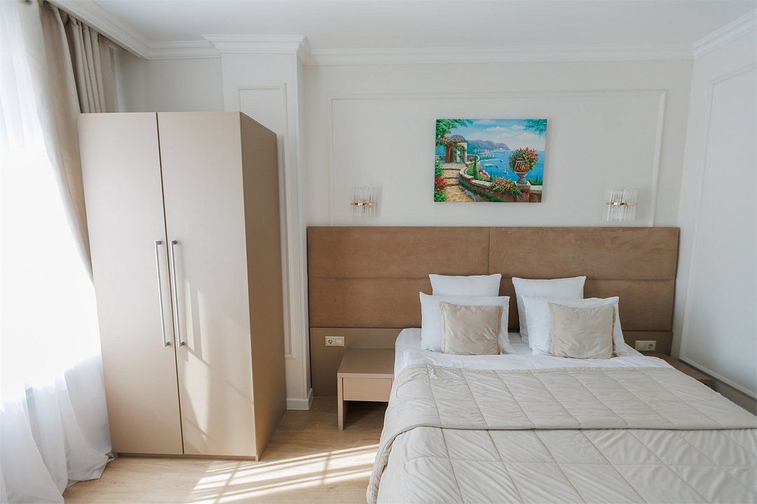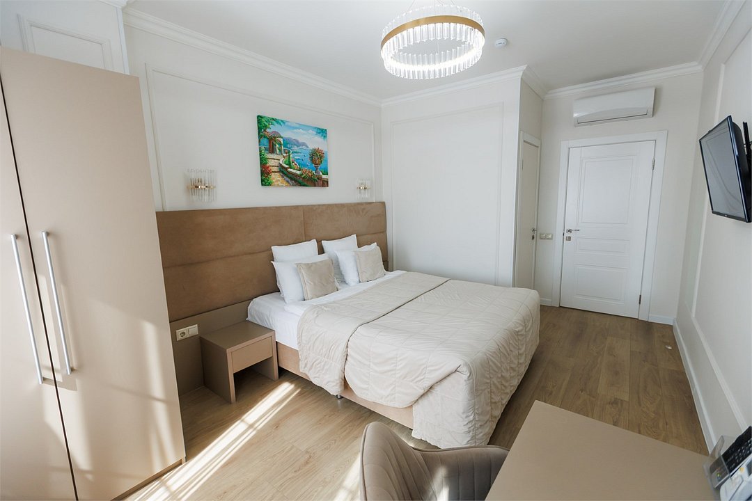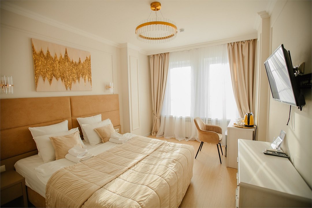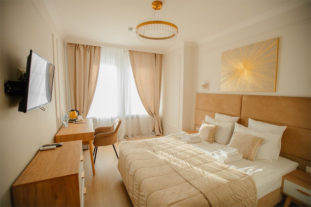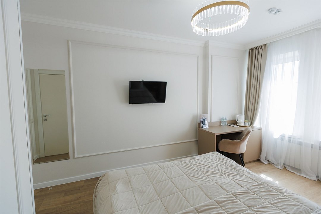 Wi-Fi, фен, утюг, халаты, банные полотенца, тапочки, косметические средства, двуспальная кровать, тумбы, шкаф для одежды, вешалки, письменный стол, комод, чайный набор, чайник, душ, вид на город, ламинат, стаканы, столовые приборы, стул, туалетные средства, туалет, телевизор с плоским экраном, мини-холодильник, телевизор со Smart TV, номер для некурящих, уборка номера, услуги прачечной (платно), бутилированная вода, без питомцевВ гостиничном номере