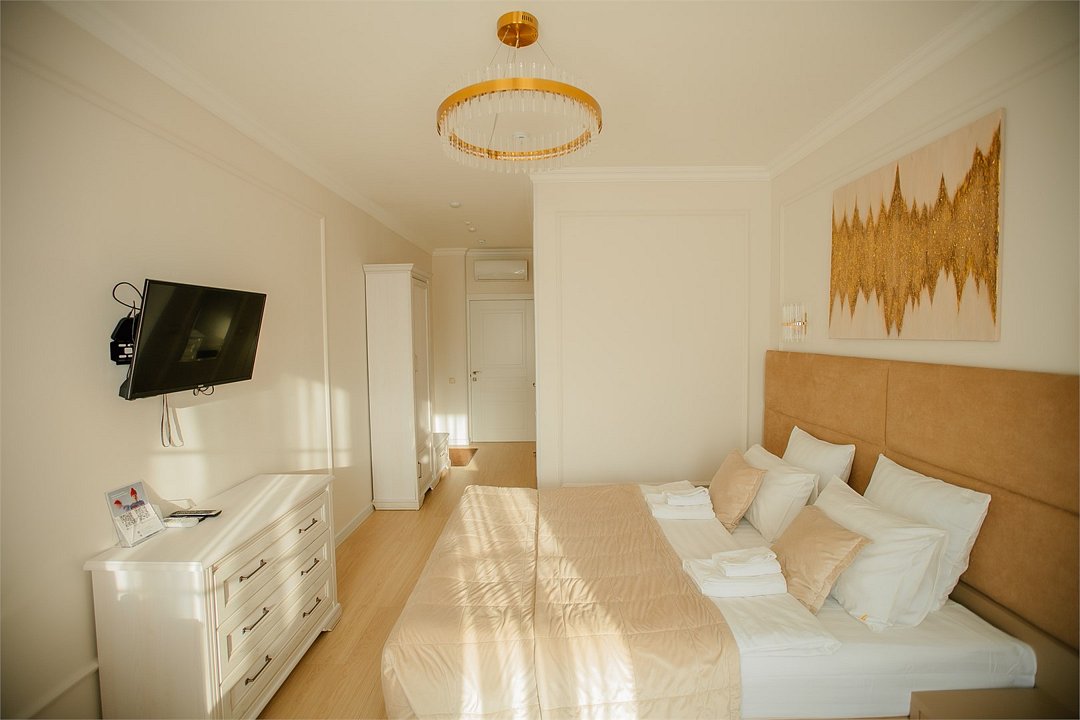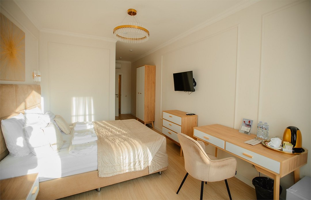 Wi-Fi, кондиционер, фен, утюг, радио, обогреватель, ванная комната, халаты, банные полотенца, пляжные полотенца, тапочки, гигиенические средства, косметические средства, двуспальная кровать, тумбы, шкаф для одежды, вешалки, письменный стол, чайный набор, сейф, чайник, вид на город, стаканы, столовые приборы, стул, туалетные средства, телевизор с плоским экраном, мини-холодильник, телевизор со Smart TV, номер для некурящих, антибактериальное средство для рук, услуги прачечной (платно), бутилированная вода, без питомцевВ гостиничном номере