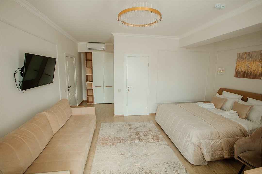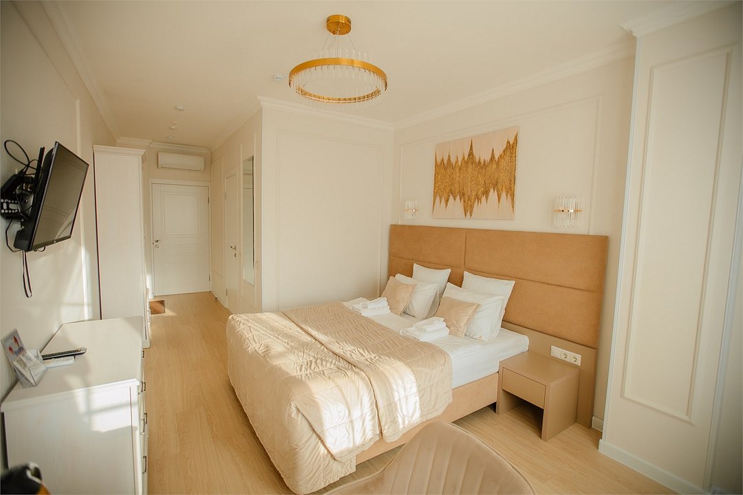 Wi-Fi, кондиционер, фен, утюг, обогреватель, ванная комната, халаты, банные полотенца, тапочки, гигиенические средства, двуспальная кровать, диван, тумбы, шкаф для одежды, вешалки, журнальный столик, письменный стол, чайник, вид на город, ламинат, стаканы, столовые приборы, стул, туалетные средства, телевизор с плоским экраном, мини-холодильник, телевизор со Smart TV, номер для некурящих, уборка номера, бутилированная вода, без питомцевВ гостиничном номере