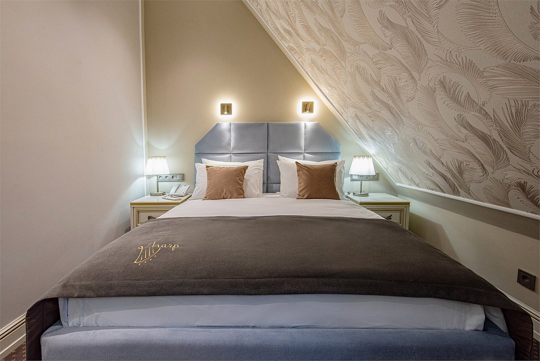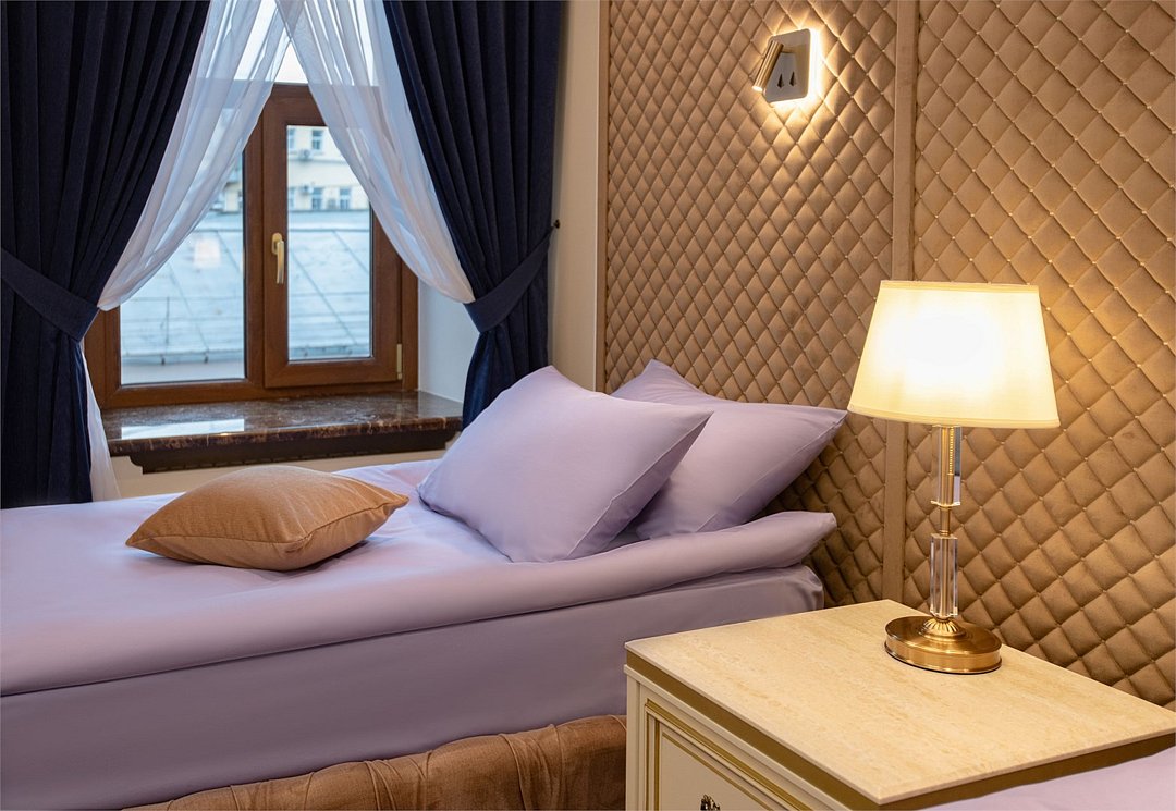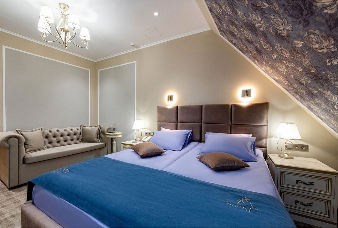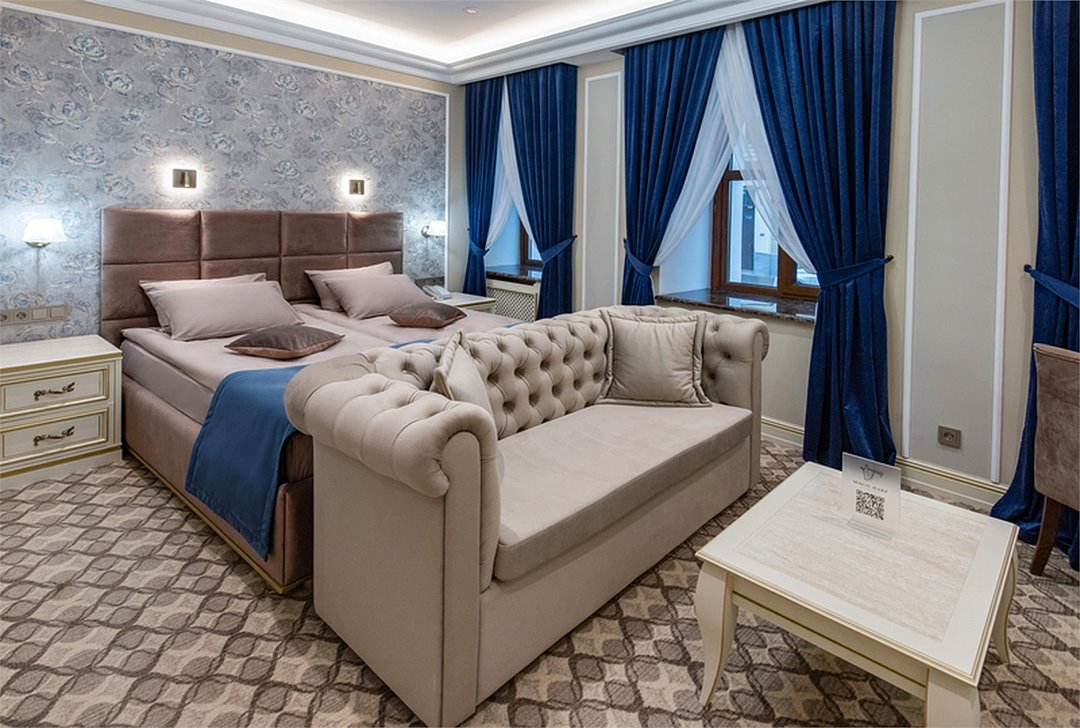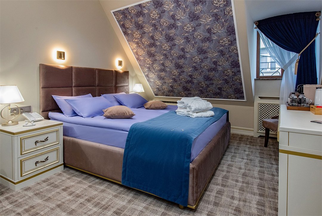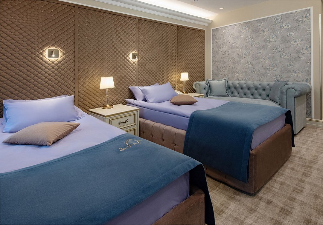 Номер повышенной комфортности с большой спальней c двумя раздельными кроватями и просторной ванной комнатой сделают ваше размещение поистине комфортным. Обращаем внимание, диван не раскладывается. Также имеется номер в данной категории, который расположен на 4 этаже - мансарда.Услуги и удобства