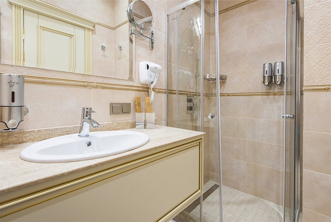 Wi-Fi, телефон, кондиционер, светильник, фен, электронные замки, утюг, ванная комната, душевая кабина, санузел, халаты, банные полотенца, тапочки, косметические средства, двуспальная кровать, гладильная доска, ортопедический матрас, шкаф для одежды, вешалки, журнальный столик, письменный стол, зеркало, эксклюзивная мебель, мини-бар, чайный набор, обслуживание номеров, сейф, чайник, раковина, косметическое зеркало, ковровое покрытие, отопление, душ, кулер на этаже, кресло, вид во двор, стаканы, столовые приборы, туалетный столик, кофейный столик, стул, тумба, туалетные средства, цифровое тв, внутренний телефон, мини-холодильник, номер для некурящих, гигиенический душ, уборка номера, набор для приготовления чая и кофе, услуги прачечной (платно), вешалки-плечики, бутилированная вода, мини-бар (платно), шапочка для душа, мылоВ номере
