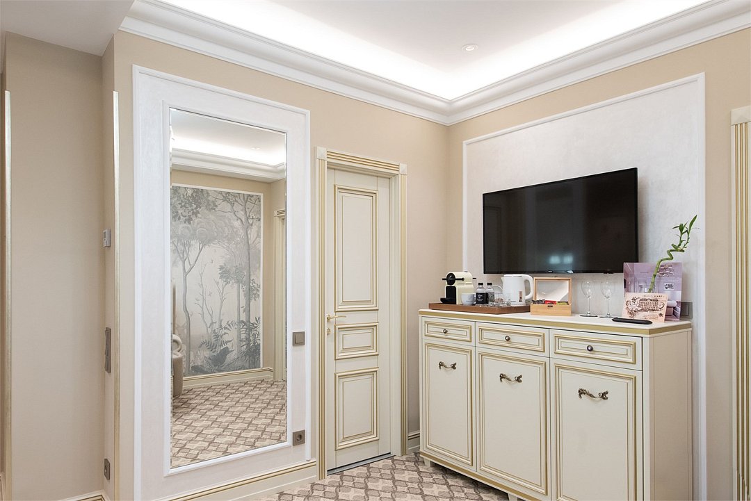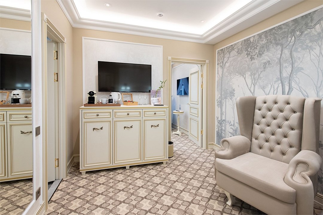 два телевизора, Wi-Fi, интернет, кондиционер, фен, электронные замки, кофемашина, утюг, теплый пол, халаты, тапочки, кровать «Queen size», гладильная доска, диван, кресла, шкаф для одежды, гардеробная, письменный стол, зеркало, эксклюзивная мебель, две комнаты, мини-бар, письменные принадлежности, чайный набор, набор посуды, обслуживание номеров, сейф, чайник, унитаз, косметическое зеркало, питьевая вода, ковровое покрытие, отопление, душ, вид на город, кресло, стаканы, кофейный столик, стул, стол, тумба, туалетный столик, туалетные средства, туалет, цифровое тв, диван-кровать, внутренний телефон, телевизор с плоским экраном, мини-холодильник, телевизор со Smart TV, номер для некурящих, usb порт, электронный консьерж 24/7, фитнес-зона, чайная станция, мини-бар (платно)В номере