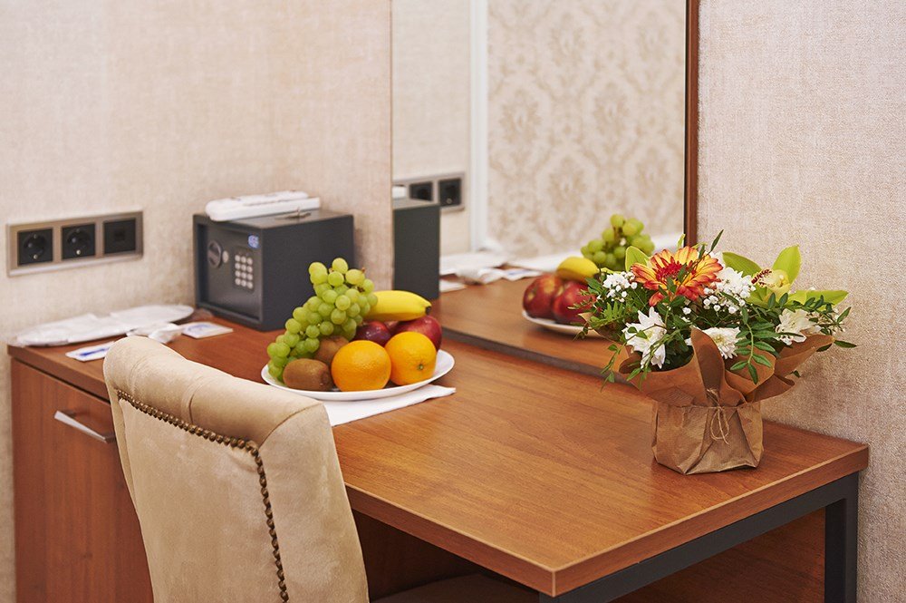 телевизор, интерактивное телевидение, Wi-Fi, интернет, холодильник, кондиционер, фен, электронные замки, душевая кабина, тапочки, косметические средства, двуспальная кровать, стулья, шкаф для одежды, письменный стол, зеркало, мини-бар, чайный набор, сейф, чайник, косметическое зеркало, кулер на этаже, вид во двор, туалетные средства, туалет, внутренний телефон, мини-холодильник, телевизор со Smart TV, чайная станцияВ номере