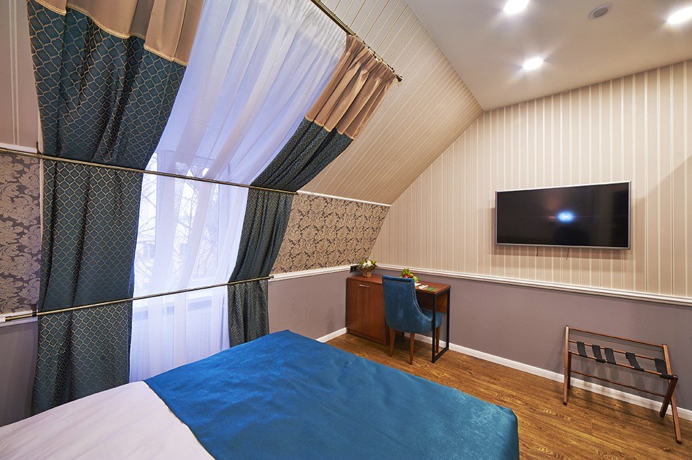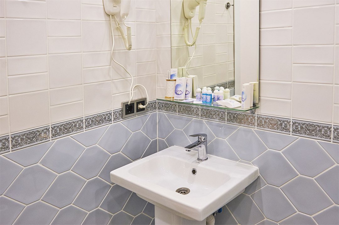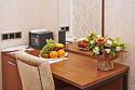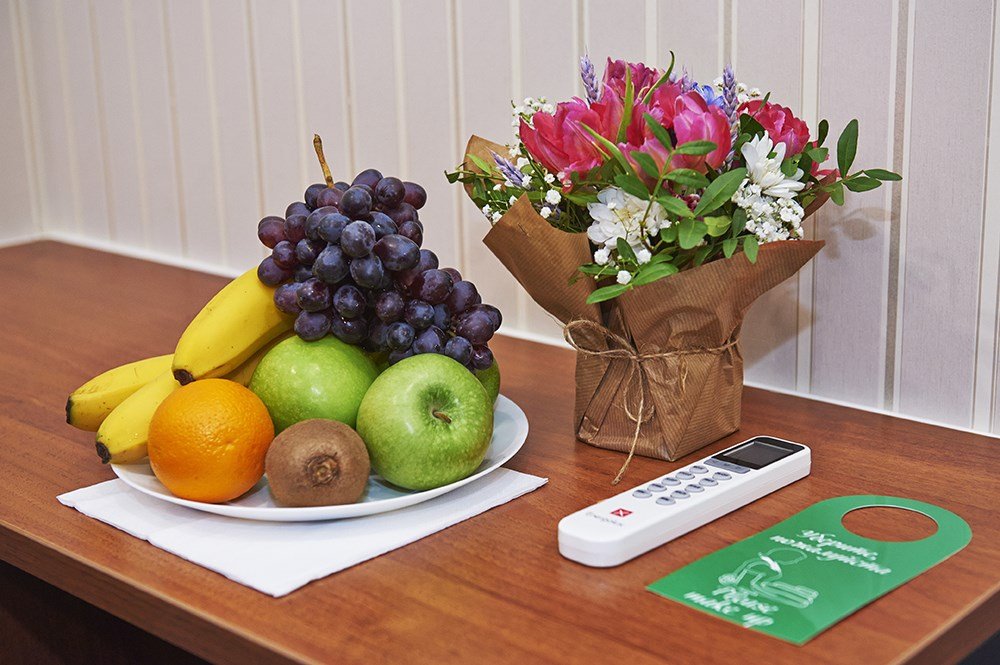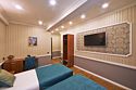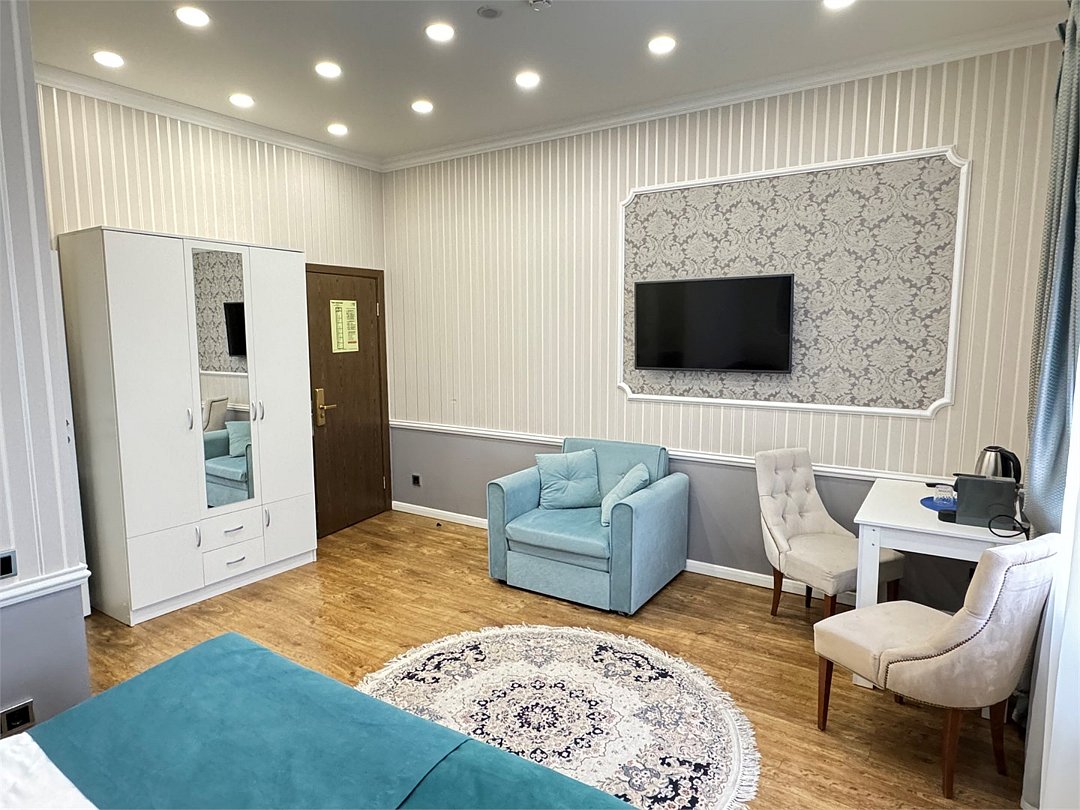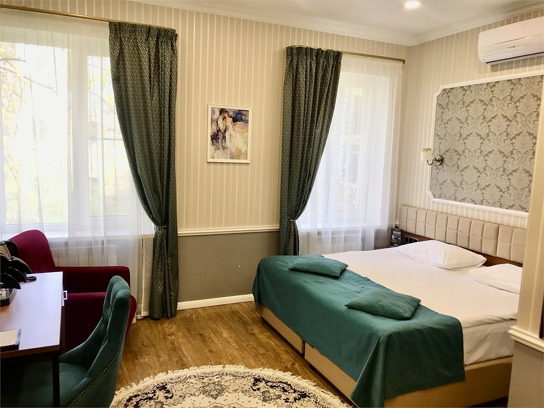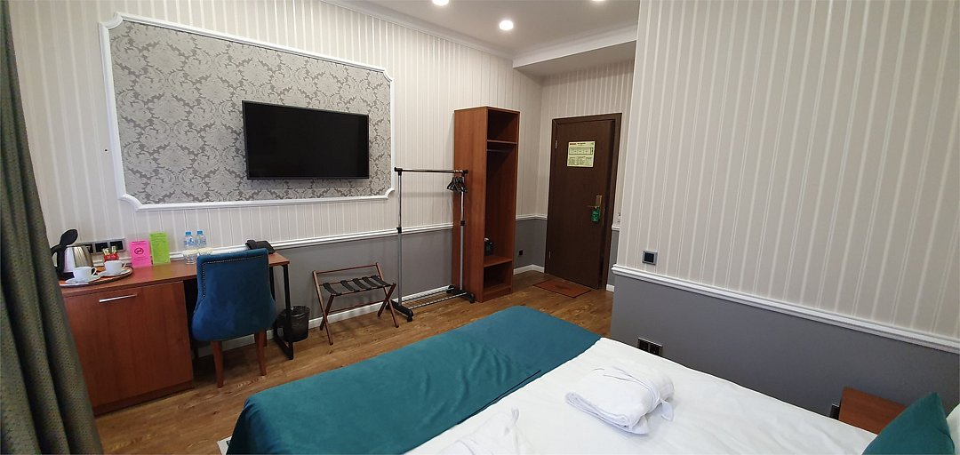 телевизор, интерактивное телевидение, Wi-Fi, кондиционер, светильник, фен, электронные замки, кофемашина, душевая кабина, санузел, тапочки, косметические средства, две односпальные или большая двуспальная кровать, гладильная доска, кресла, стулья, шкаф для одежды, письменный стол, обеденный стол, зеркало, ковер, чайный набор, сейф, чайник, раковина, косметическое зеркало, питьевая вода, душ, кулер на этаже, кресло, вид во двор, кухонная посуда, стаканы, стул, туалетные средства, туалет, москитная сетка, телевизор со Smart TV, чайная станция, вешалки-плечикиВ номере