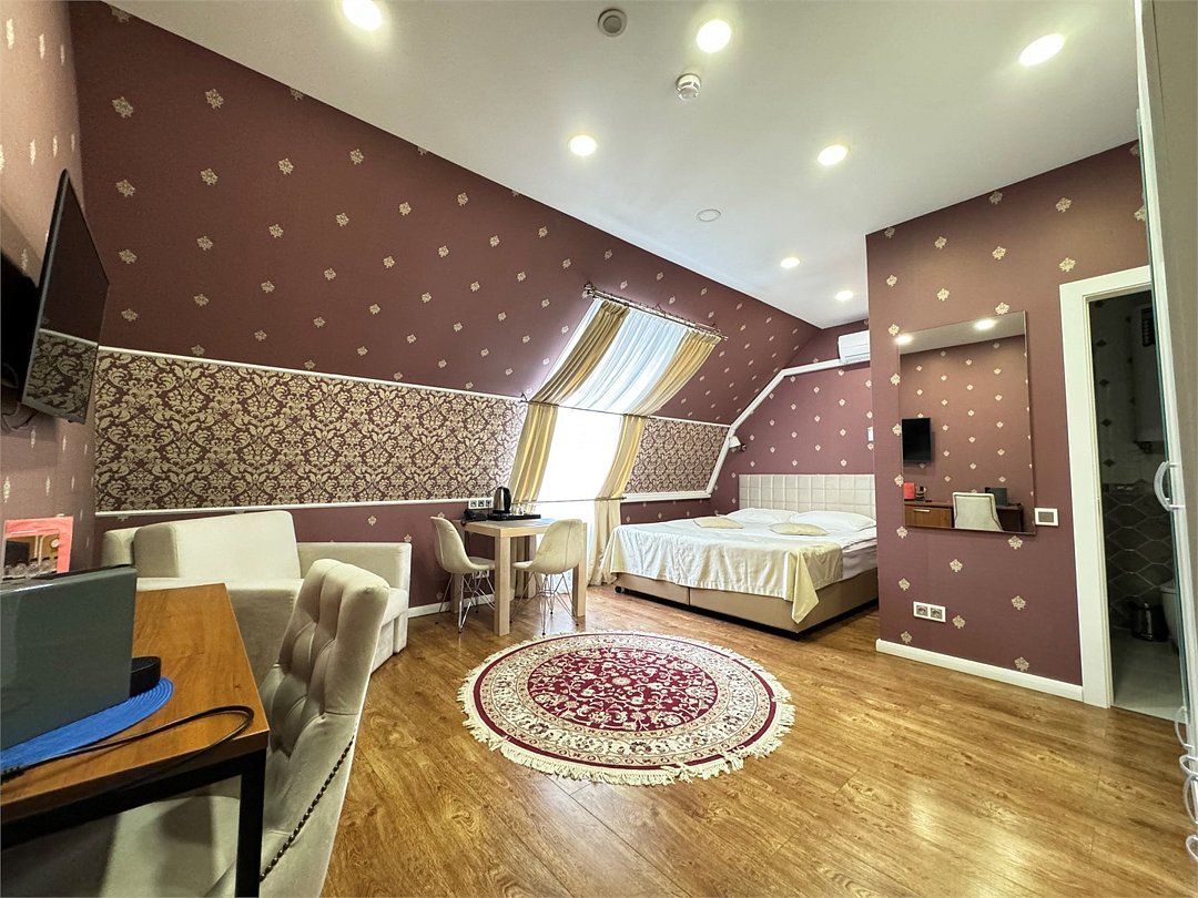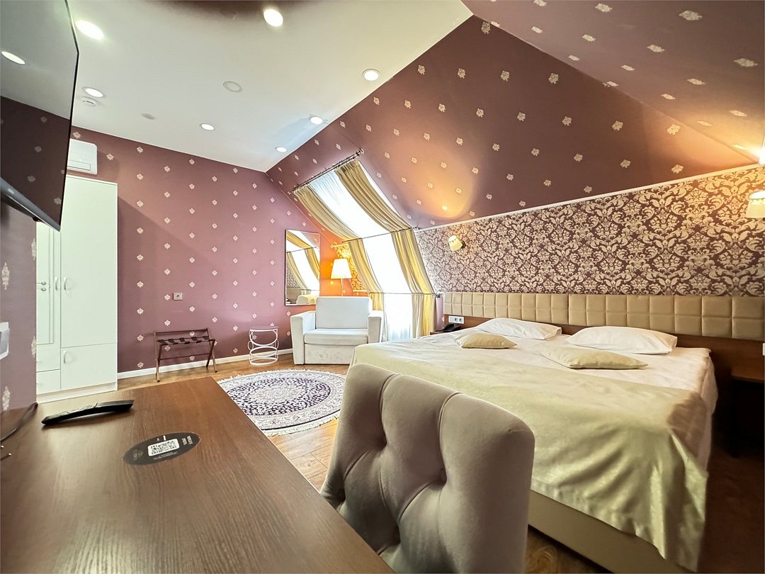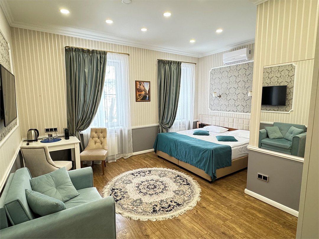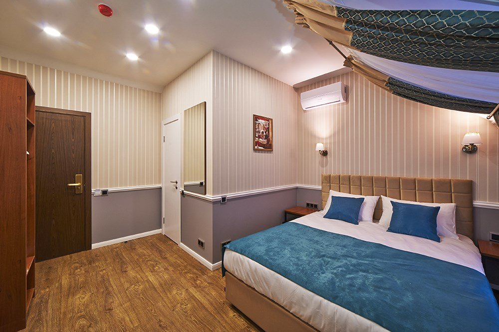 телевизор, интерактивное телевидение, Wi-Fi, система климат-контроля, светильник, фен, душевая кабина, водонагреватель, двуспальная кровать, шкаф для одежды, письменный стол, чайный набор, сейф, чайник, унитаз, туалетные средства, телевизор с плоским экраном, мини-холодильник, телевизор со Smart TVВ номере
