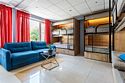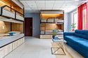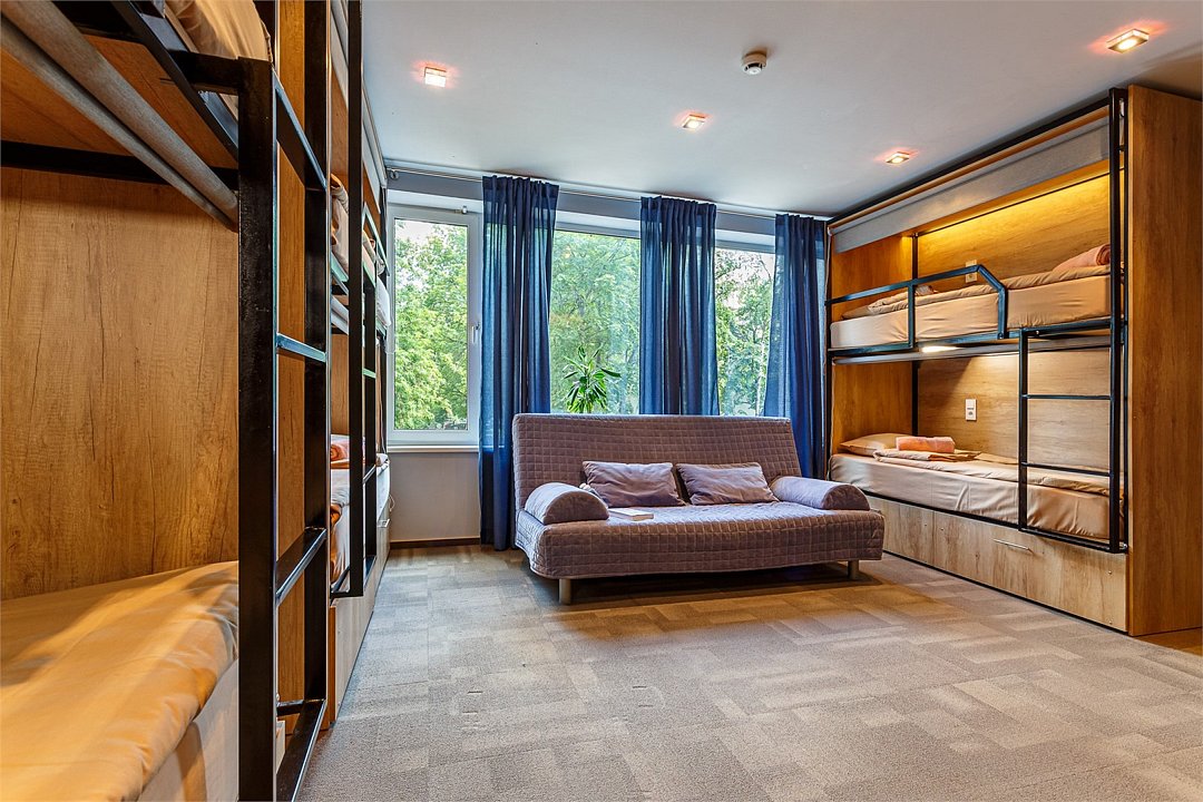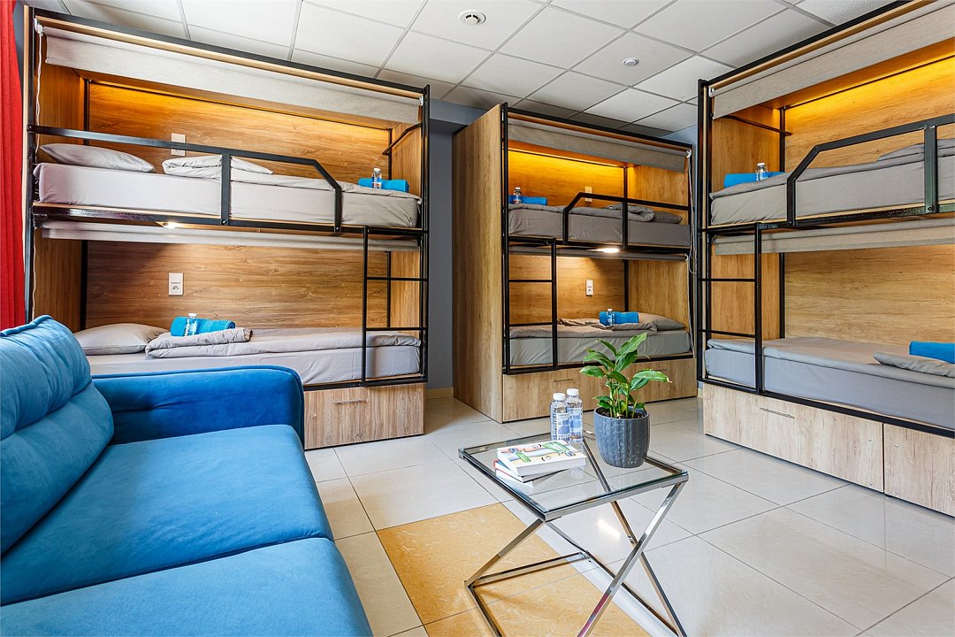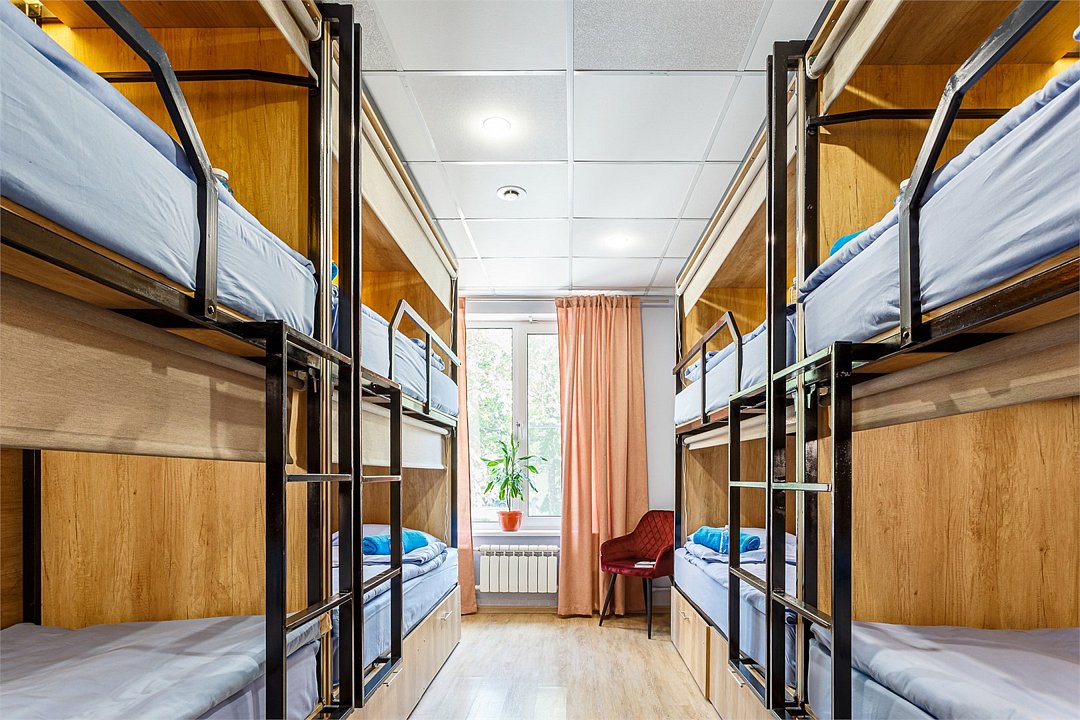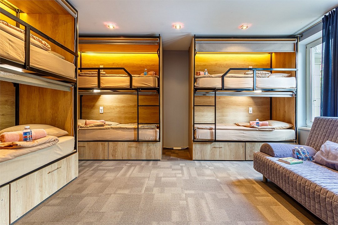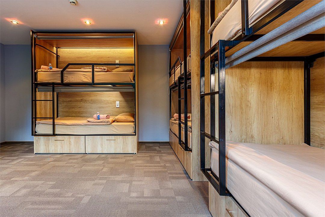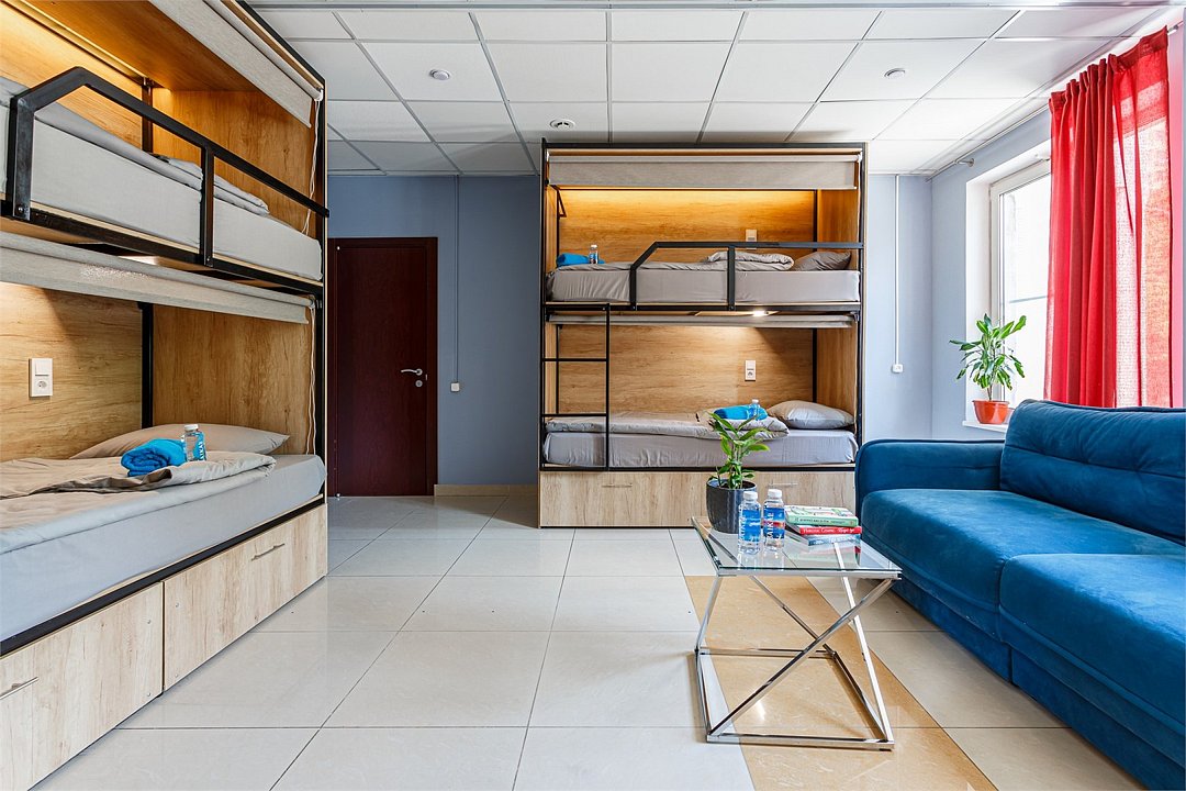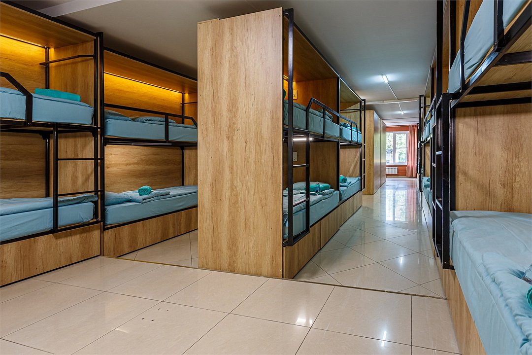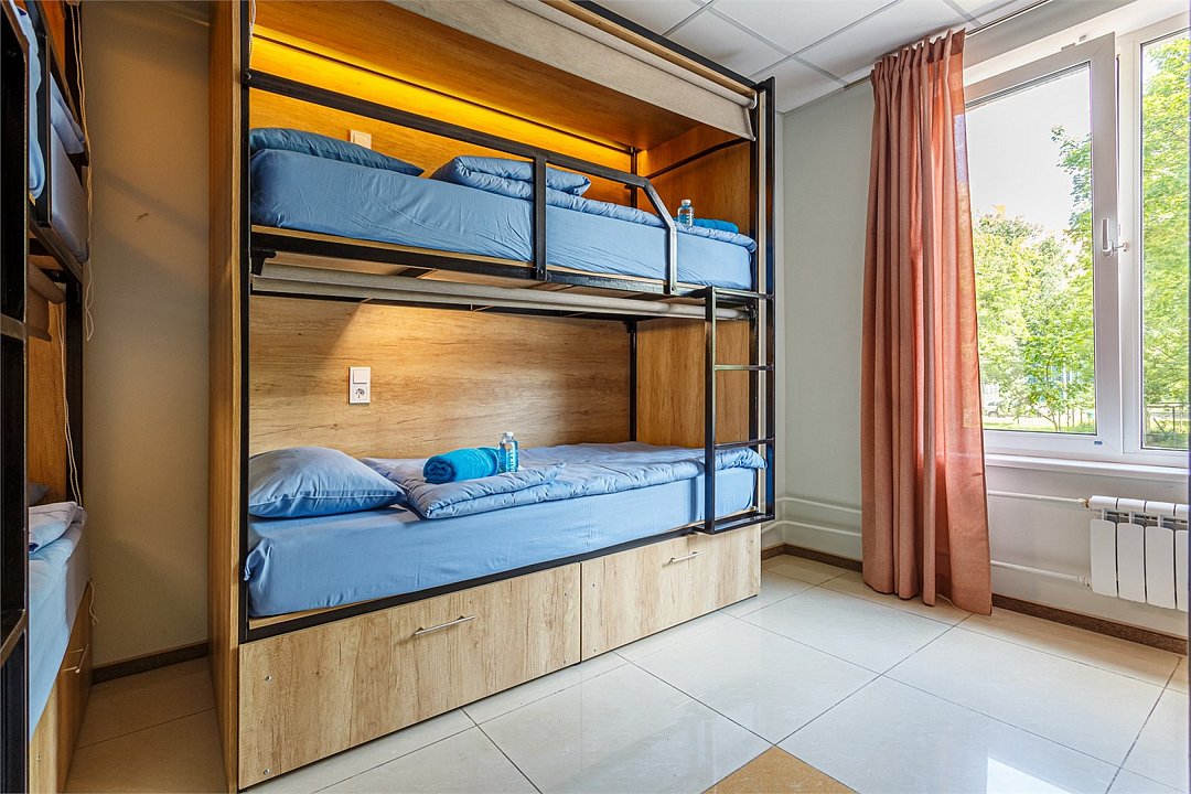 Wi-Fi, холодильник, светильник, фен, электронные замки, плита для приготовления пищи, микроволновая печь, утюг, банные полотенца, гигиенические средства, гладильная доска, шкаф для одежды, вешалки, багажная тумба, кухня, звуконепроницаемые стены и окна, набор посуды, стиральная машина, чайник, питьевая вода, обеденная зона, двухъярусные кровати, гостиная зона, отопление, вид на город, кулер на этаже, высокие потолки, кухонная посуда, стаканы, столовые приборы, стиральная машина и сушилка, санузел на этаже, сушилка для белья, кухонный уголок, душ на этажеВ месте в номере