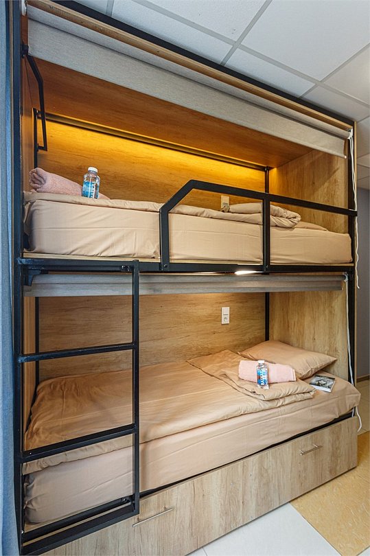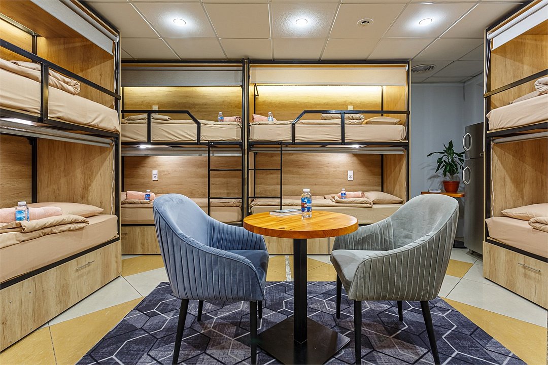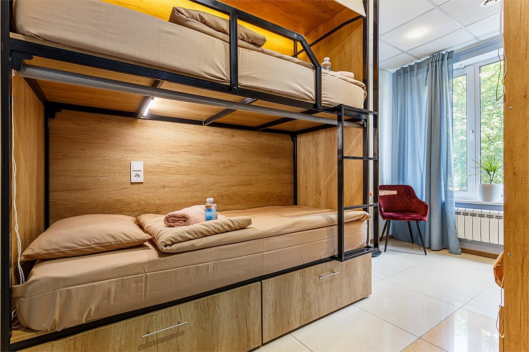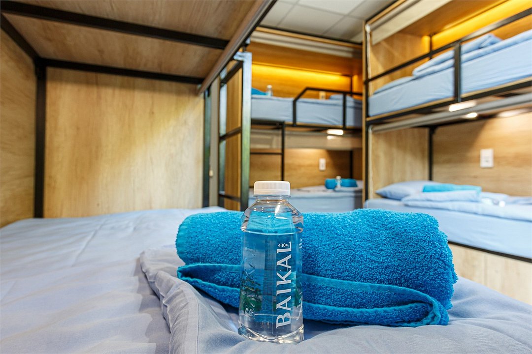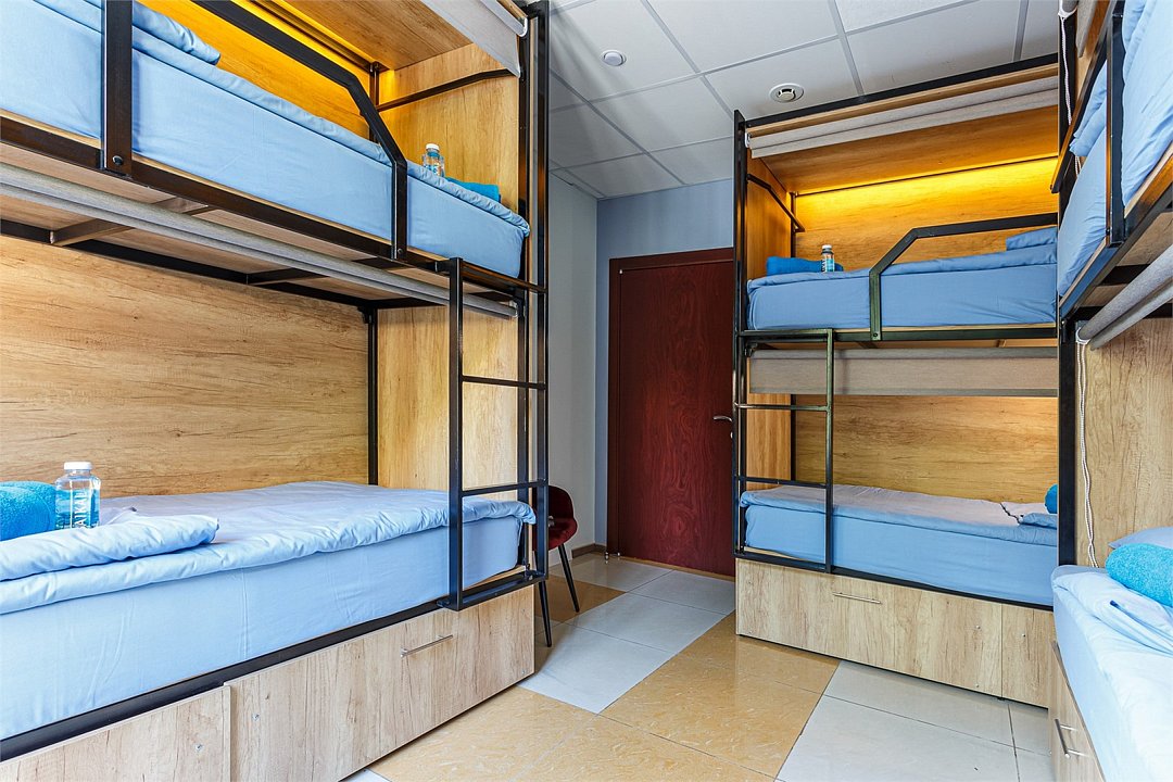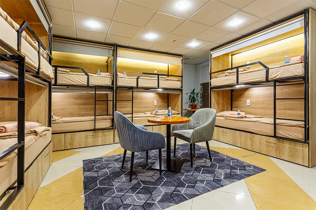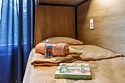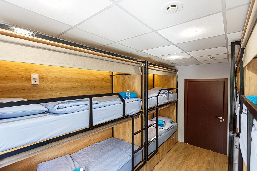 Номер оборудован шестью комфортными двухъярусными кроватями высшего класса с ортопедическими матрасами, индивидуальным освещением, розеткой, откидным столиком и плотной шторкой.Услуги и удобства