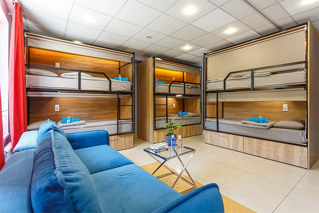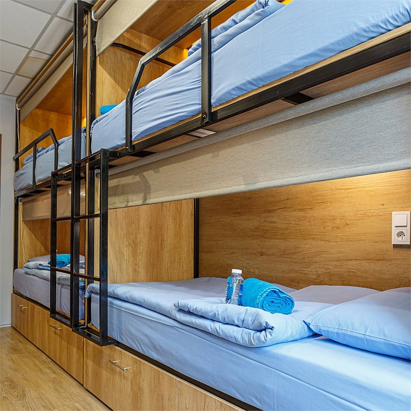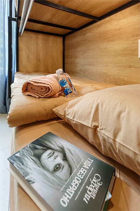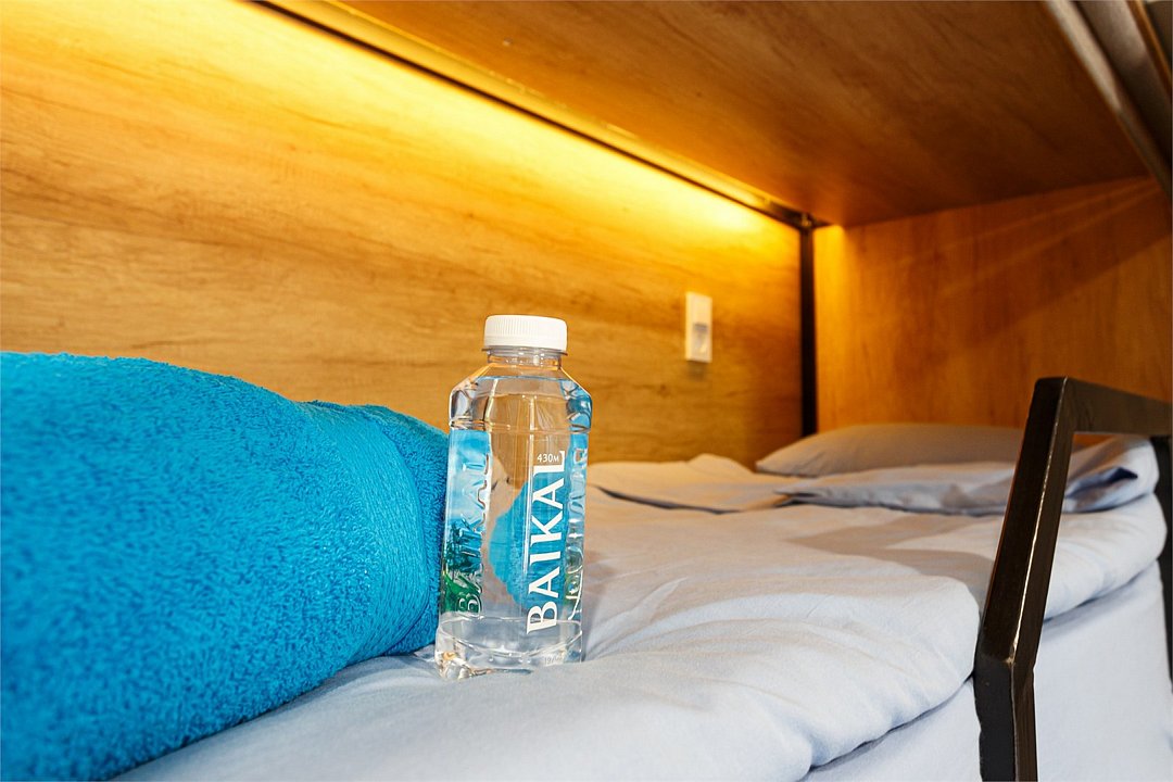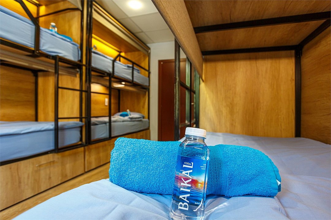 Номер оборудован двенадцатью комфортными двухъярусными кроватями высшего класса с ортопедическими матрасами, индивидуальным освещением, розеткой, откидным столиком и плотной шторкой.Услуги и удобства