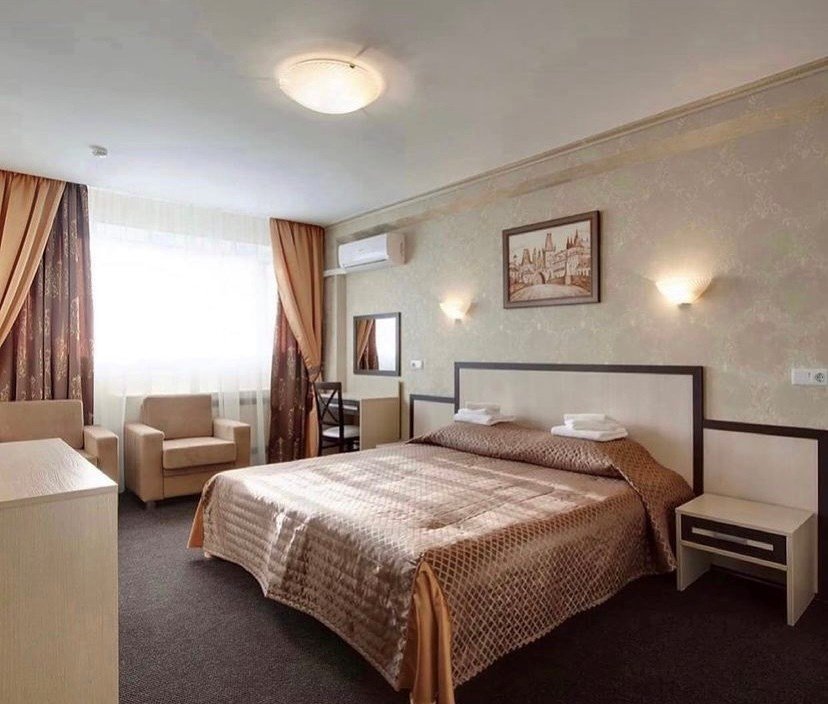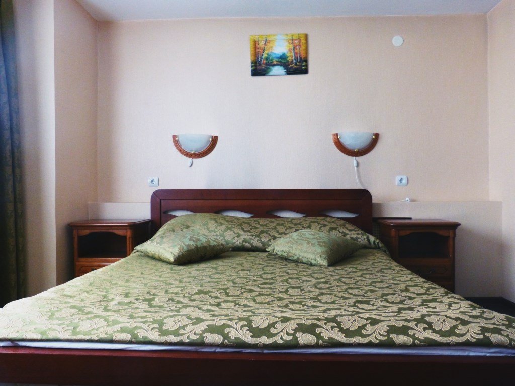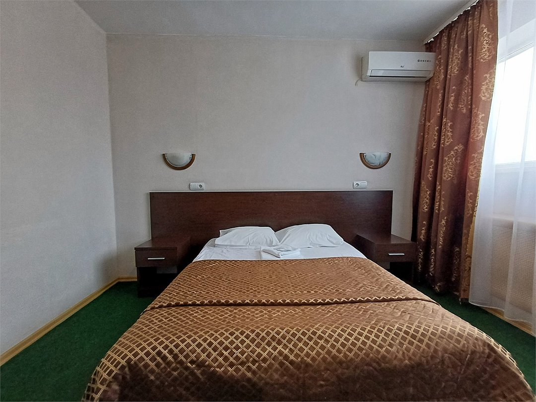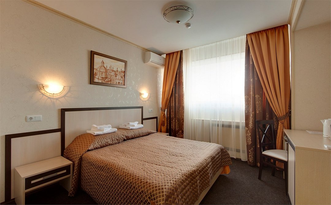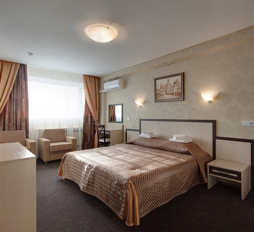 Однокомнатный номер с ванной комнатой. В номере: одна двуспальная, платяной шкаф, прикроватные тумбочки, письменный стол, стулья или мягкое кресло, зеркало, телефон, ТВ, холодильник, чайная пара, набор полотенец и косметических принадлежностей для ванной комнаты.Услуги и удобства
