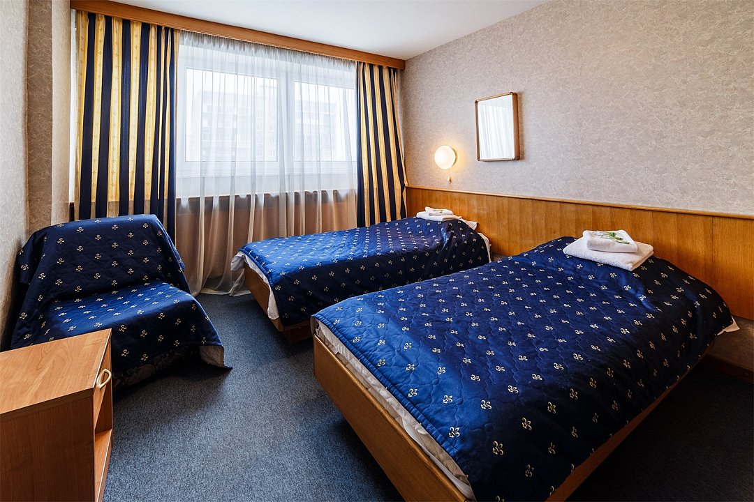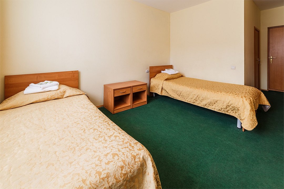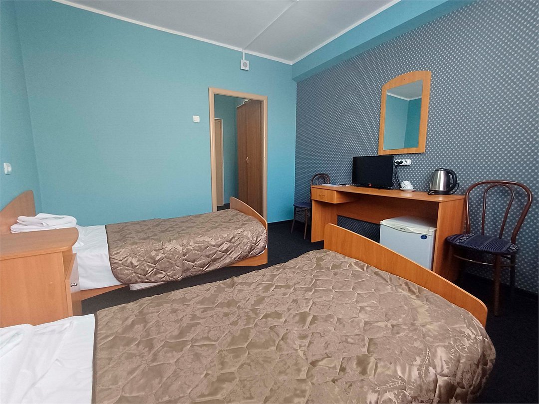 Туалет и ванная комната общая на 2 номера. В номере: три кровати, платяной шкаф, прикроватные тумбочки, письменный стол, стулья или мягкое кресло, зеркало, телефон, ТВ, холодильник, чайная пара, набор полотенец и косметических принадлежностей для ванной комнаты.Услуги и удобства