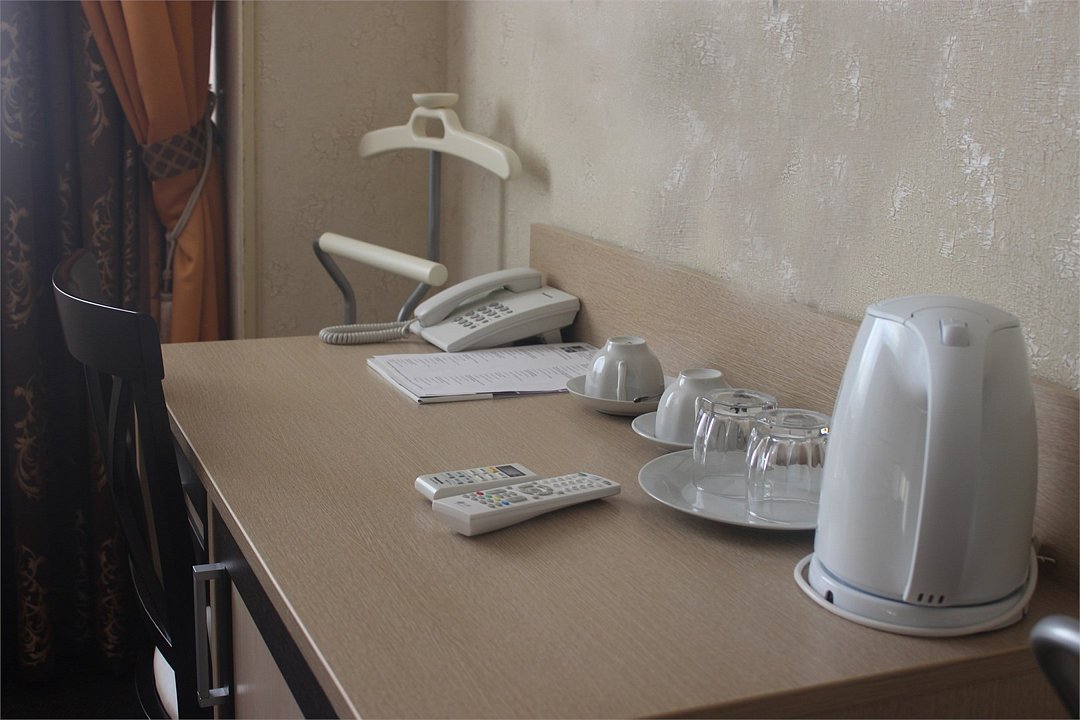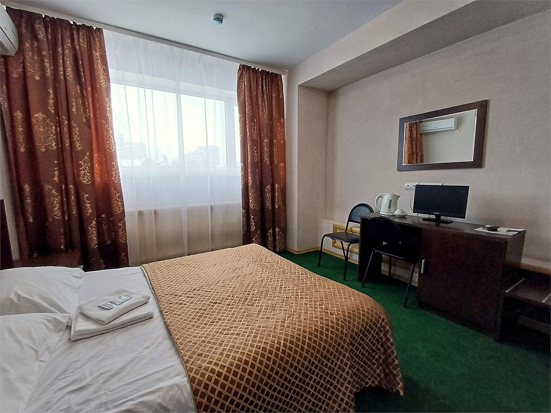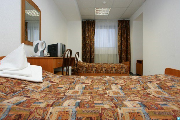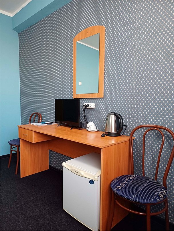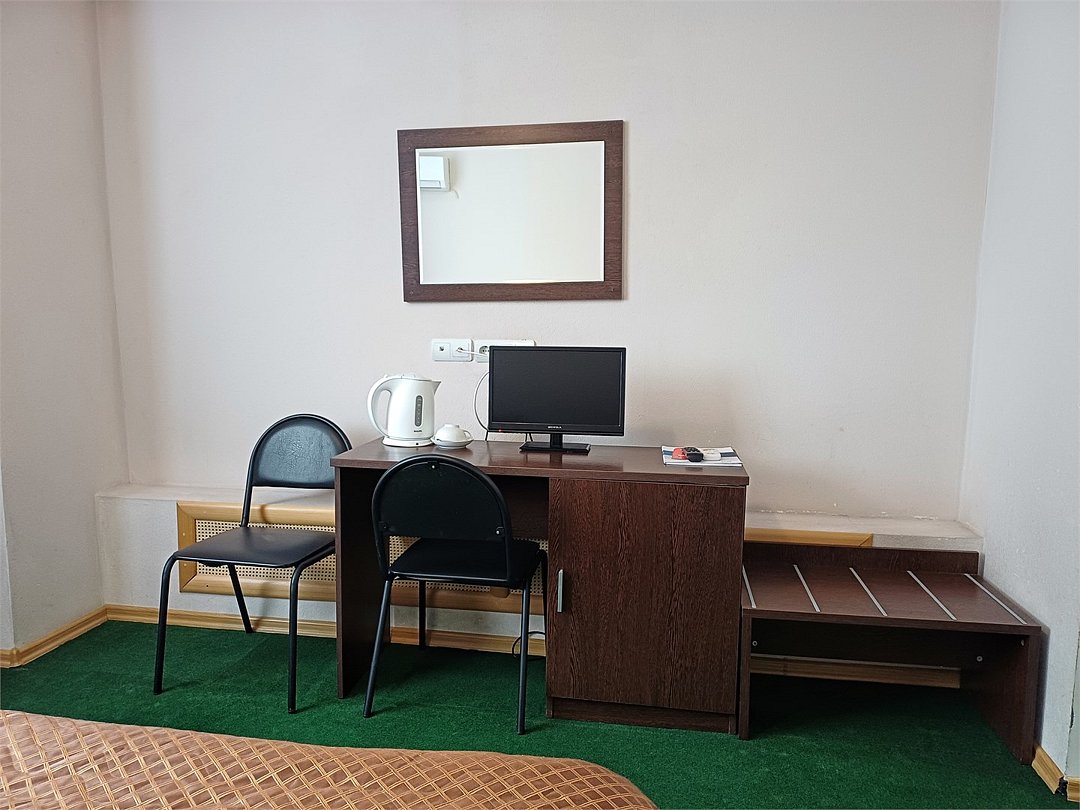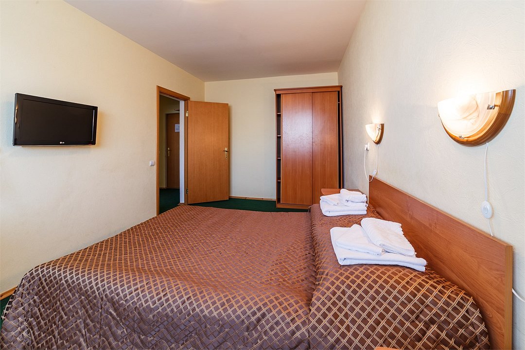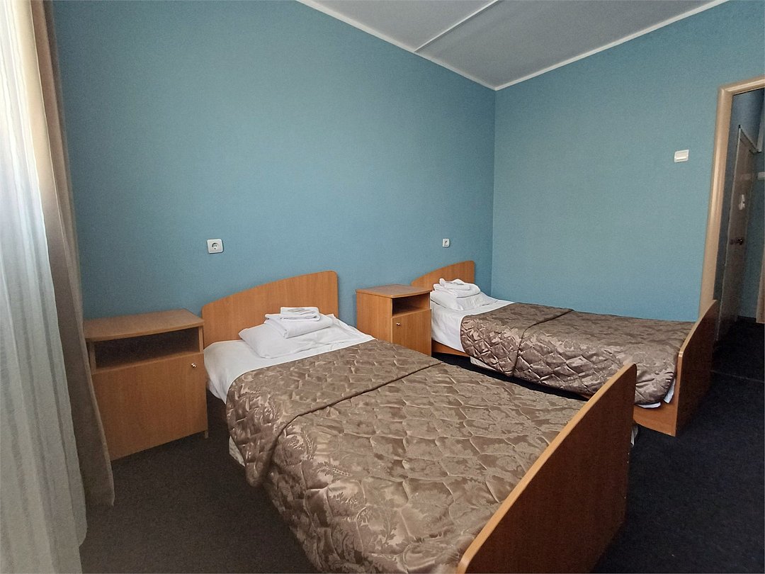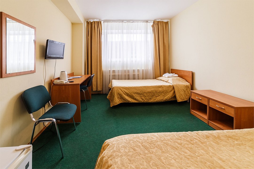 Однокомнатный номер с ванной комнатой. В номере: две кровати, платяной шкаф, прикроватные тумбочки, письменный стол, стулья или мягкое кресло, зеркало, телефон, ТВ, холодильник, чайная пара, набор полотенец и косметических принадлежностей для ванной комнаты.Услуги и удобства