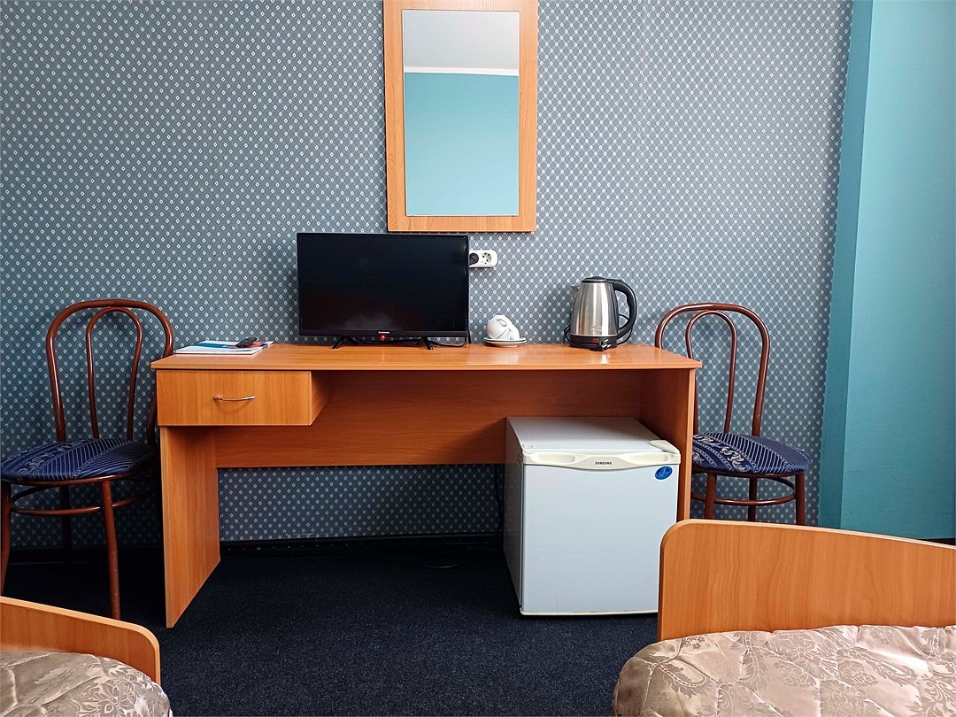 телевизор, Wi-Fi, телефон, холодильник, две односпальные кровати, шкаф для одежды, письменный стол, зеркало, общая ванная комната, стулВ гостиничном номере