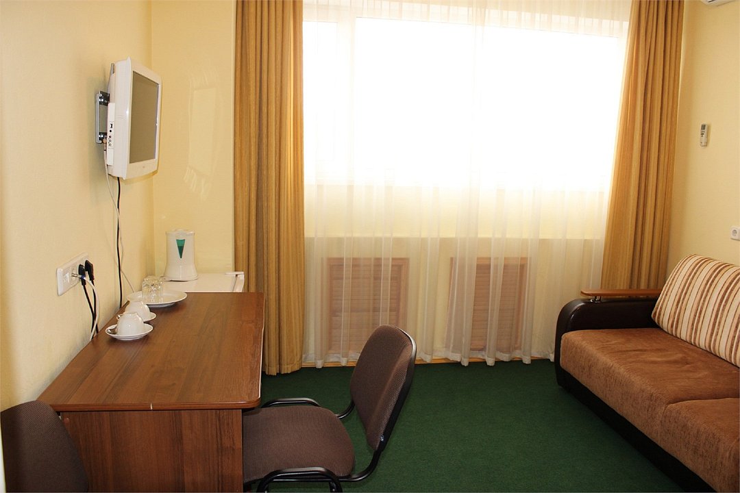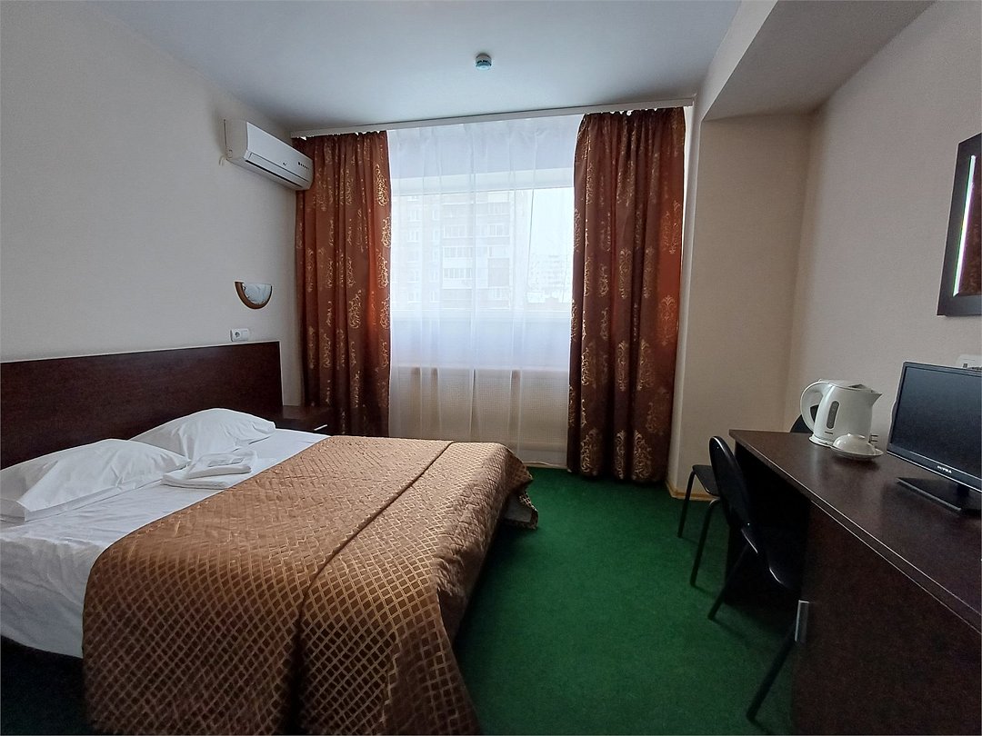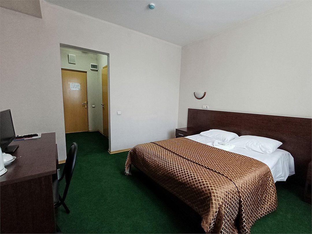 Однокомнатный номер с ванной комнатой. В номере: Одна кровать, платяной шкаф, прикроватные тумбочки, письменный стол, стулья или мягкое кресло, зеркало, телефон, ТВ, холодильник, чайная пара, набор полотенец и косметических принадлежностей для ванной комнаты.Услуги и удобства