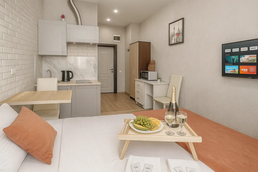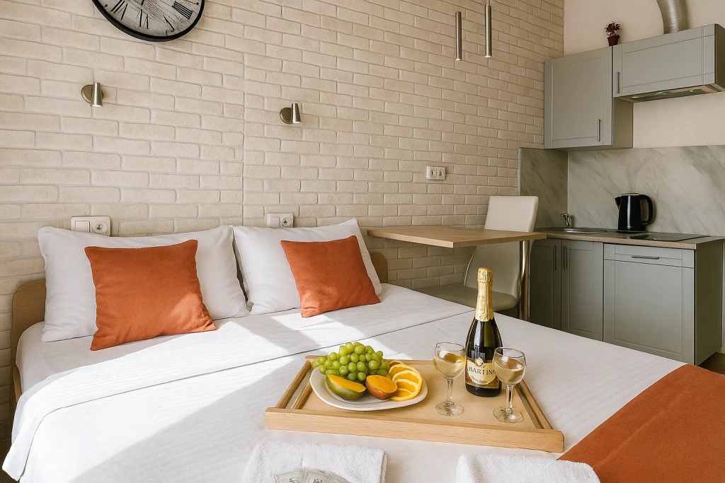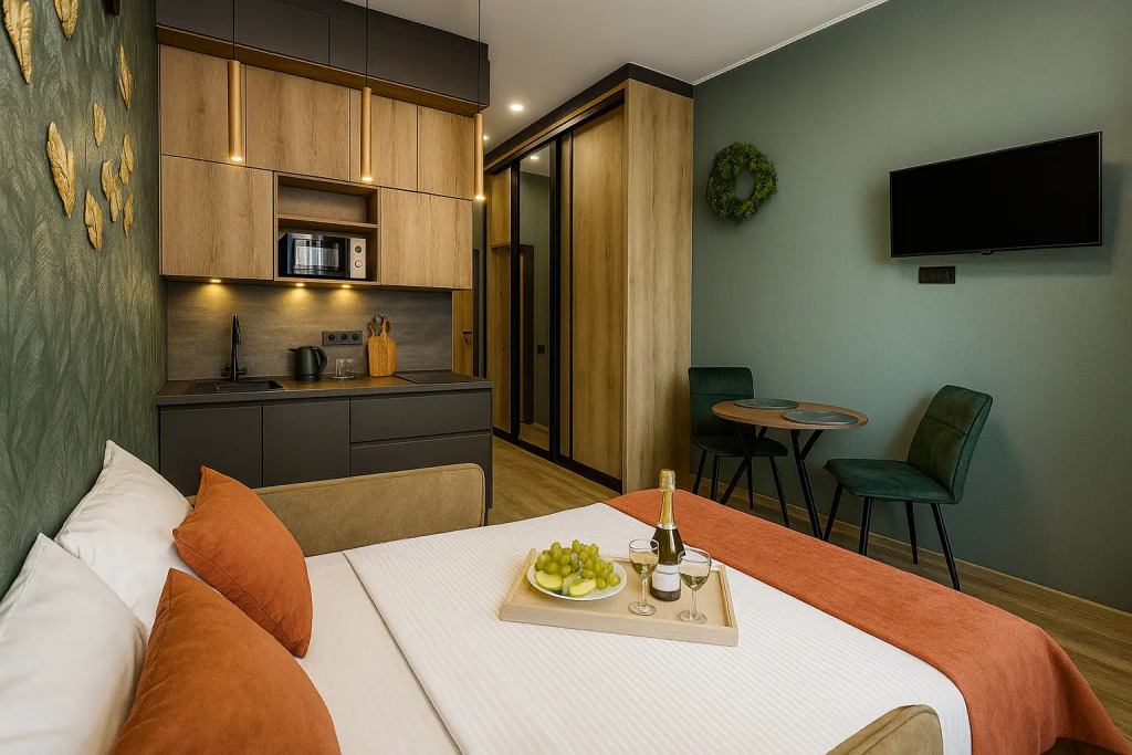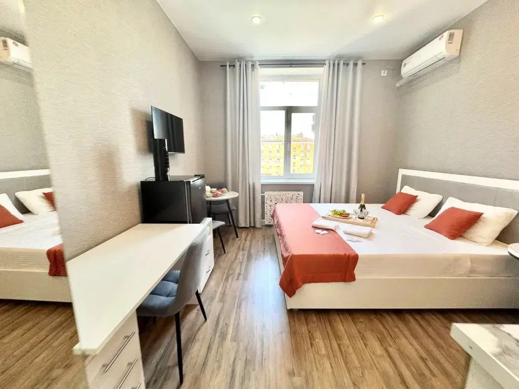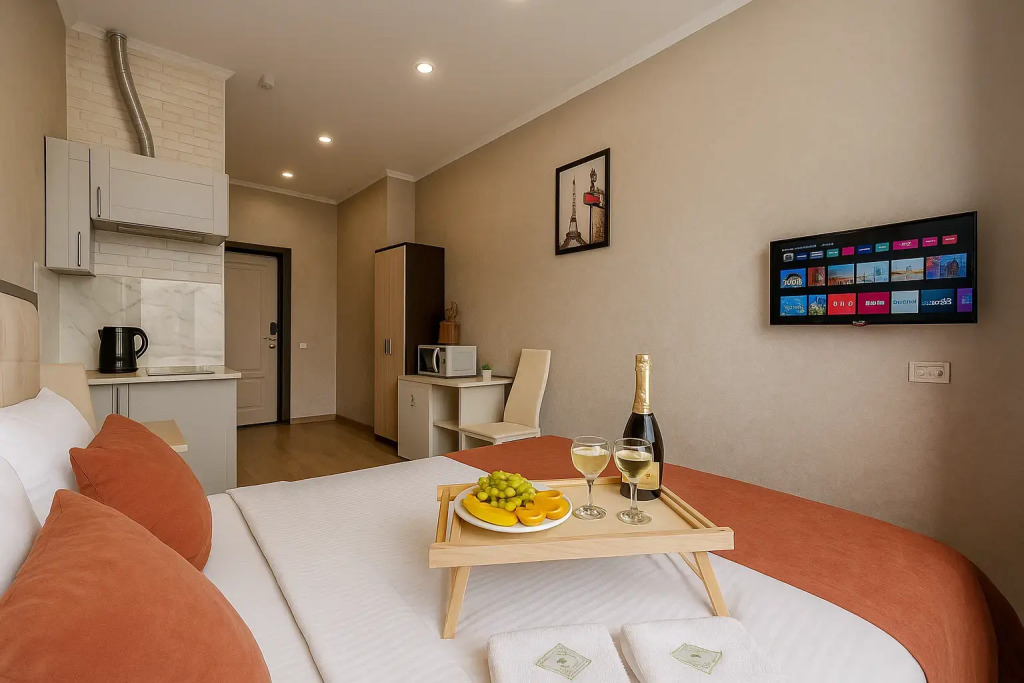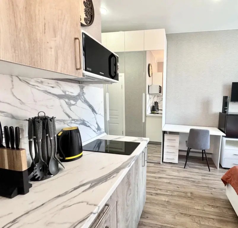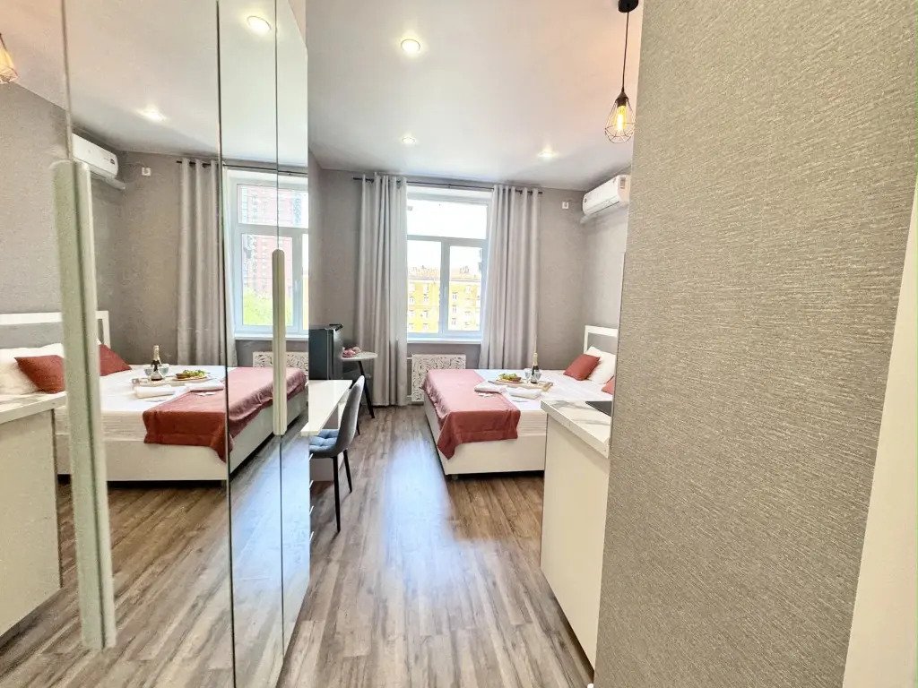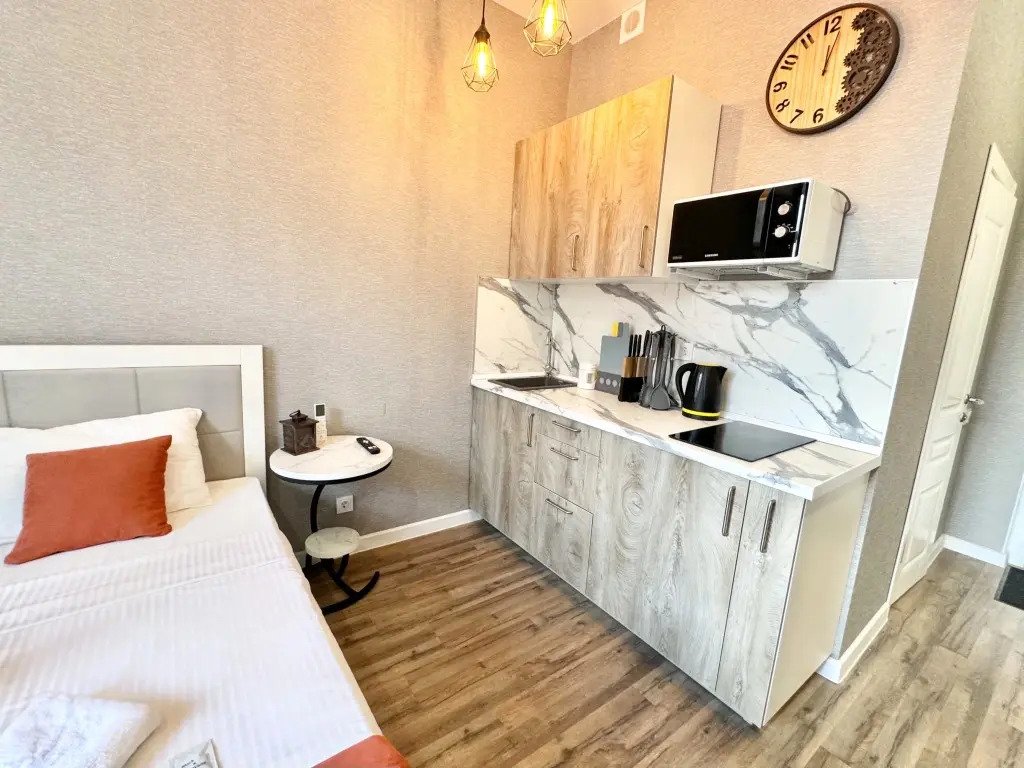 Небольшие студии с дизайнерским ремонтом, где есть всё необходимое для комфортного проживания: бесплатный Wi-Fi, телевизор, плита, холодильник, микроволновка, фен, всё для сервировки стола. Уборка и дезинфекция проводятся после каждого заезда. Размещение подходит как для командированных сотрудников, так и для тех, кто просто хочет отдохнуть в непринужденной обстановке.