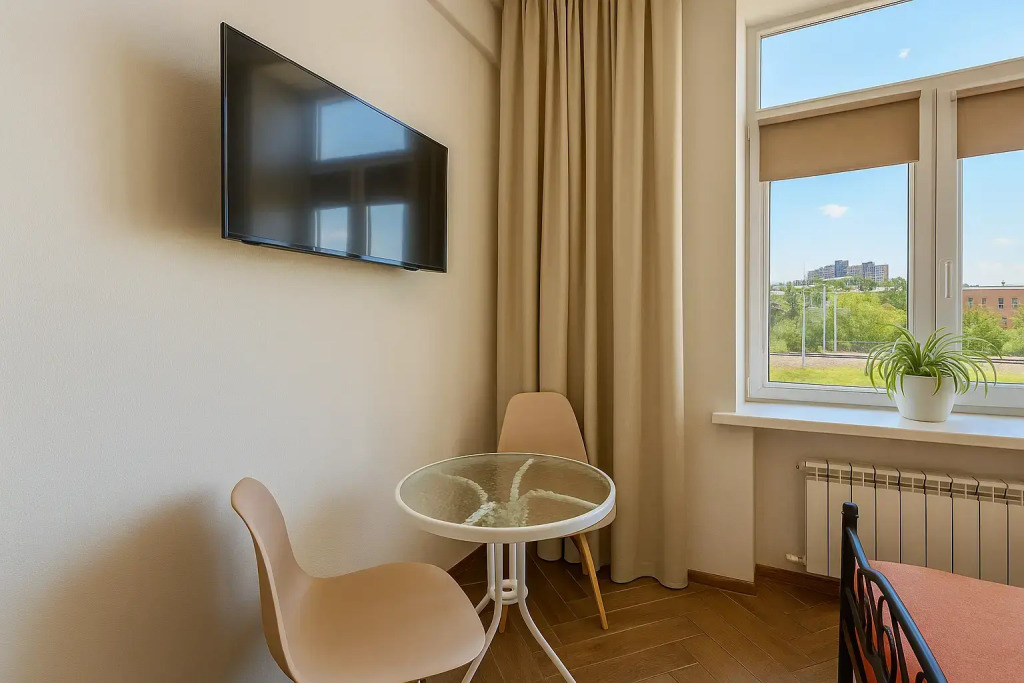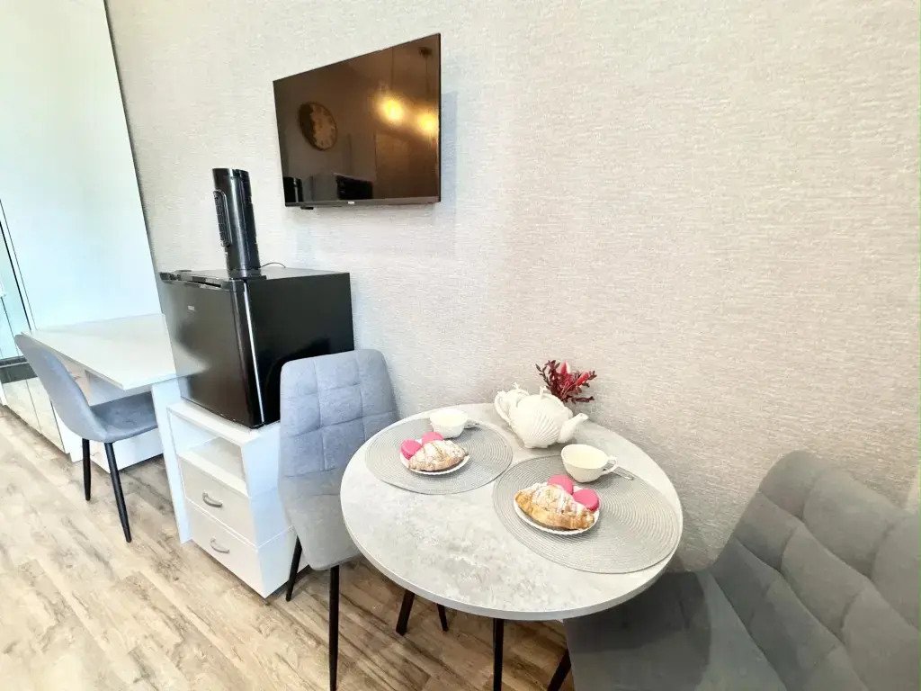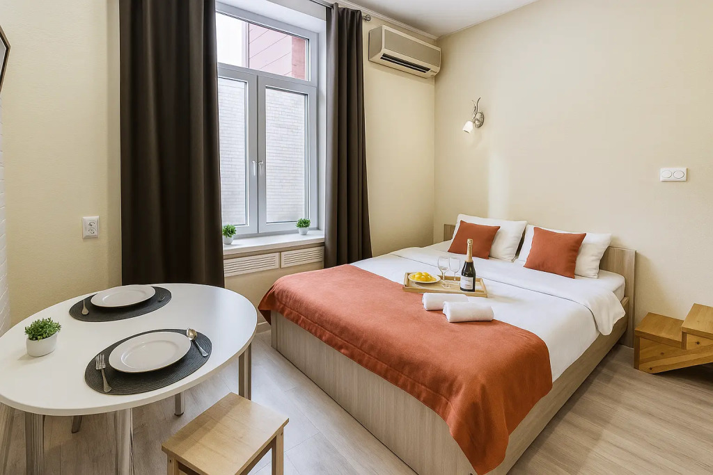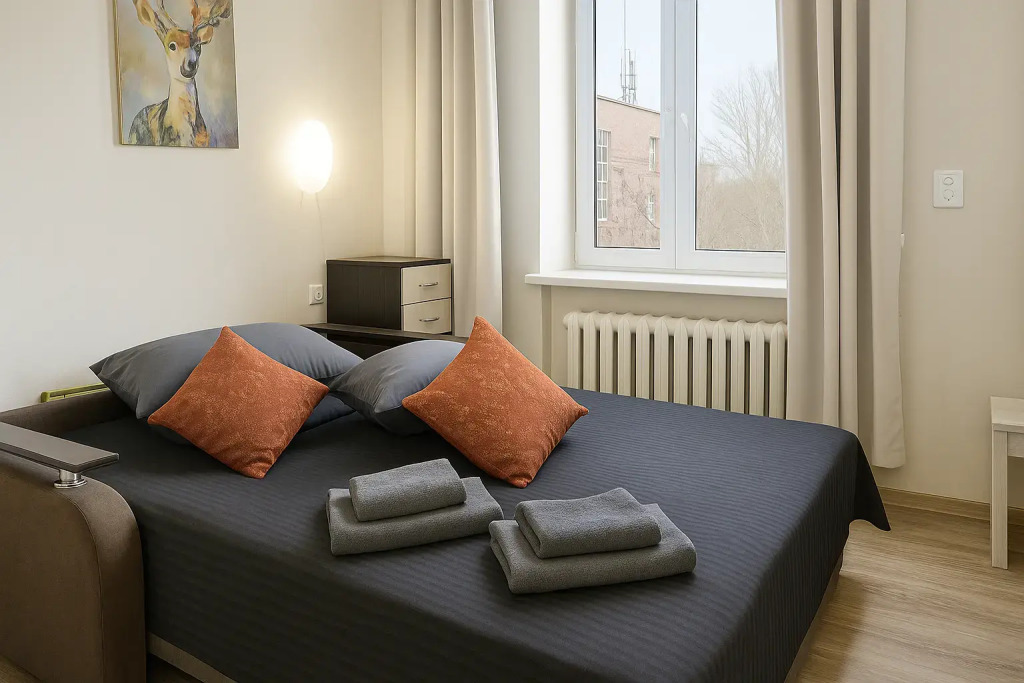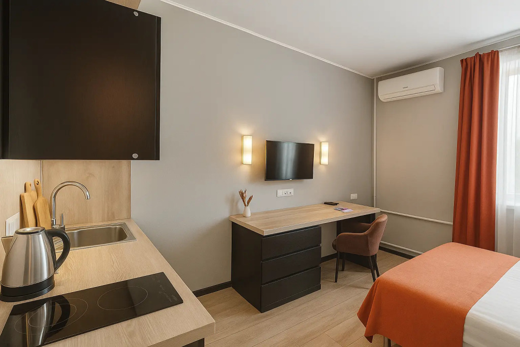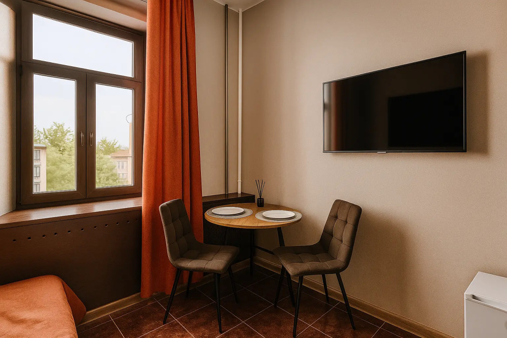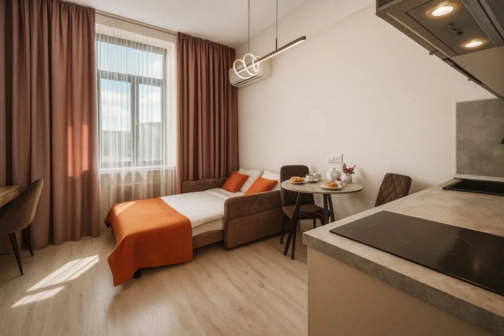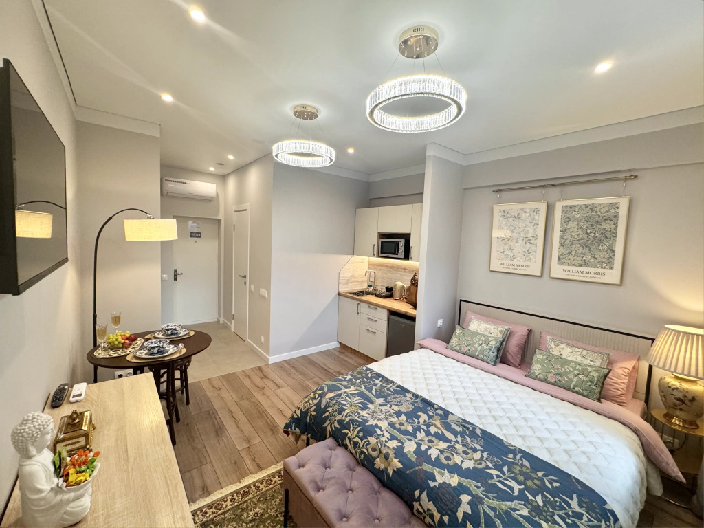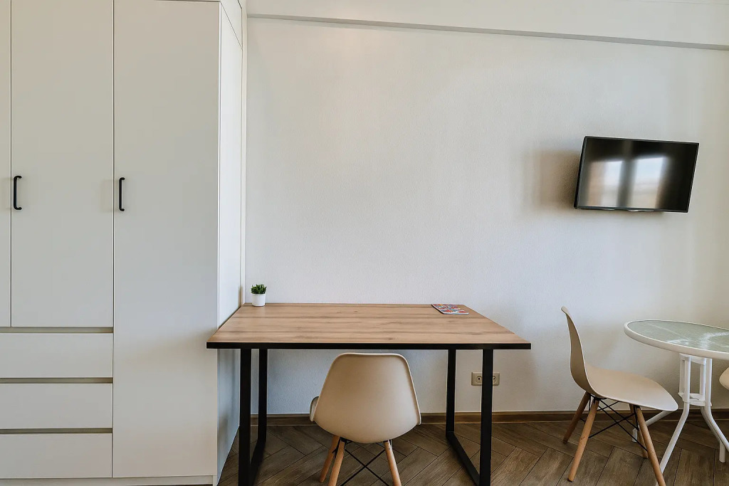 Небольшие студии с дизайнерским ремонтом, где есть всё необходимое для комфортного проживания: бесплатный Wi-Fi, телевизор, плита, холодильник, микроволновка, фен, всё для сервировки стола. Уборка и дезинфекция проводятся после каждого заезда. Размещение подходит как для командированных сотрудников, так и для тех, кто просто хочет отдохнуть в непринужденной обстановке.