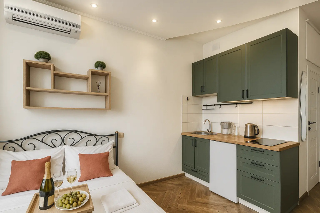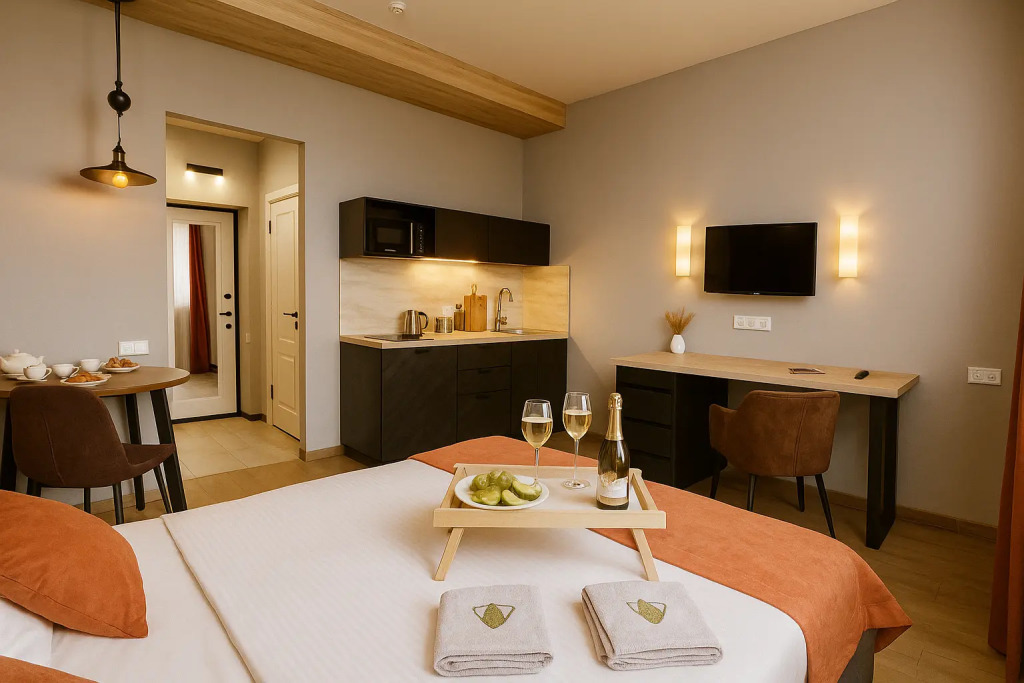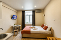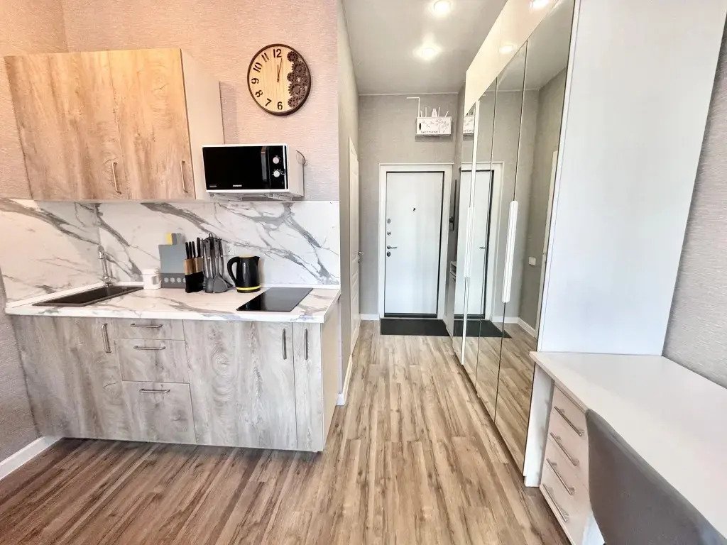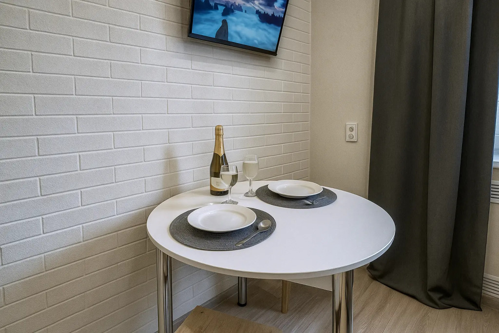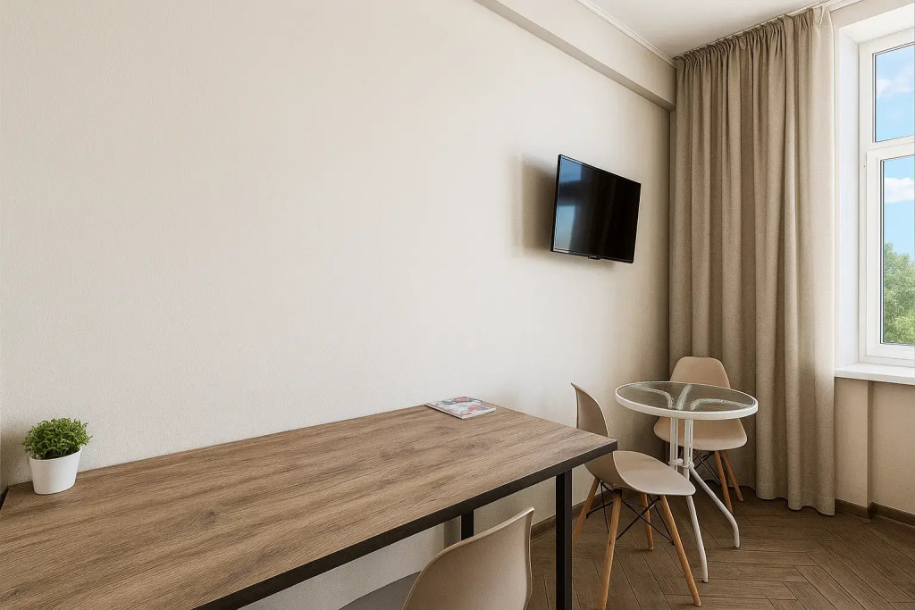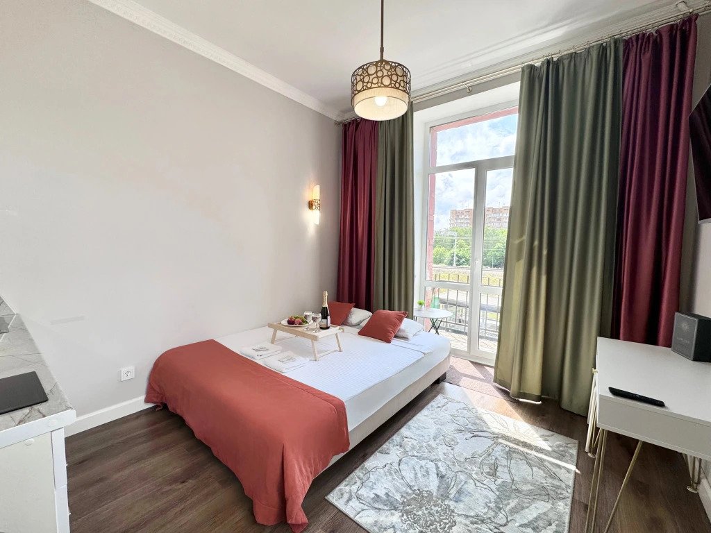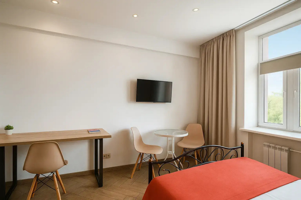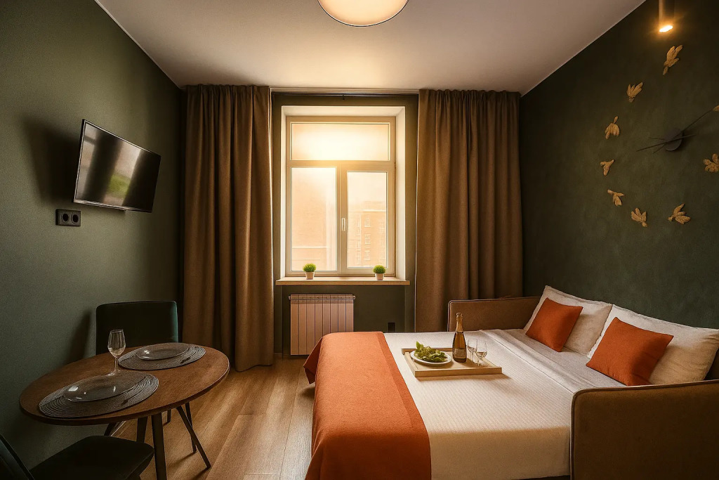 Небольшие студии с дизайнерским ремонтом, где есть всё необходимое для комфортного проживания: бесплатный Wi-Fi, телевизор, плита, холодильник, микроволновка, фен, всё для сервировки стола. Уборка и дезинфекция проводятся после каждого заезда. Размещение подходит как для командированных сотрудников, так и для тех, кто просто хочет отдохнуть в непринужденной обстановке.