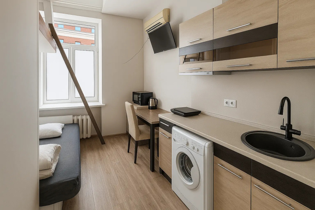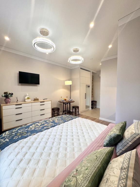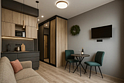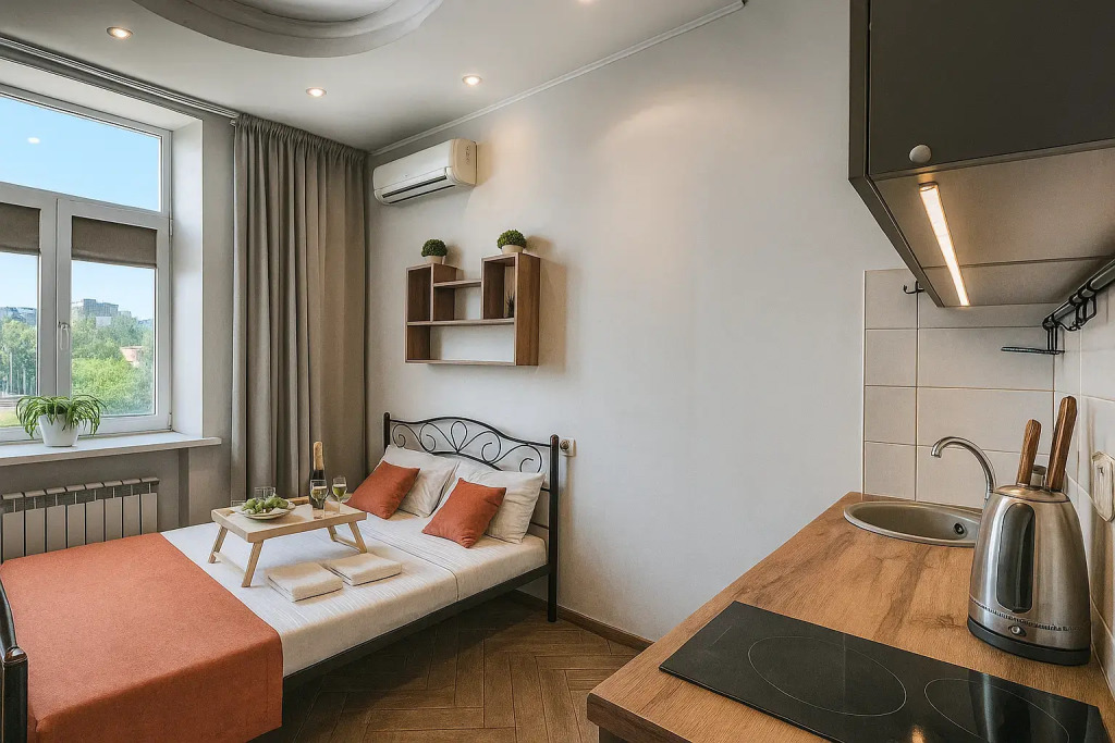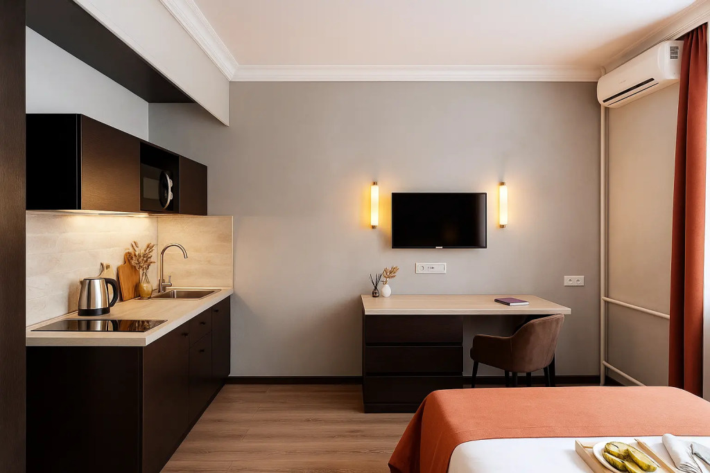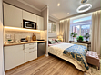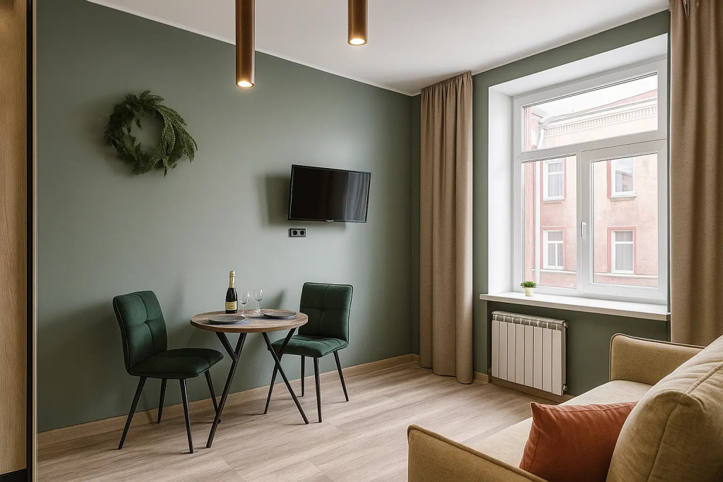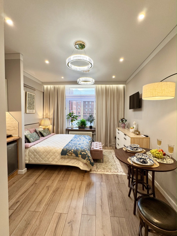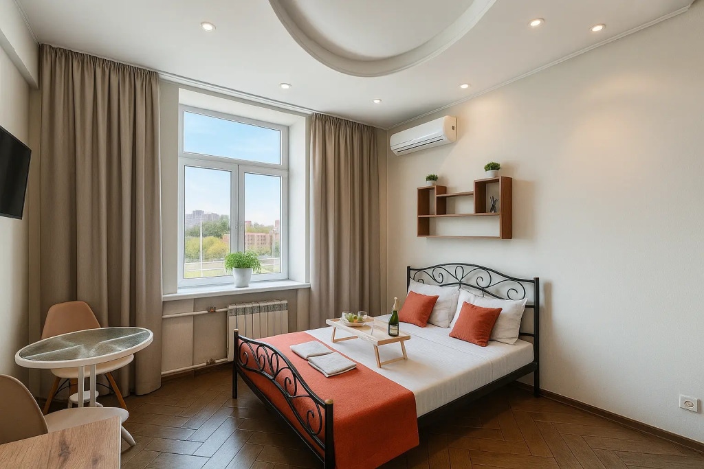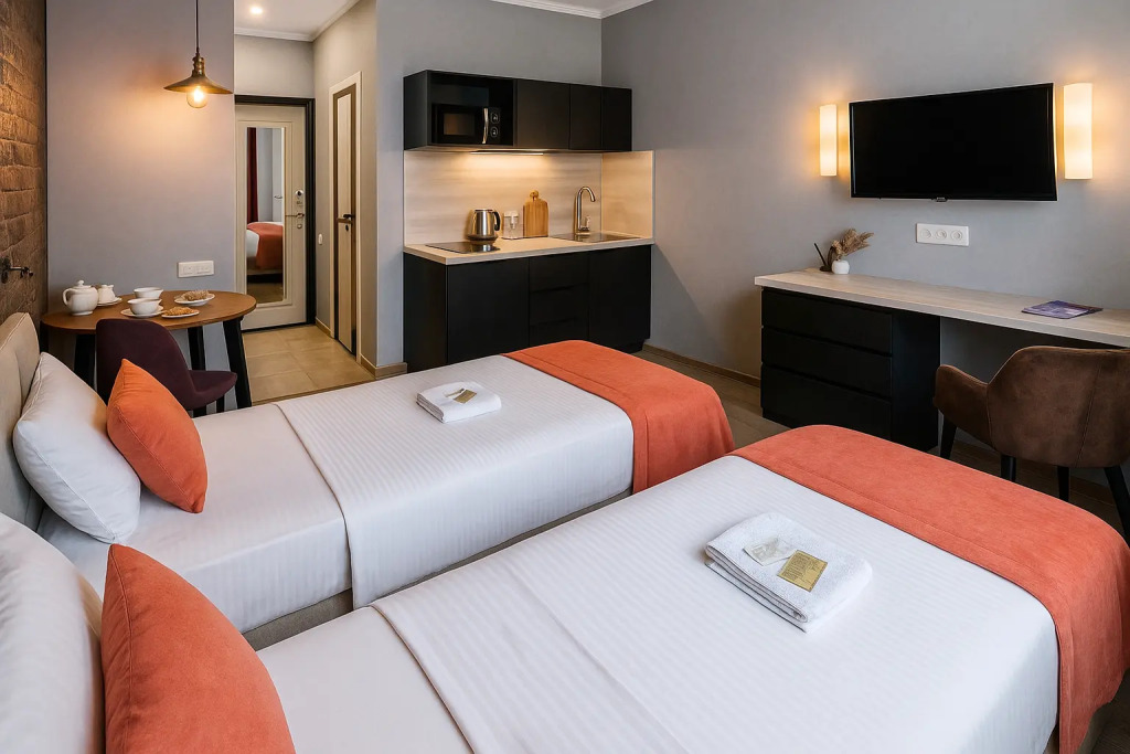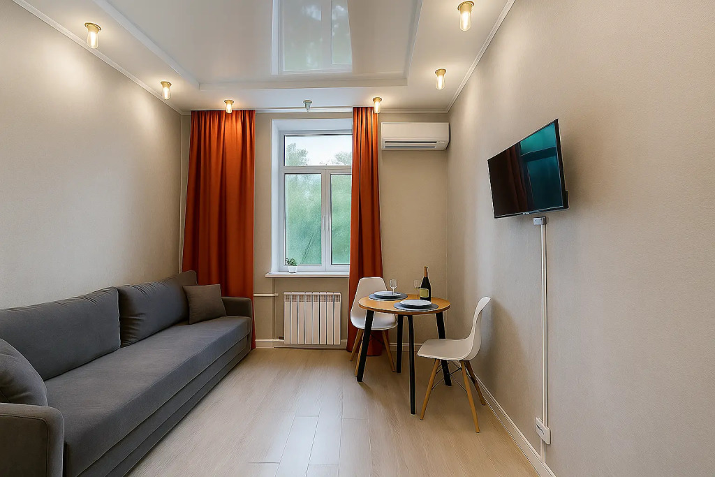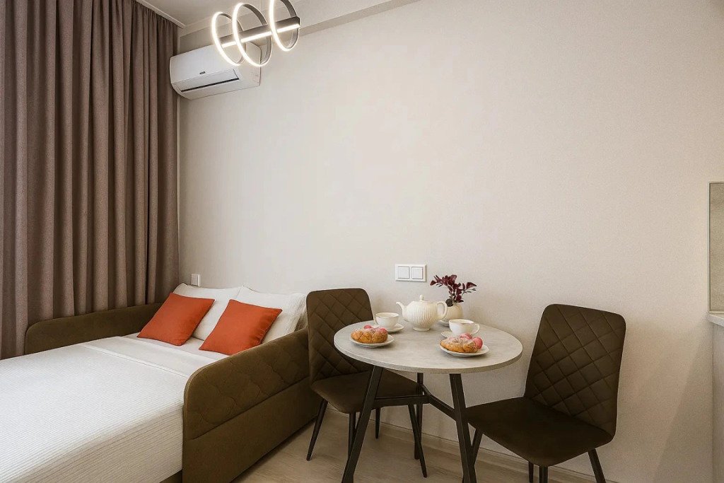 Небольшие студии с дизайнерским ремонтом, где есть всё необходимое для комфортного проживания: бесплатный Wi-Fi, телевизор, плита, холодильник, микроволновка, фен, всё для сервировки стола. Уборка и дезинфекция проводятся после каждого заезда. Размещение подходит как для командированных сотрудников, так и для тех, кто просто хочет отдохнуть в непринужденной обстановке.