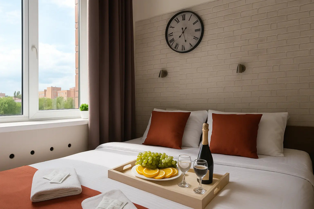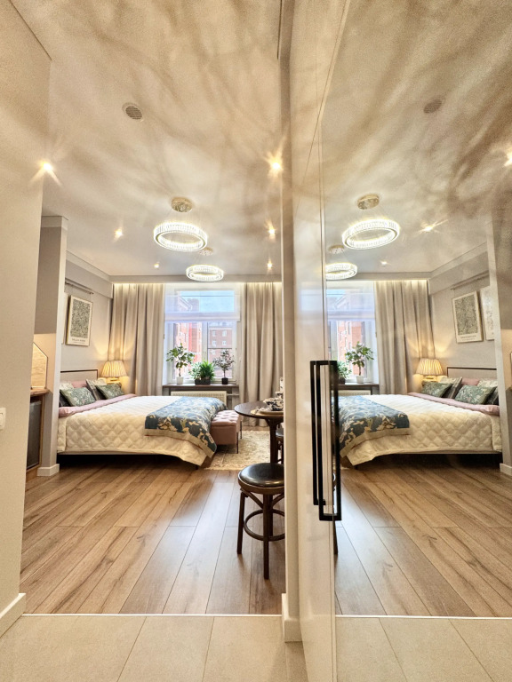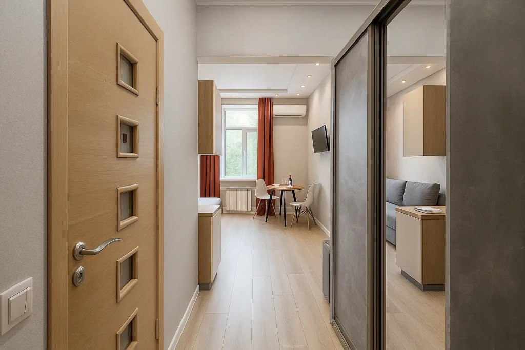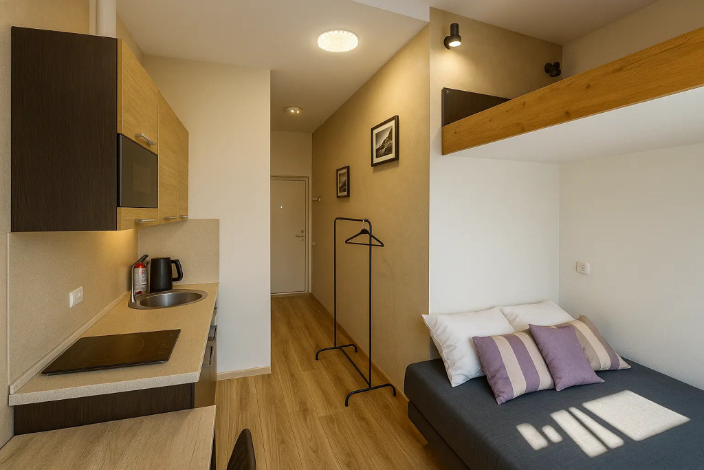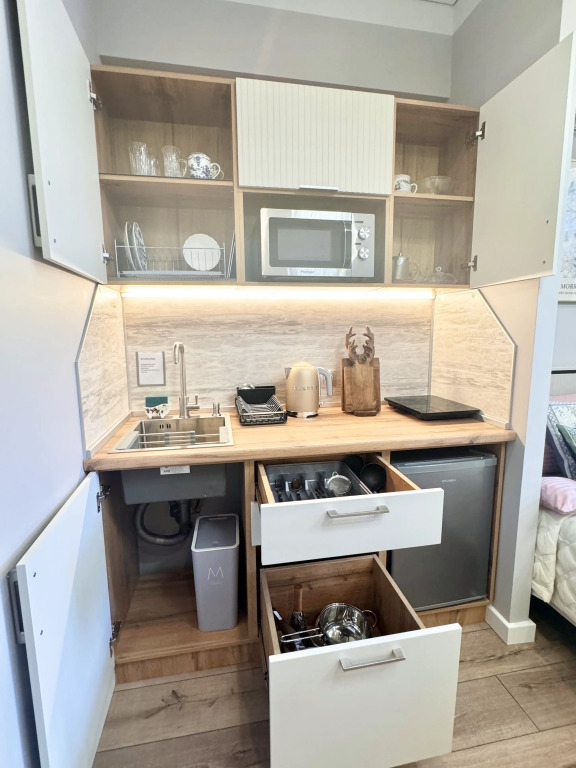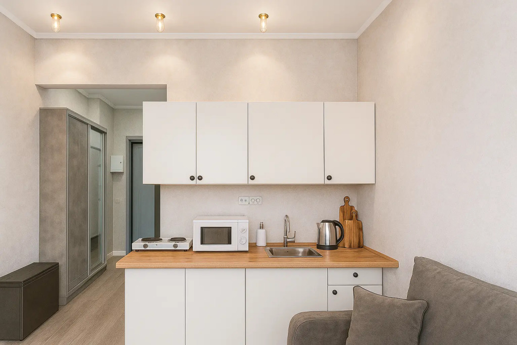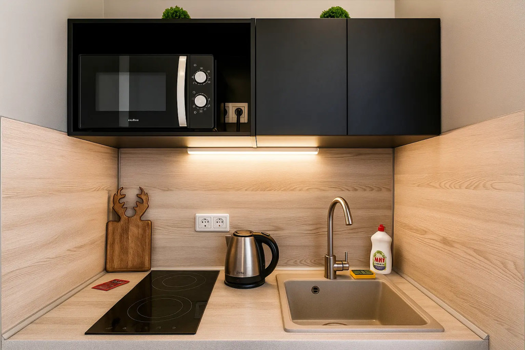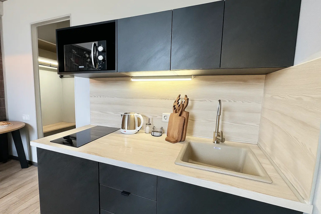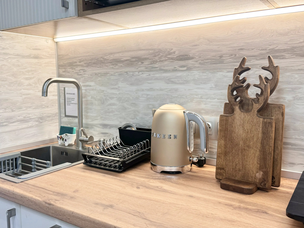 Небольшие студии с дизайнерским ремонтом, где есть всё необходимое для комфортного проживания: бесплатный Wi-Fi, телевизор, плита, холодильник, микроволновка, фен, всё для сервировки стола. Уборка и дезинфекция проводятся после каждого заезда. Размещение подходит как для командированных сотрудников, так и для тех, кто просто хочет отдохнуть в непринужденной обстановке.