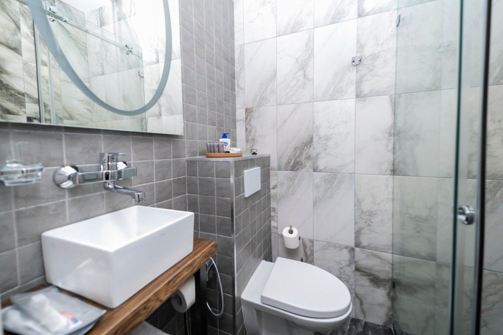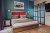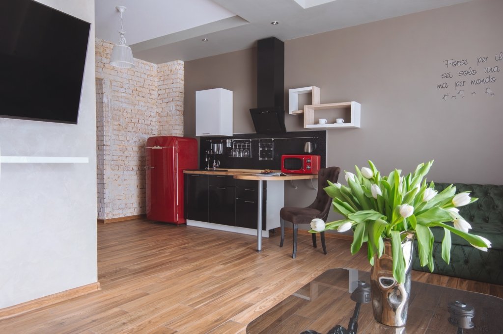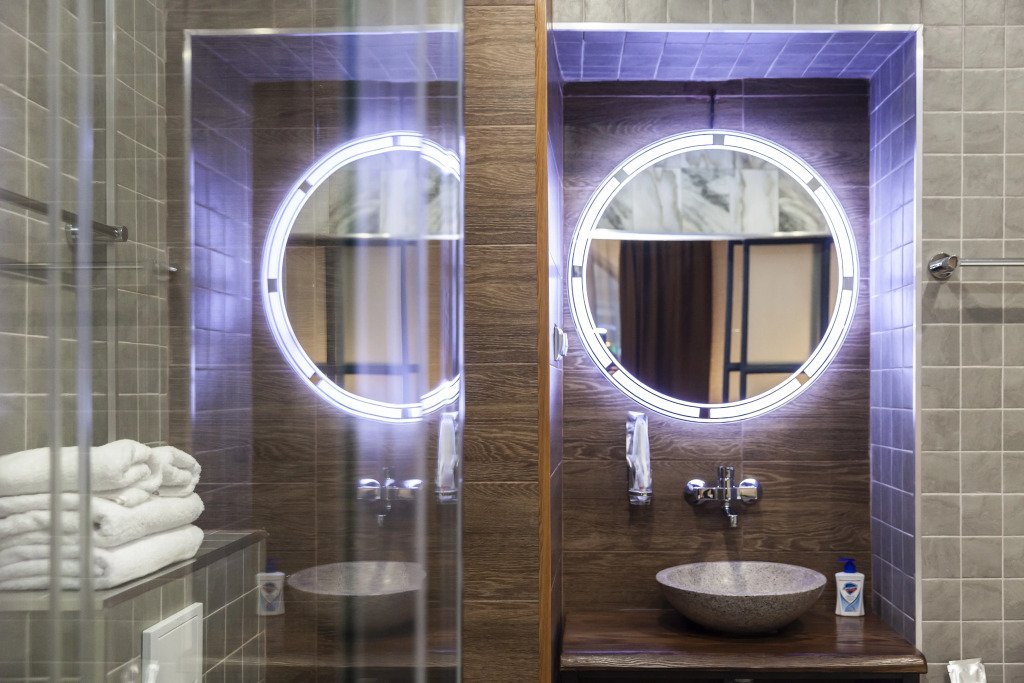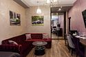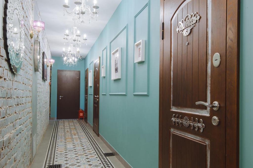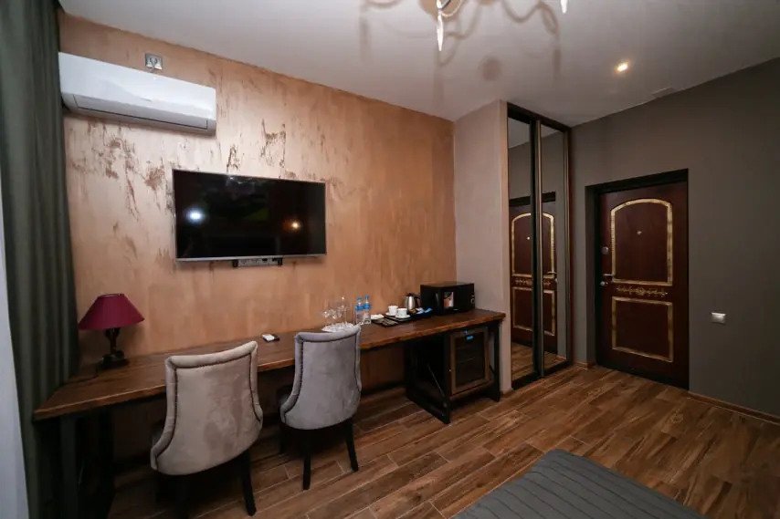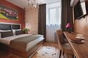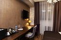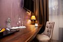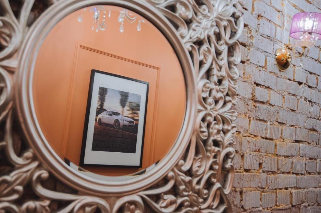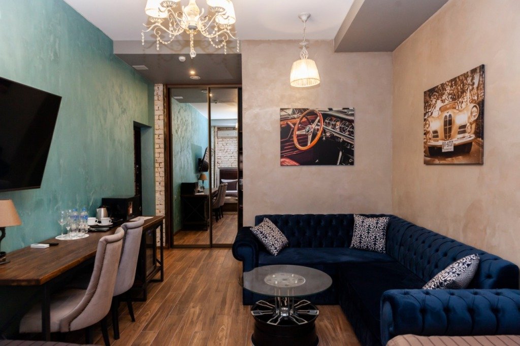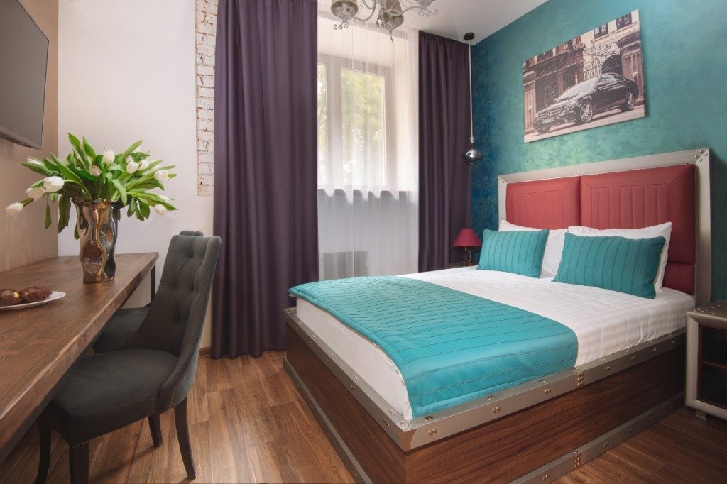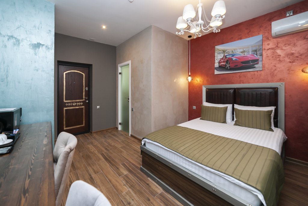 В номерах — большие арочные окна в пол и деревянные подоконники. Большая часть мебели отеля изготавливалась по специальному заказу не в России. Кровати индивидуального дизайна с изголовьем из натуральной кожи напоминают салоны машин. Настоящие детали автомобилей вписаны в дизайн журнального столика или даже торшера. Дизайнер смешал элементы лофта, современных материалов, ярких «шиковых» акцентных цветов в отделке стен и обивке диванов.