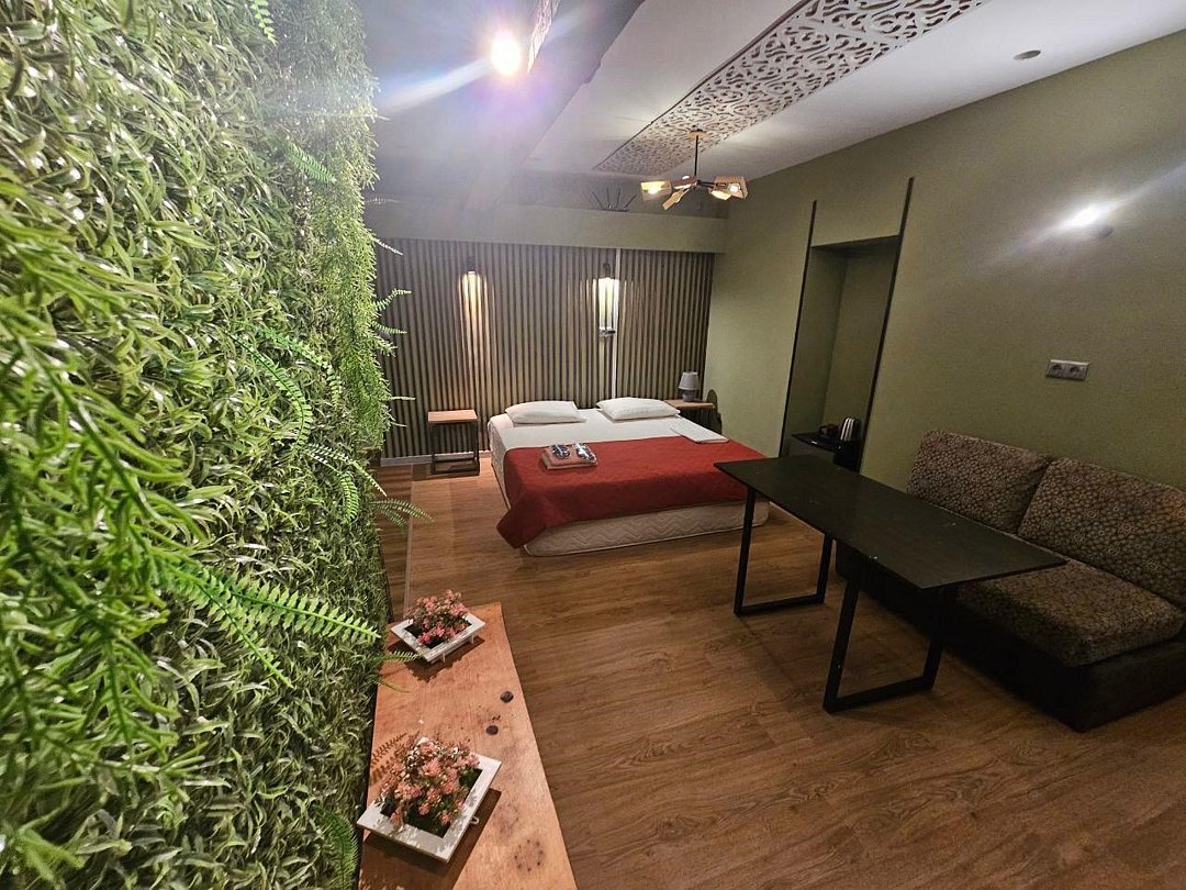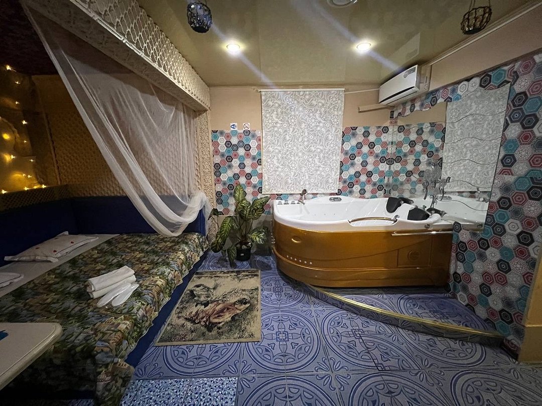 караоке, Wi-Fi, кондиционер, светильник, фен, обогреватель, банные принадлежности, халаты, банные полотенца, тапочки, сауна, кровать «King size», вешалки, зеркало, унитаз, душ, кулер на этаже, плиточное покрытие, кресло, вид во двор, стол, тумба, туалет, сплит-система, цифровое тв, москитная сетка, телевизор со Smart TV, номер для некурящих, пуфик, джакузиВ номере