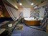 караоке, Wi-Fi, кондиционер, светильник, фен, обогреватель, банные принадлежности, халаты, банные полотенца, тапочки, сауна, кровать «King size», вешалки, зеркало, унитаз, душ, кулер на этаже, плиточное покрытие, кресло, вид во двор, стол, тумба, туалет, сплит-система, цифровое тв, москитная сетка, телевизор со Smart TV, номер для некурящих, пуфик, джакузиВ гостиничном номере