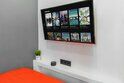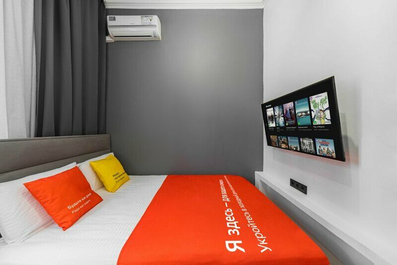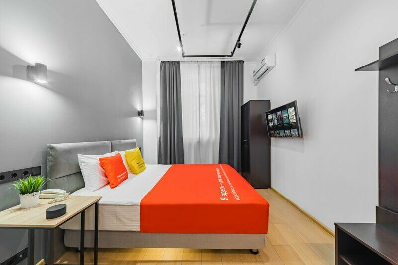 Есть всё необходимое из техники: электрочайник, кондиционер, телевизор с большим экраном, мини-холодильник, и даже яндекс-колонка (вроде бы ничего не упустила, и не помню, есть ли фен в ванной)