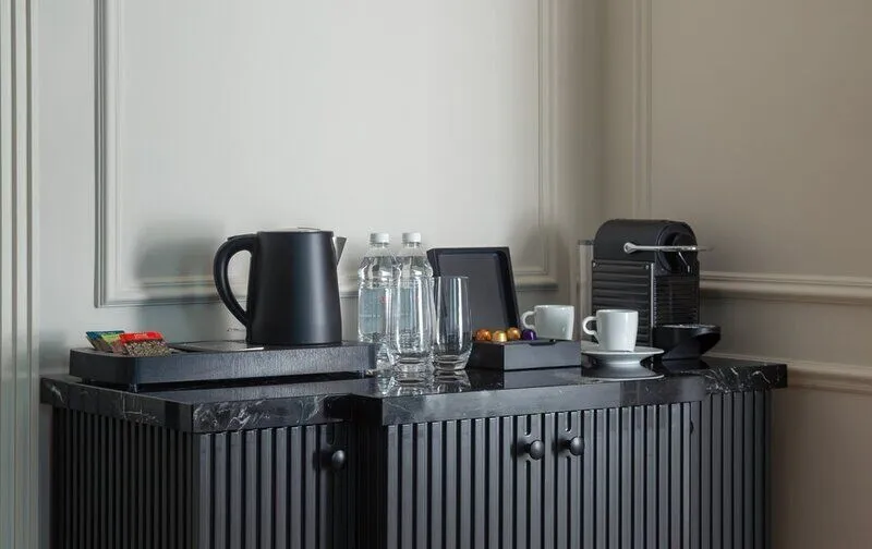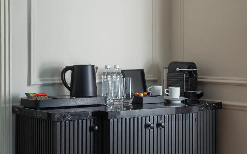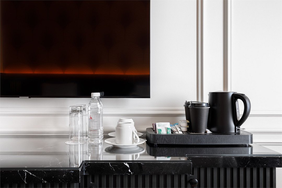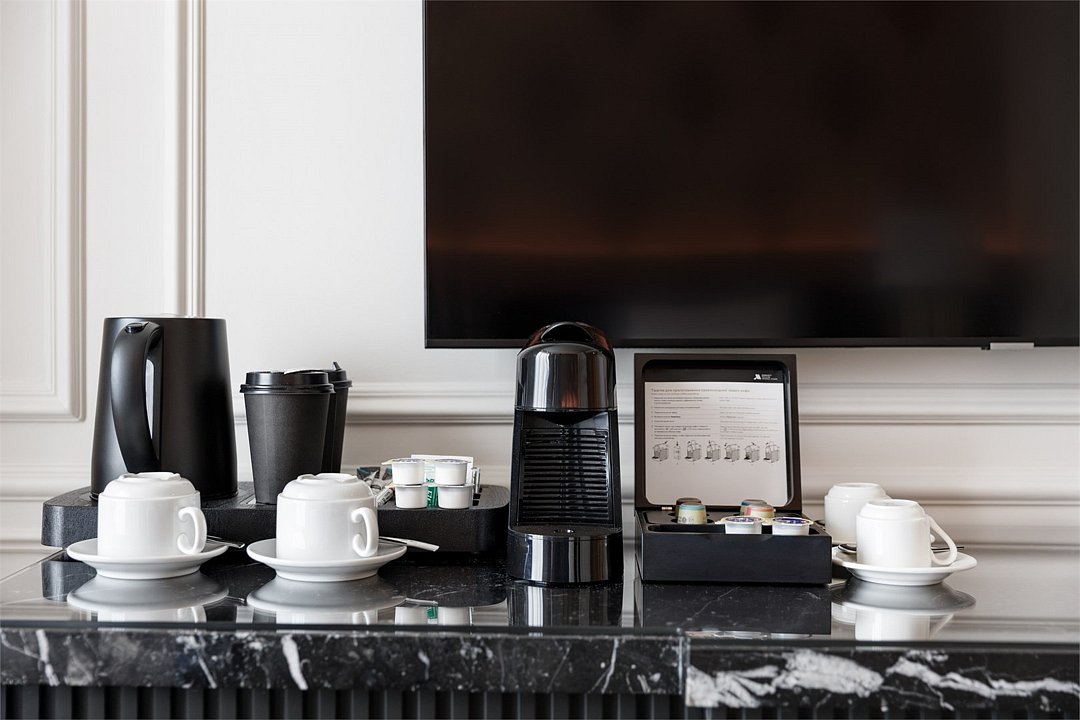 Wi-Fi, интернет, телефон, кондиционер, светильник, фен, будильник, электронные замки, кофемашина, утюг, ванная комната, душевая кабина, биде, теплый пол, халаты, банные полотенца, тапочки, гигиенические средства, косметические средства, кровать «King size», гладильная доска, шкаф для одежды, вешалки, багажная тумба, зеркало, чайный набор, обслуживание номеров, сейф, чайник, раковина, косметическое зеркало, питьевая вода, гостиная зона, отопление, вид на город, кресло, ламинат, стаканы, туалетный столик, стол, туалетный столик, туалетные средства, сплит-система, диван-кровать, внутренний телефон, телевизор с плоским экраном, гостиничная парфюмерия, номер для некурящих, чайная станция, мини-бар (платно), можно с питомцами, лежанка, мискаВ гостиничном номере