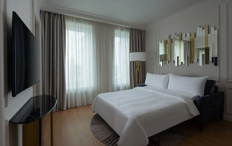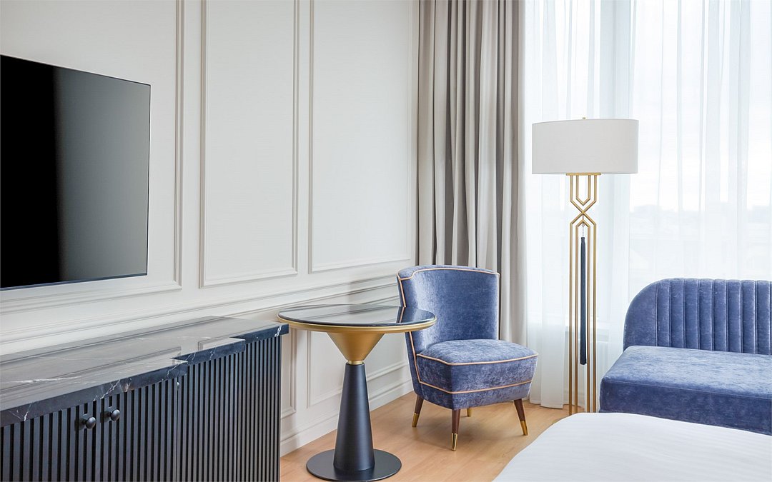 Wi-Fi, интернет, телефон, кондиционер, светильник, фен, будильник, электронные замки, кофемашина, утюг, ванная комната, душевая кабина, ванна, биде, теплый пол, халаты, банные полотенца, тапочки, гигиенические средства, косметические средства, кровать «King size», гладильная доска, шкаф для одежды, вешалки, багажная тумба, зеркало, обслуживание номеров, сейф, чайник, косметическое зеркало, питьевая вода, гостиная зона, отопление, вид на город, кресло, ламинат, стаканы, туалетный столик, стол, туалетный столик, туалетные средства, сплит-система, диван-кровать, внутренний телефон, телевизор с плоским экраном, гостиничная парфюмерия, номер для некурящих, набор для приготовления чая и кофе, мини-бар (платно), можно с питомцами, лежанка, мискаВ гостиничном номере